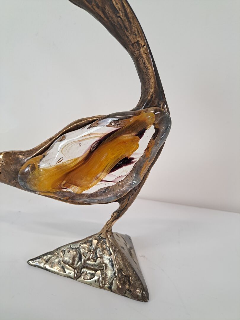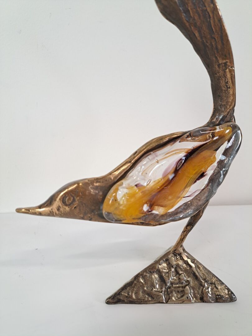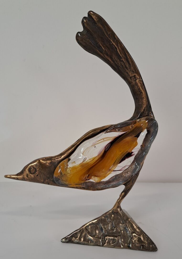 LOHE Yves (1947) - Sparrow - Sculpture in gilded bronze and coloured glass paste, signed on the base - Height: 23 cm