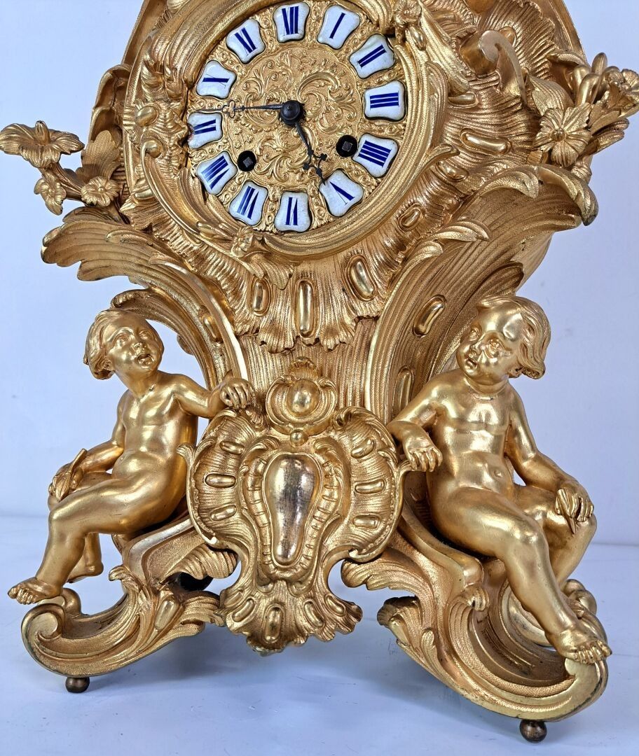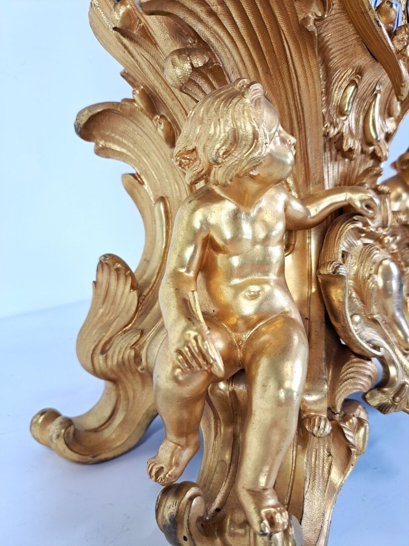 Richly carved gilt bronze cartel clock in the Louis XV style, two children supporting a Rocaille motif, dial with gilt background and enamelled cartouches - Work of the 19th century - H: 48 cm