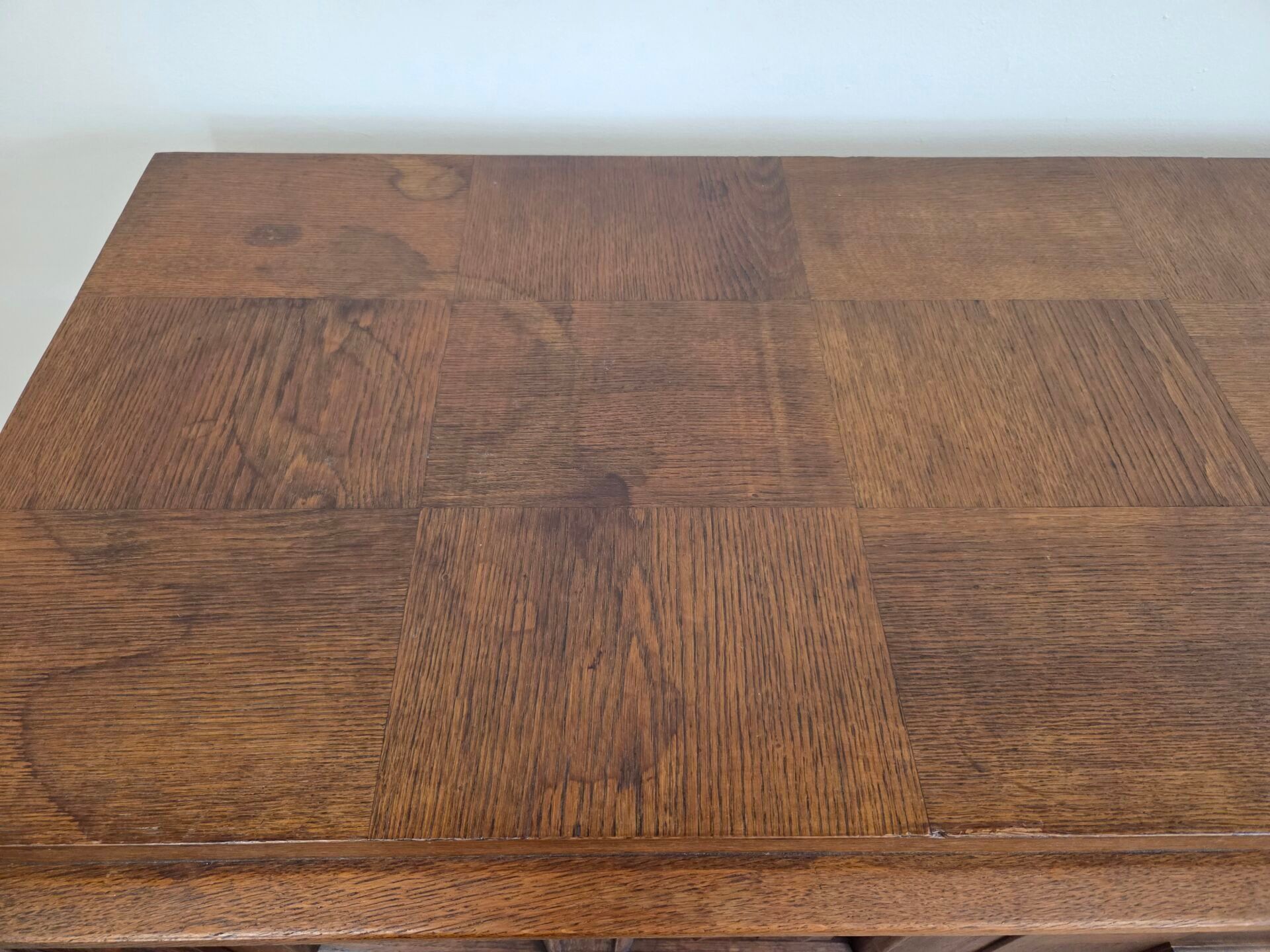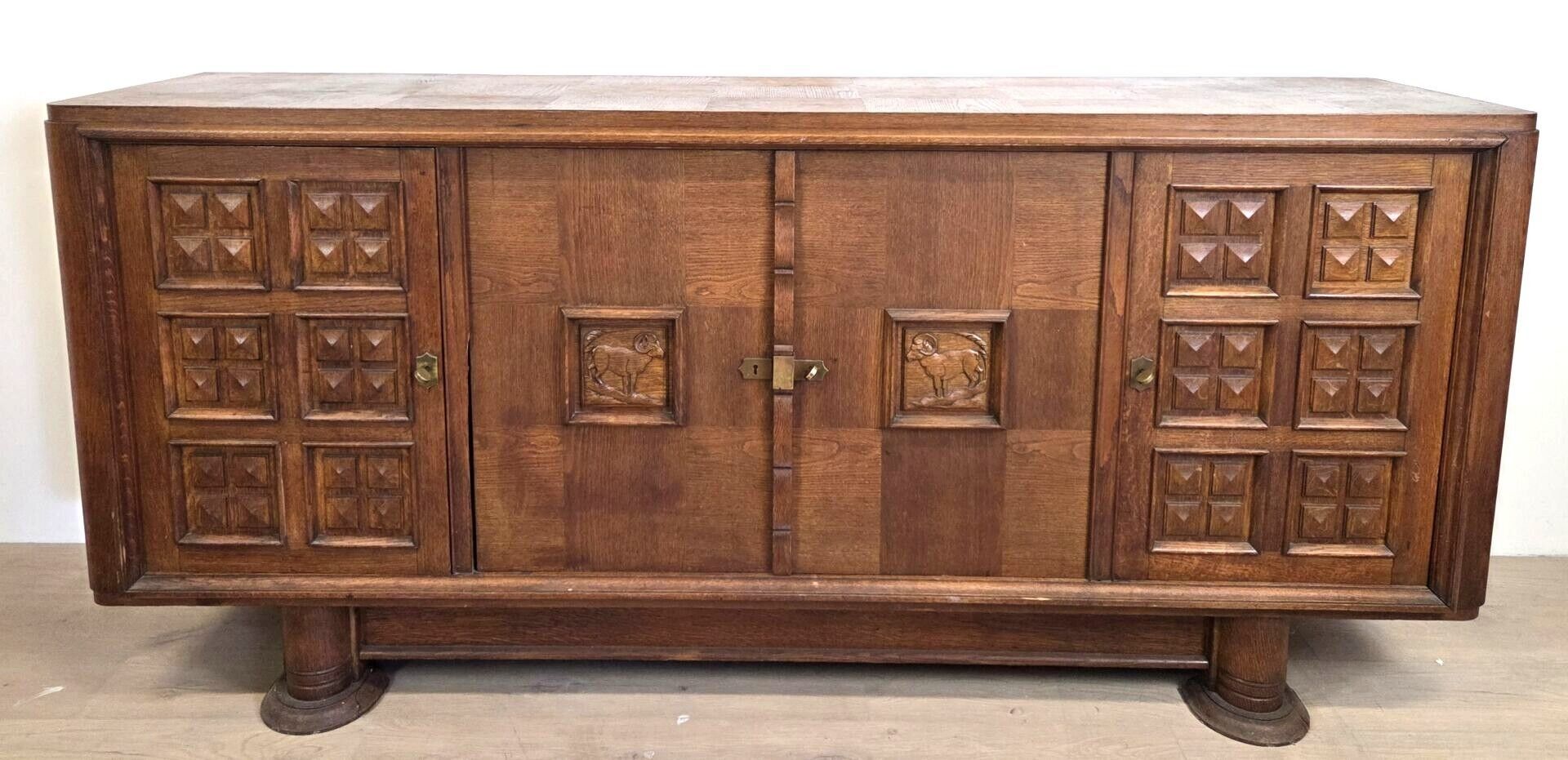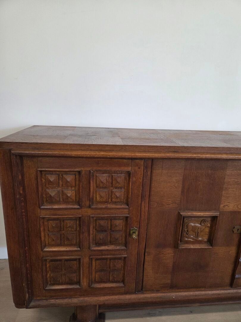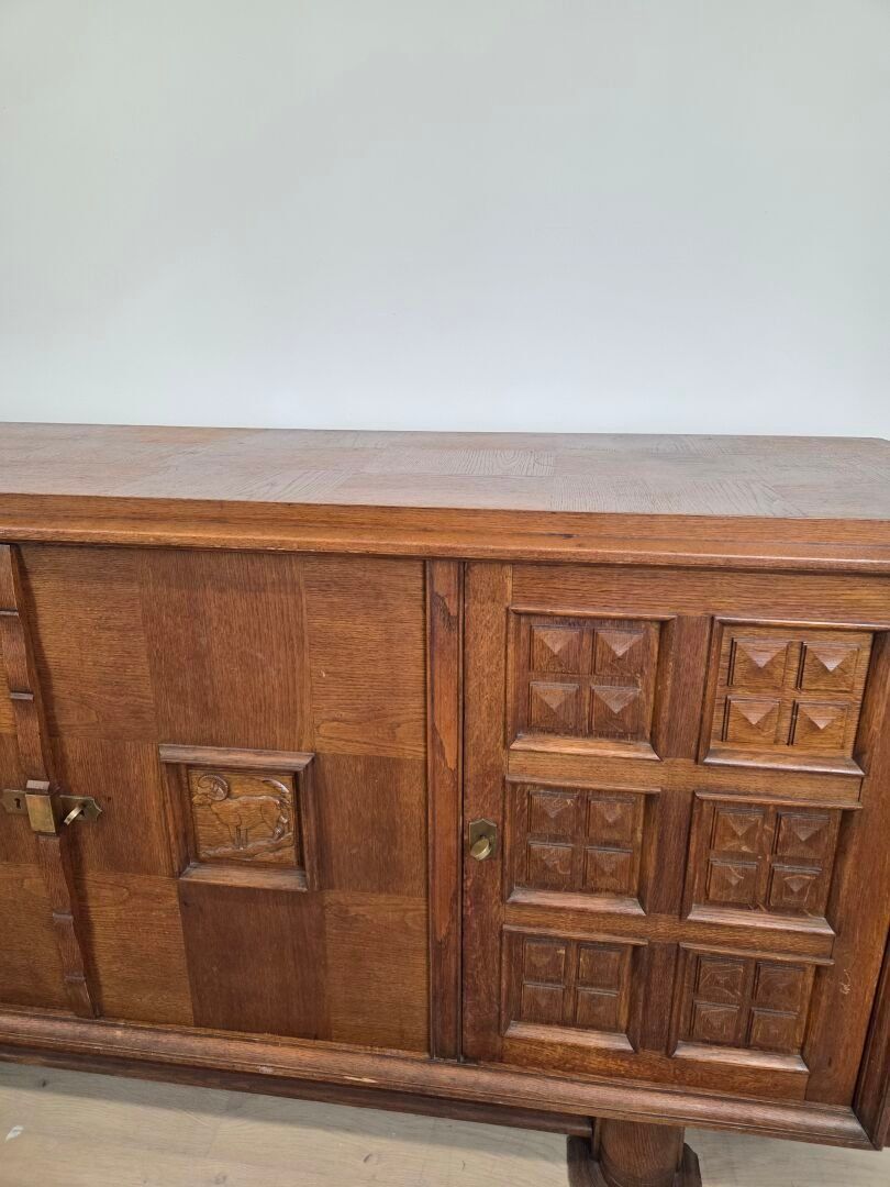 In the style of Charles DUDOUYT (1885-1946). An oak enfilade opening with four doors, two of which are side doors decorated with panels carved with diamond-shaped geometric motifs, and two central doors decorated with stylised animal bas-reliefs. Resting on two massive cylindrical legs. French work from the 1940s - 209 x 95 x 53 cm
