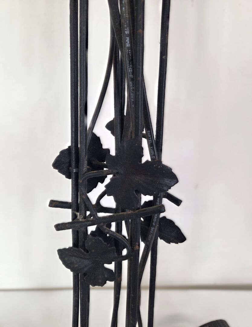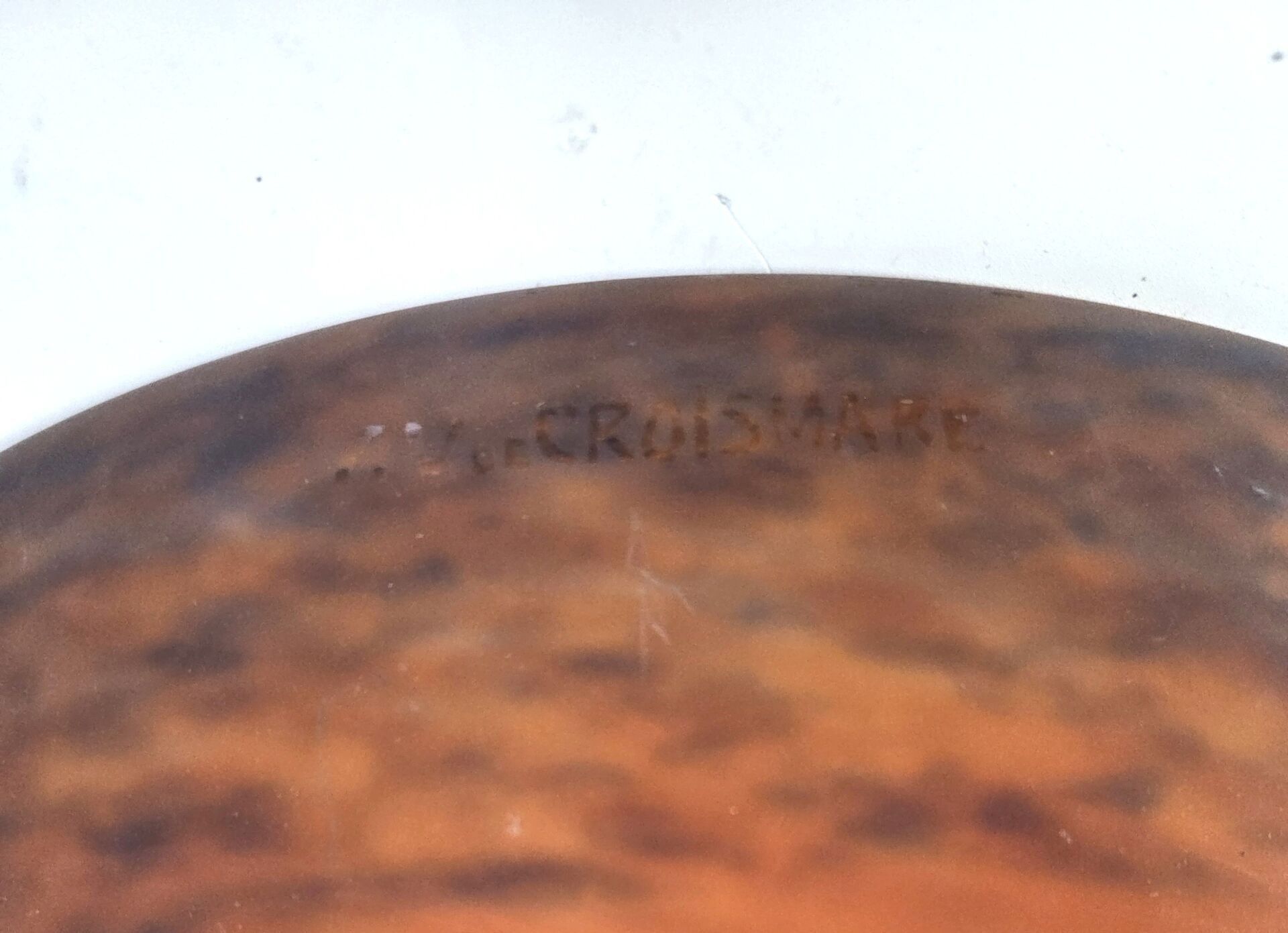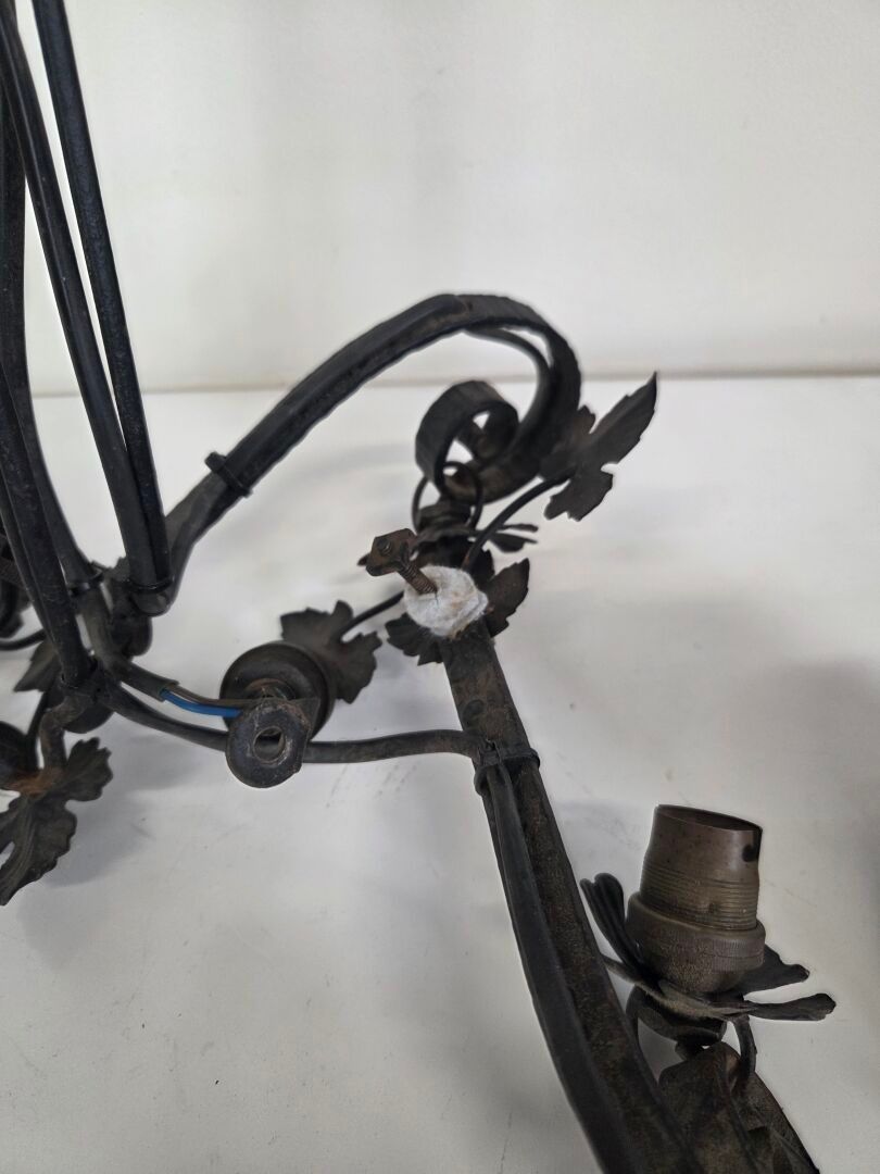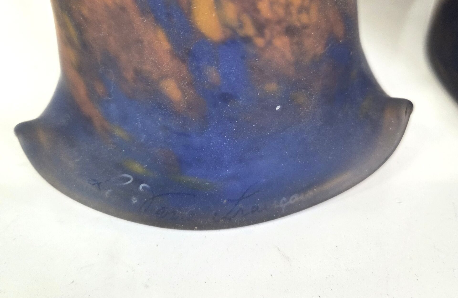 Le VERRE FRANCAIS (reassembled) - Three-light tulip-shaped suspension lamp in marmorated glass signed Le Verre Français, the marmorated glass bowl signed GV. CROISMARE, diameter: 34 cm, wrought-iron frame decorated with vine leaves, height: 81 cm