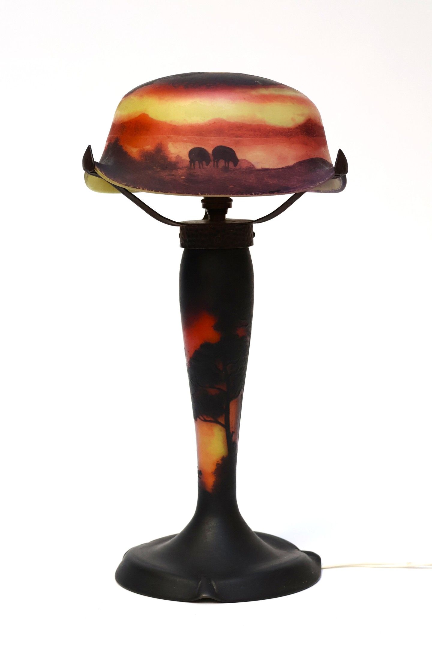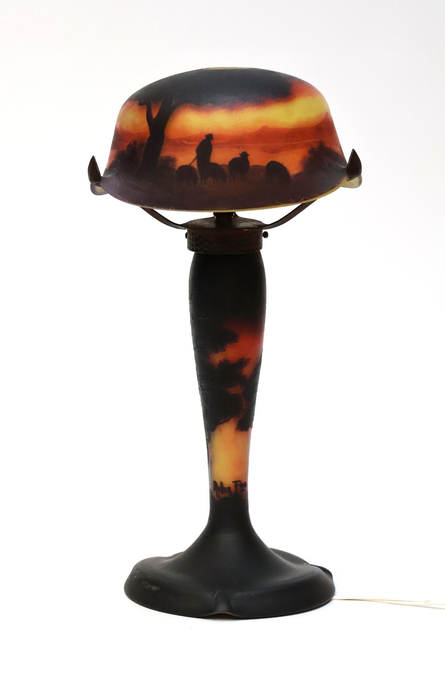 Mushroom lamp in acid-etched multi-layered glass with rotating decoration of a shepherd and his sheep against a landscape background, hammered iron mounting, signed on the shaft