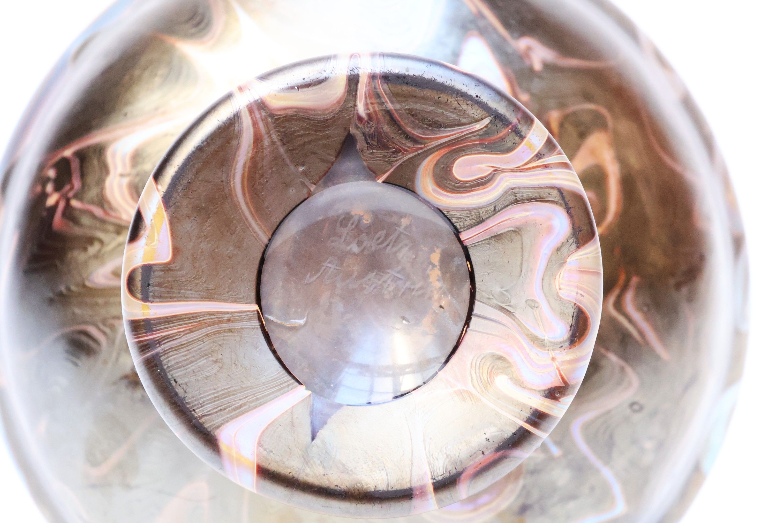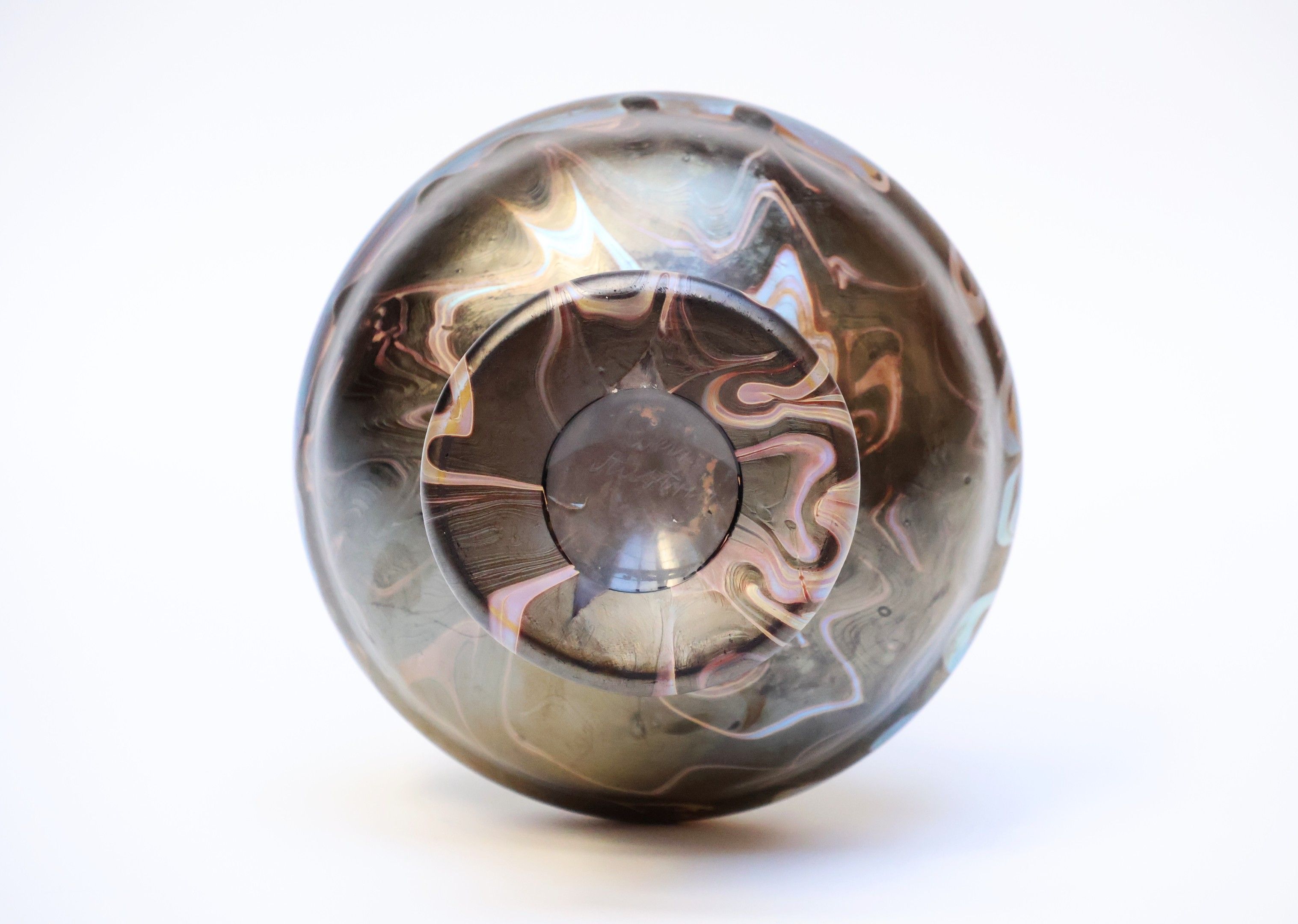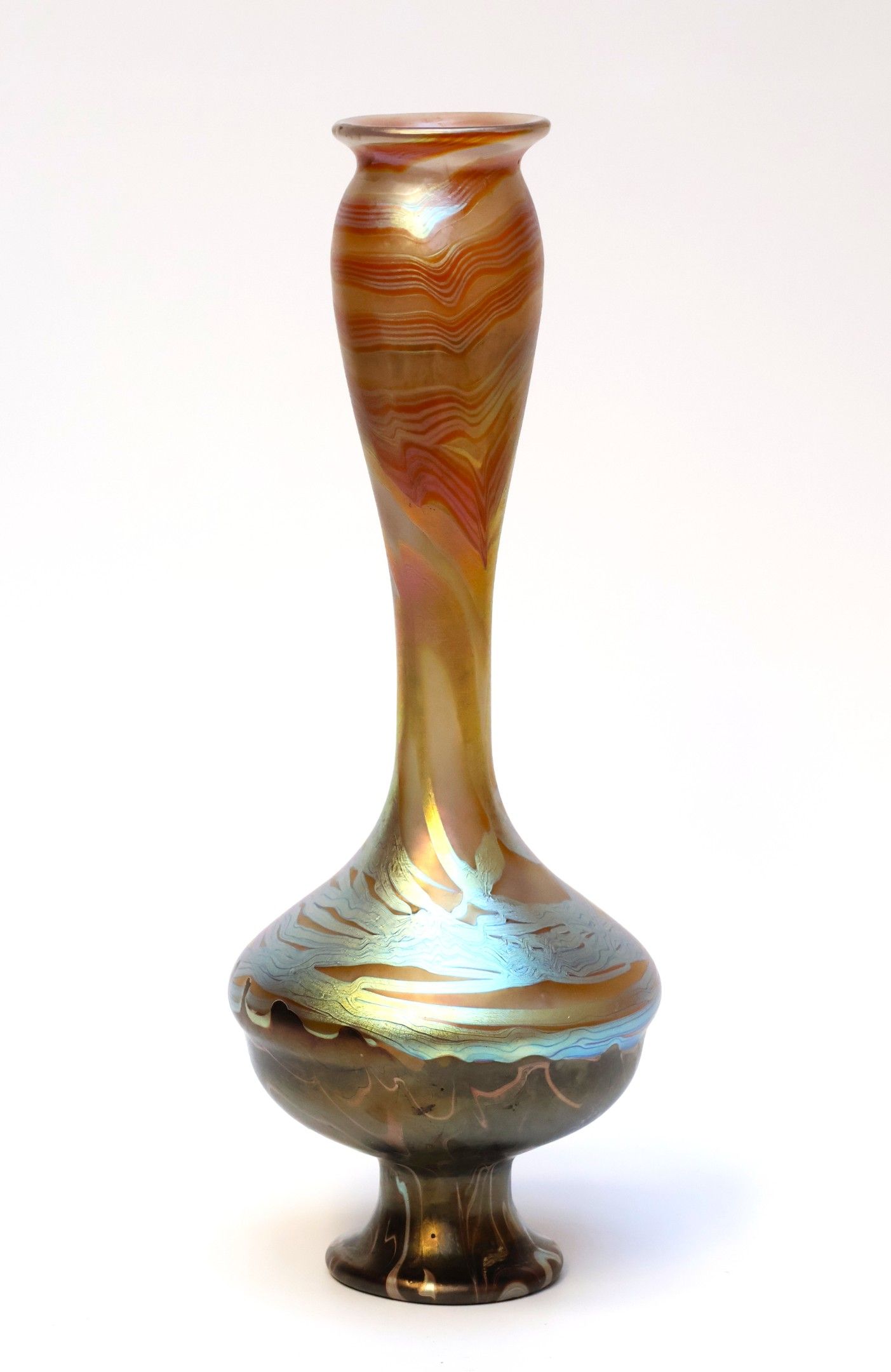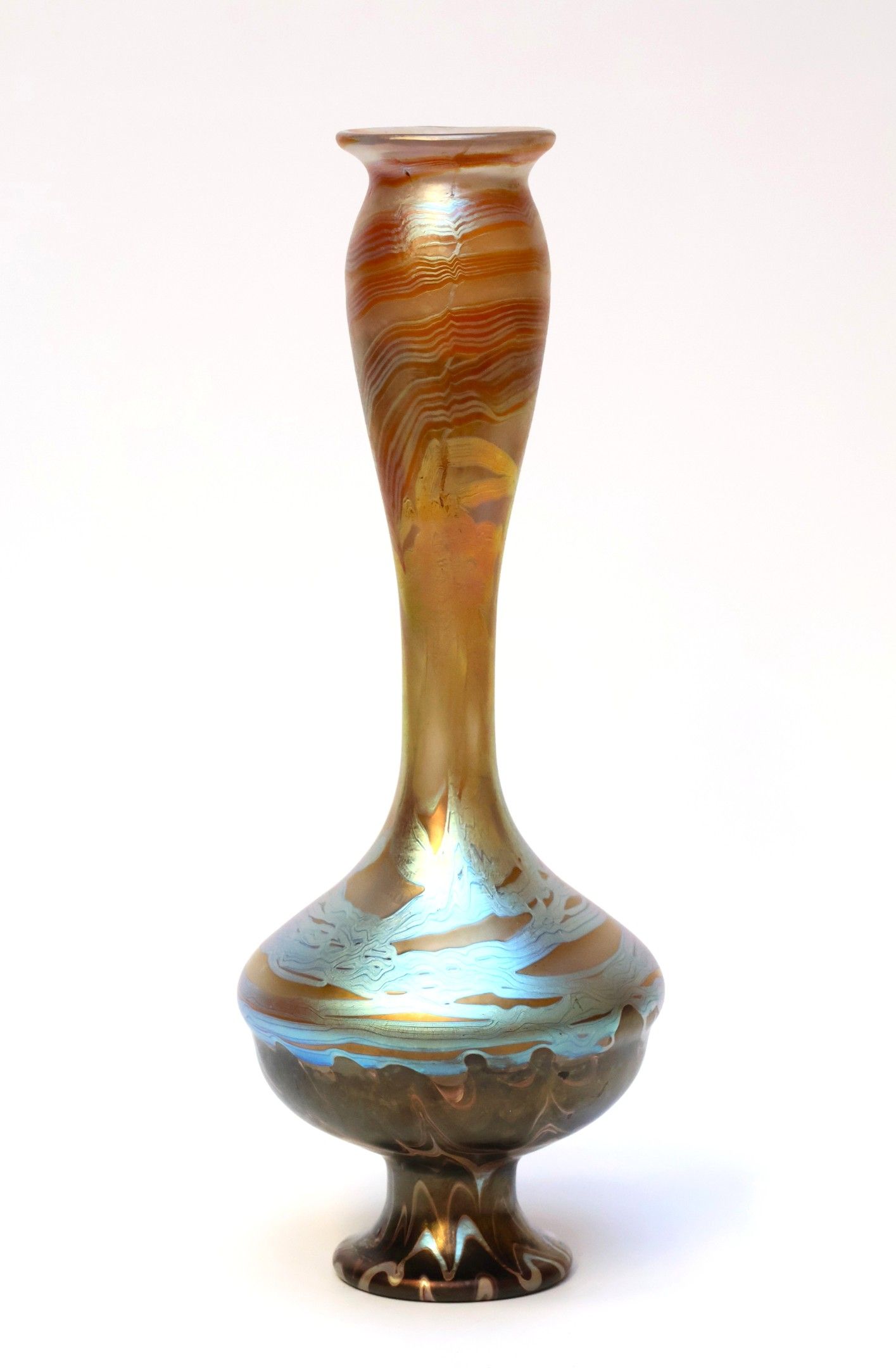 Vase with a long, open, rounded neck on a slightly flattened ovoid base and pedestal. Phänomen" design, created in 1900, in brown, pink and silver iridescent glass. Signed and dated.