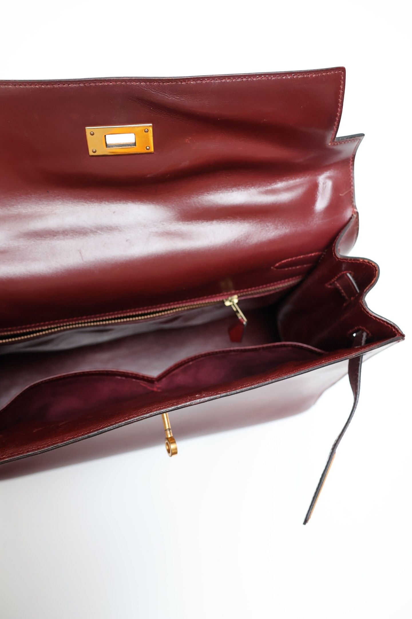 Kelly 32" handbag in burgundy "box" leather with gold metal trim including padlock and keys