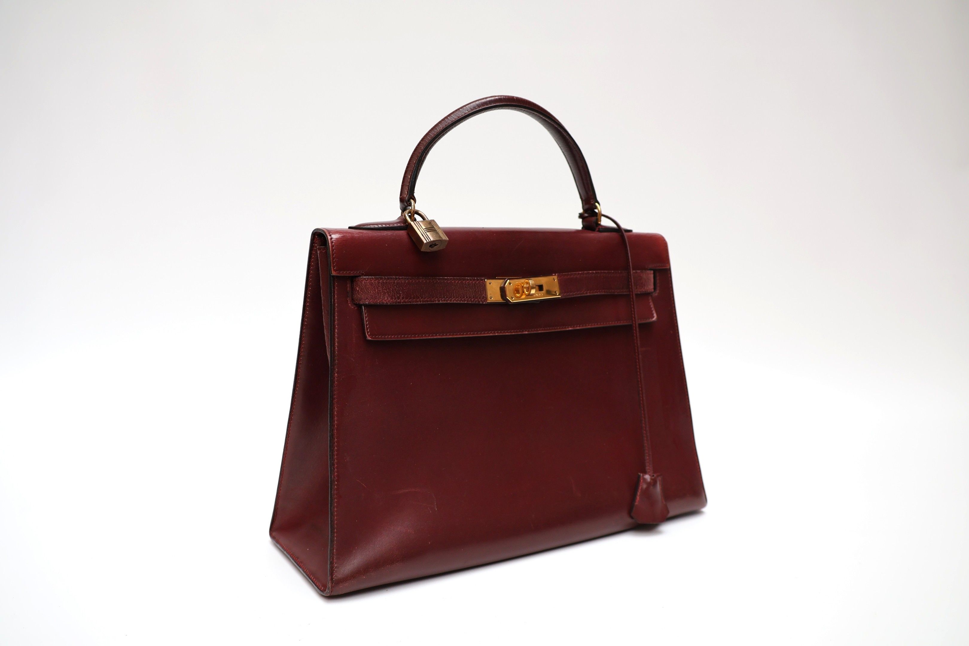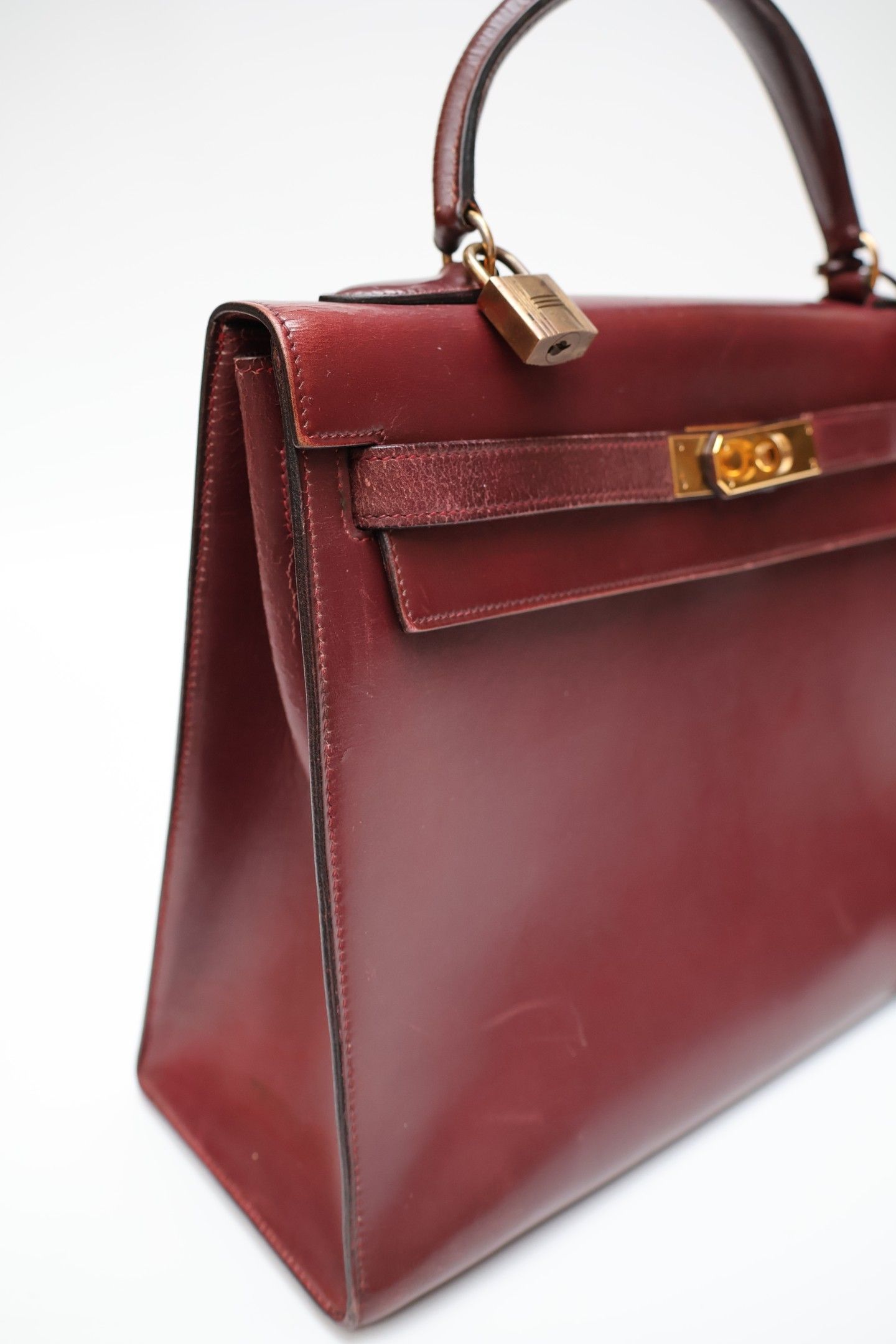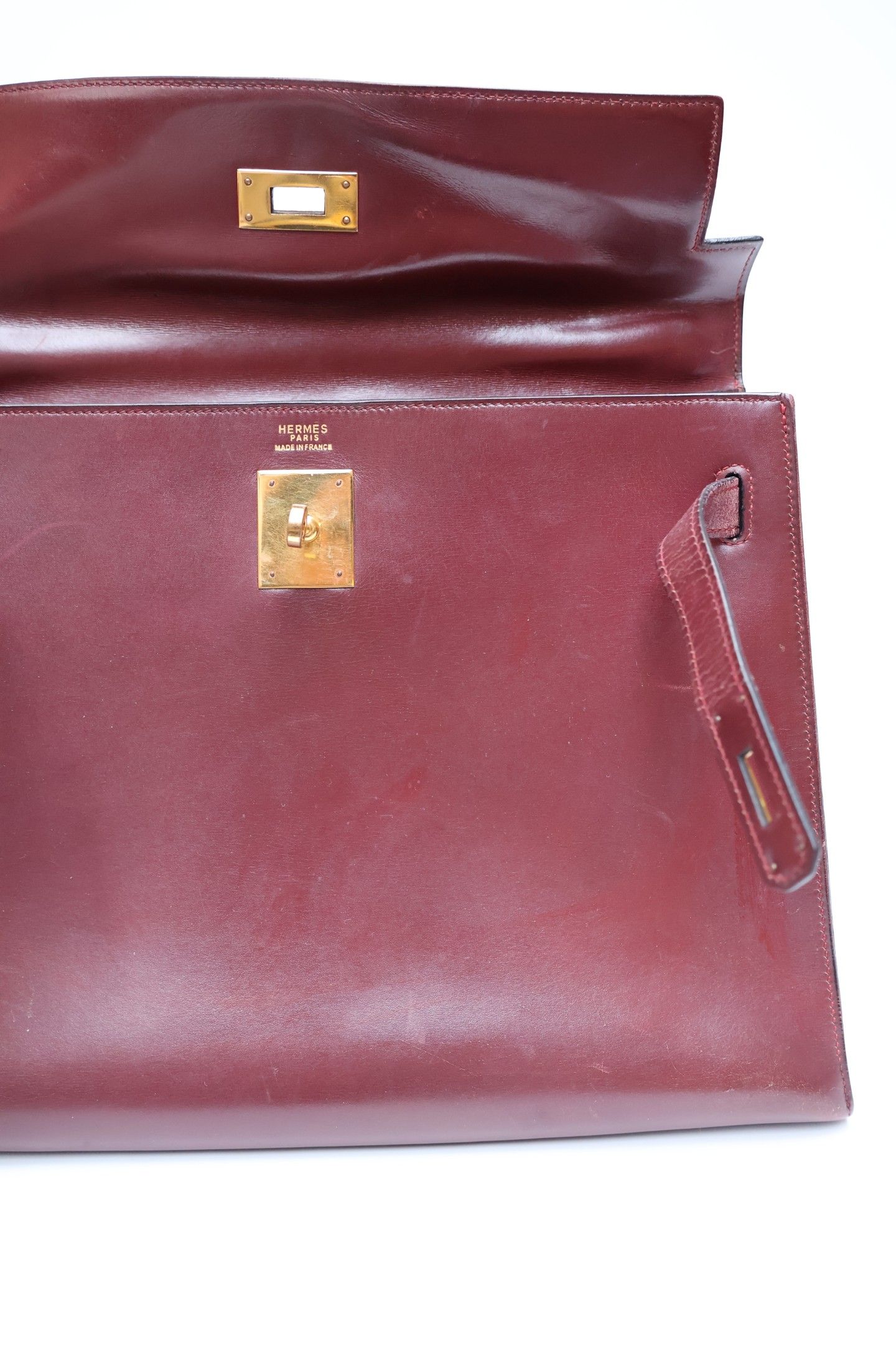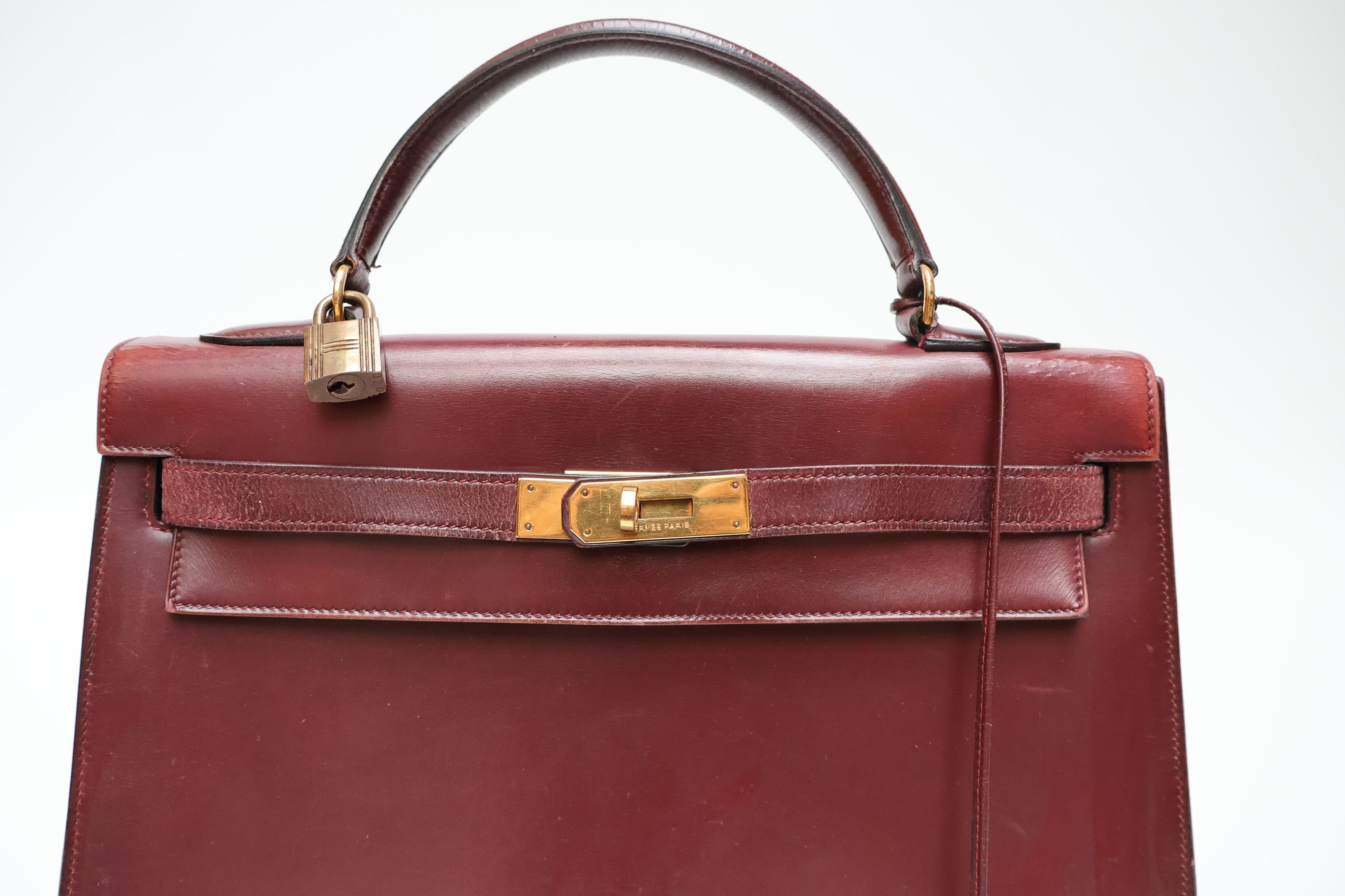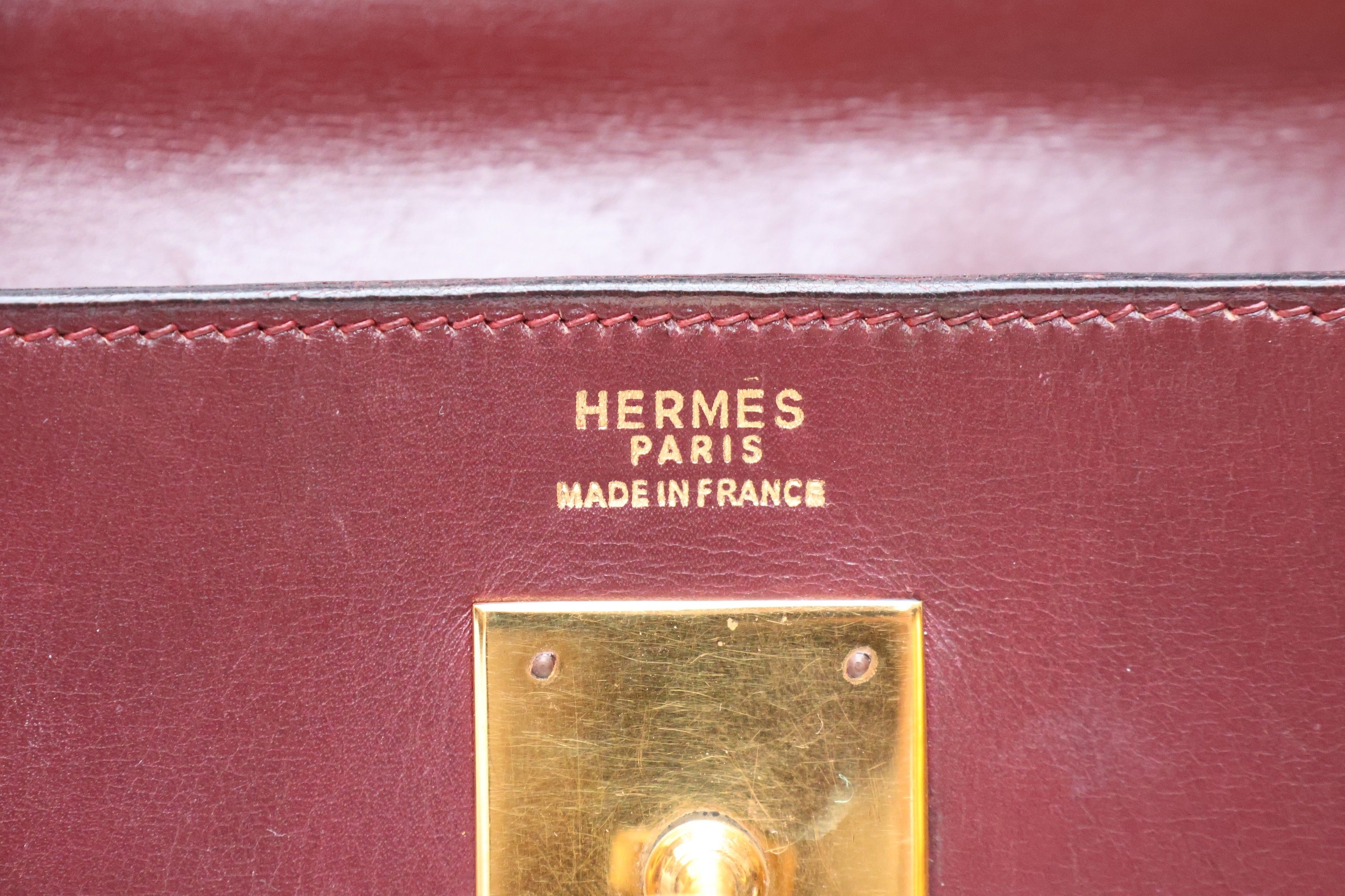 HERMÈS Paris Kelly 32" handbag in burgundy "box" leather wit…