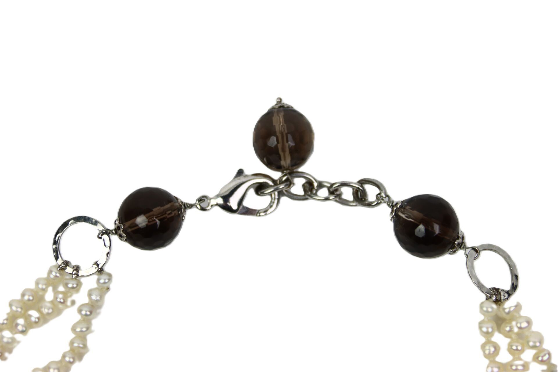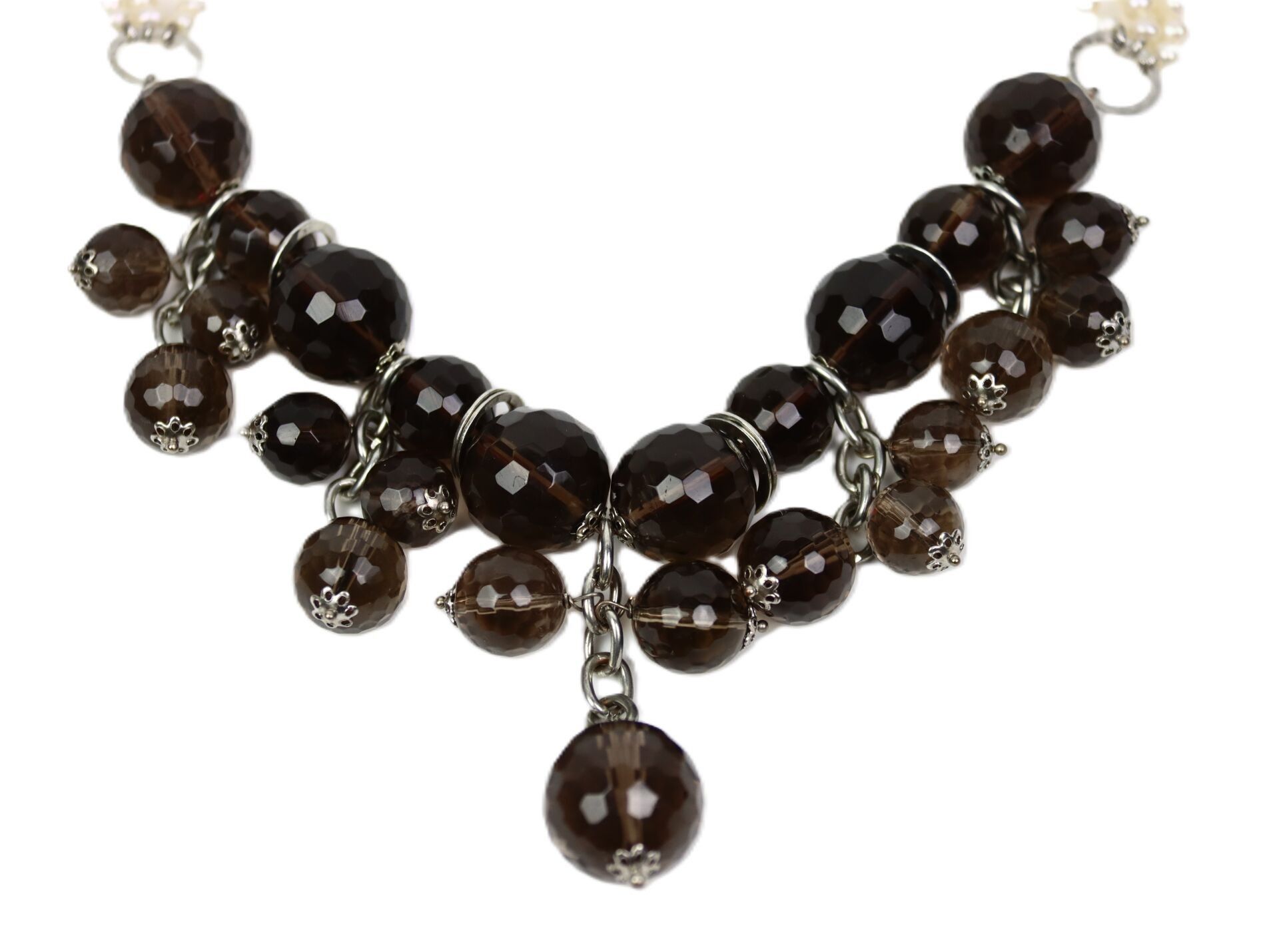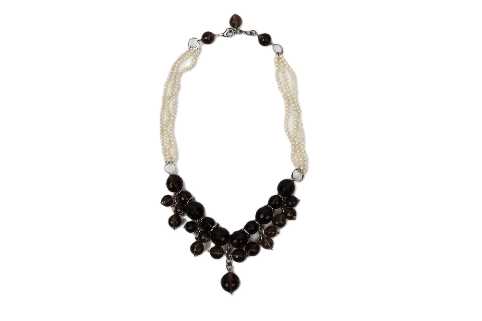 Fancy necklace in silver-plated metal decorated with faceted smoked glass beads and imitation pearls.
