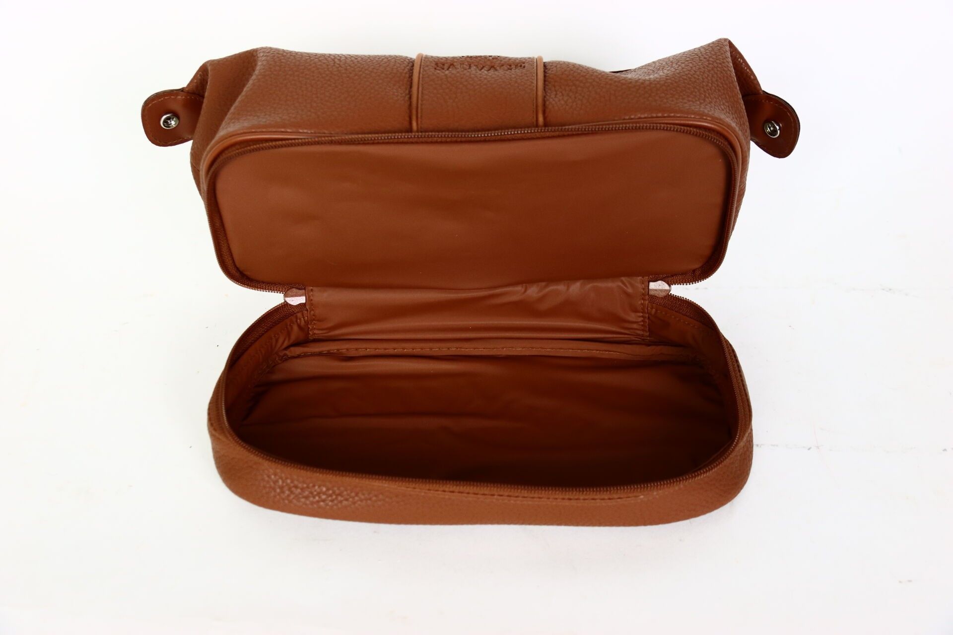 Brown imitation leather toiletry bag, zip fastening and silver-plated metal hardware