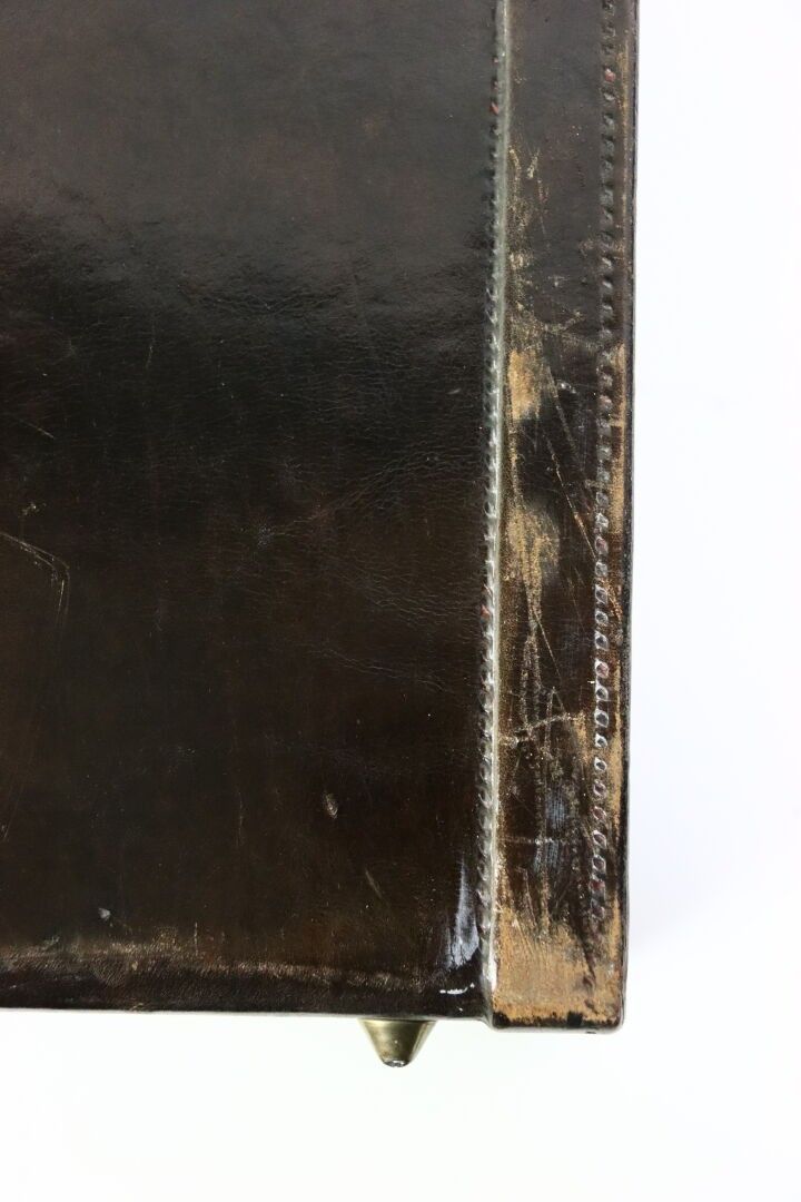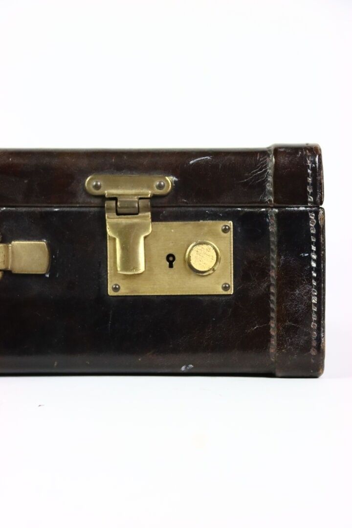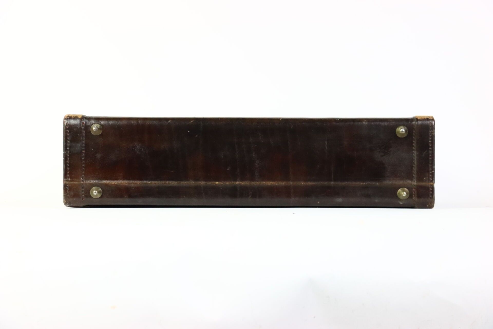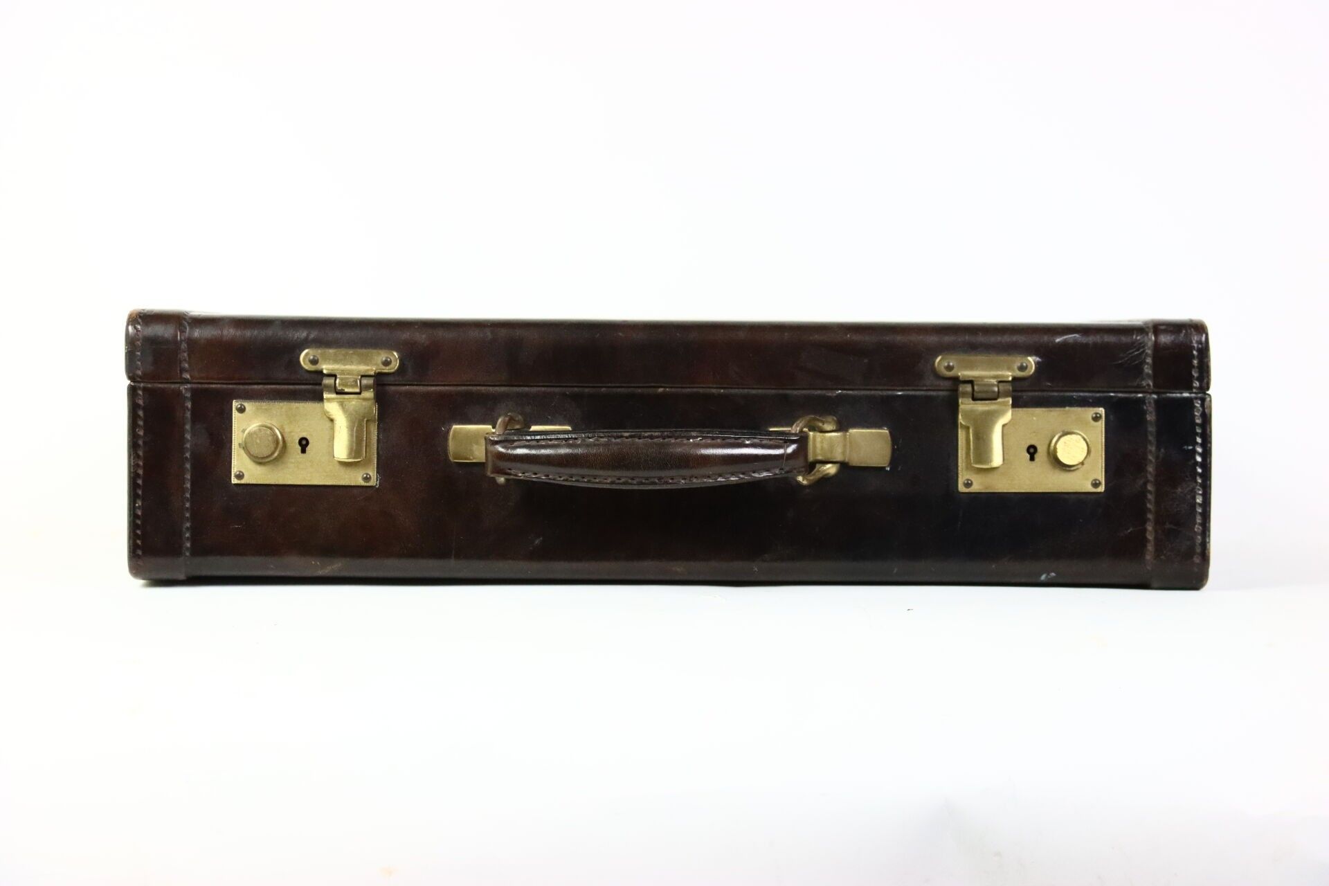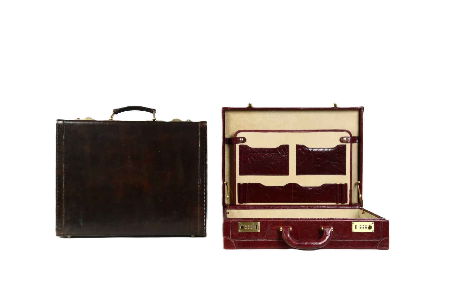 The second in brown leather, gilt key clasp, wear marks on corners. (H_36cm W_45cm D_12cm)