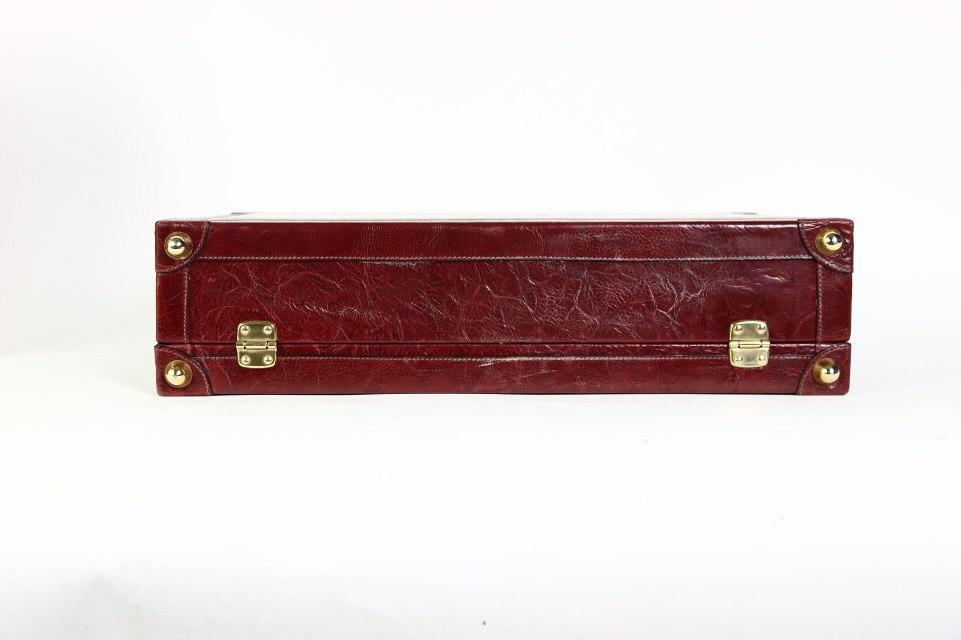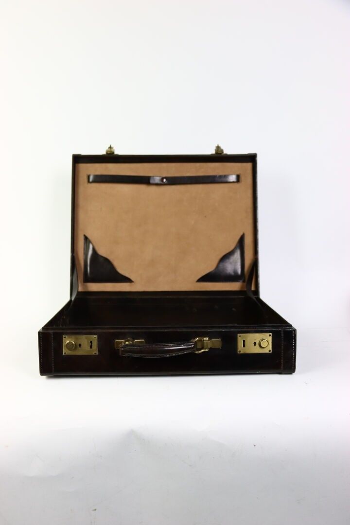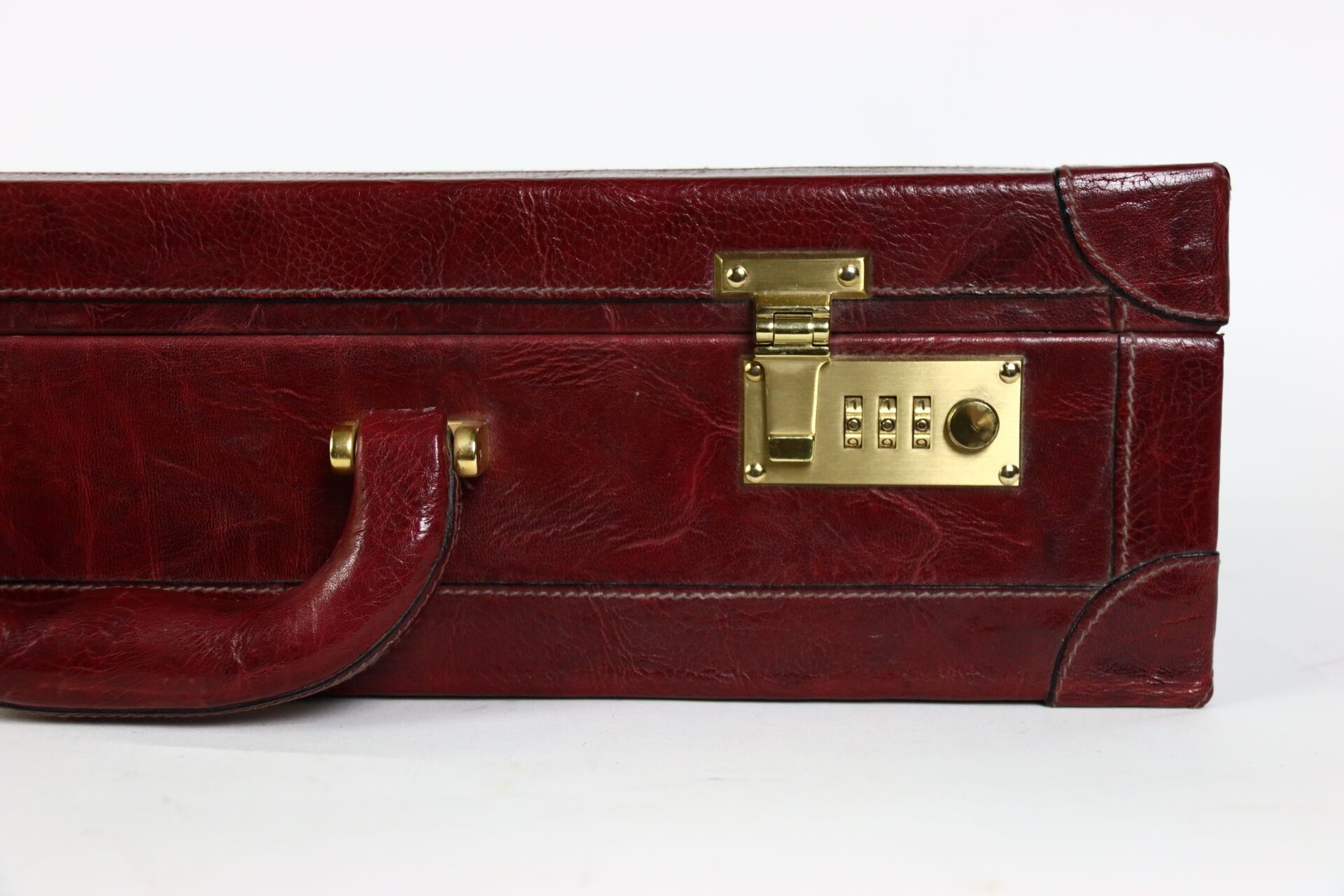 The first in red leather with gold coded clasp, reinforced leather corners (H_33cm W_43cm D_12cm)