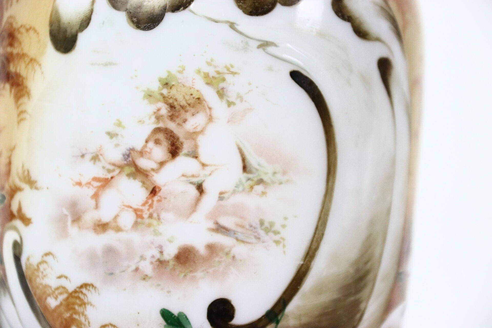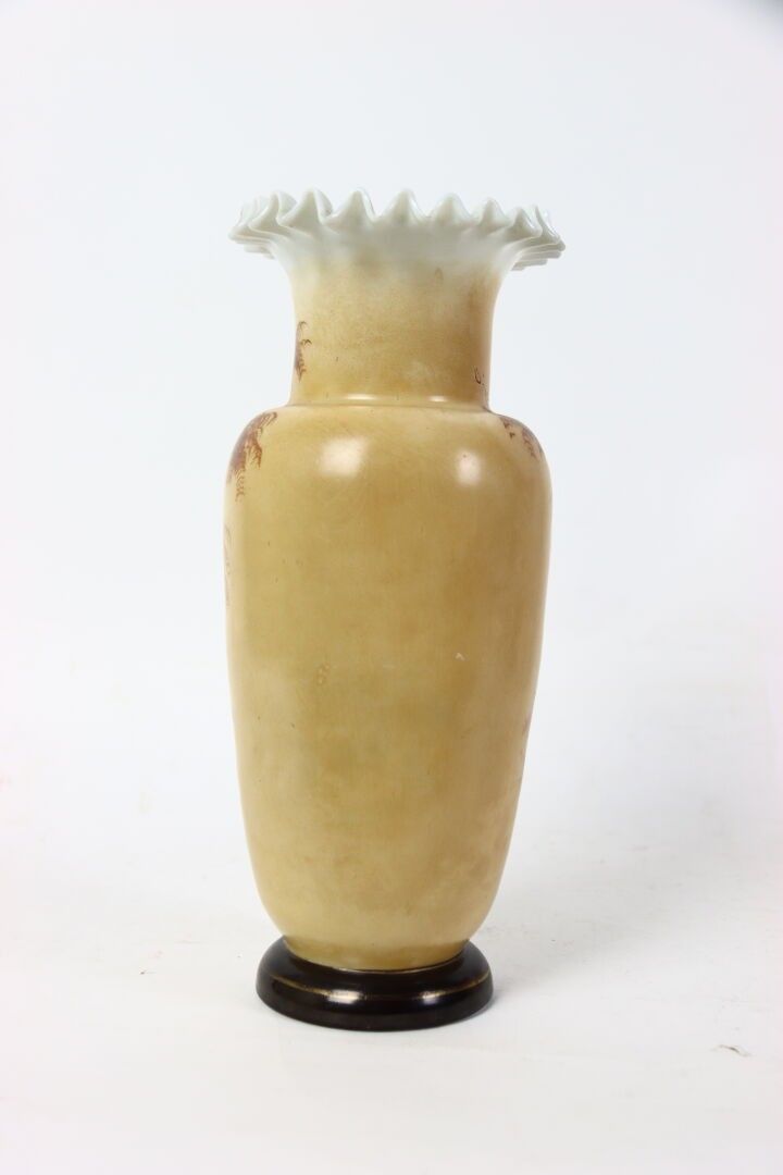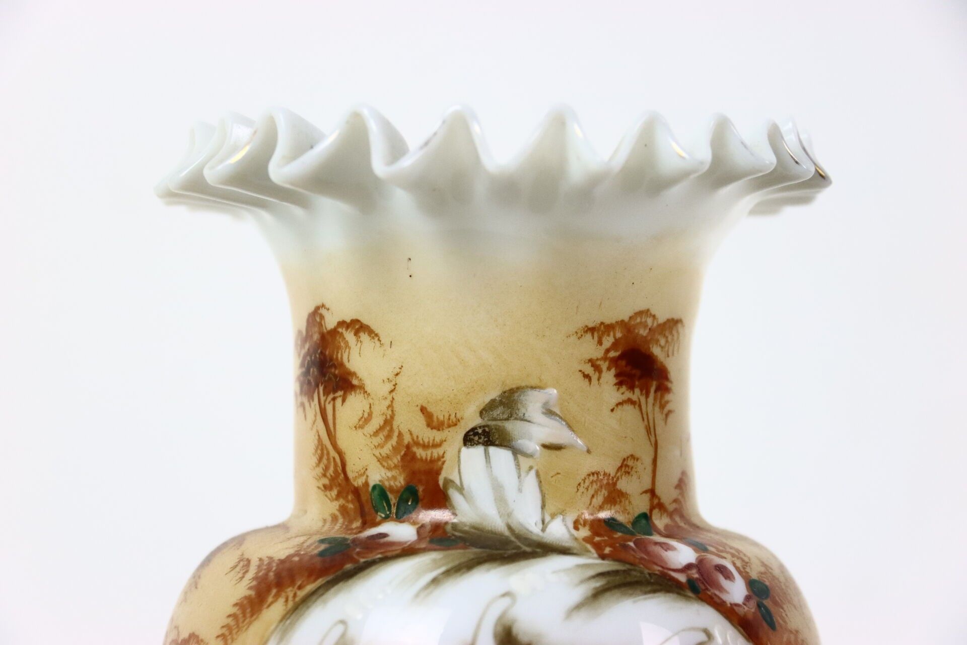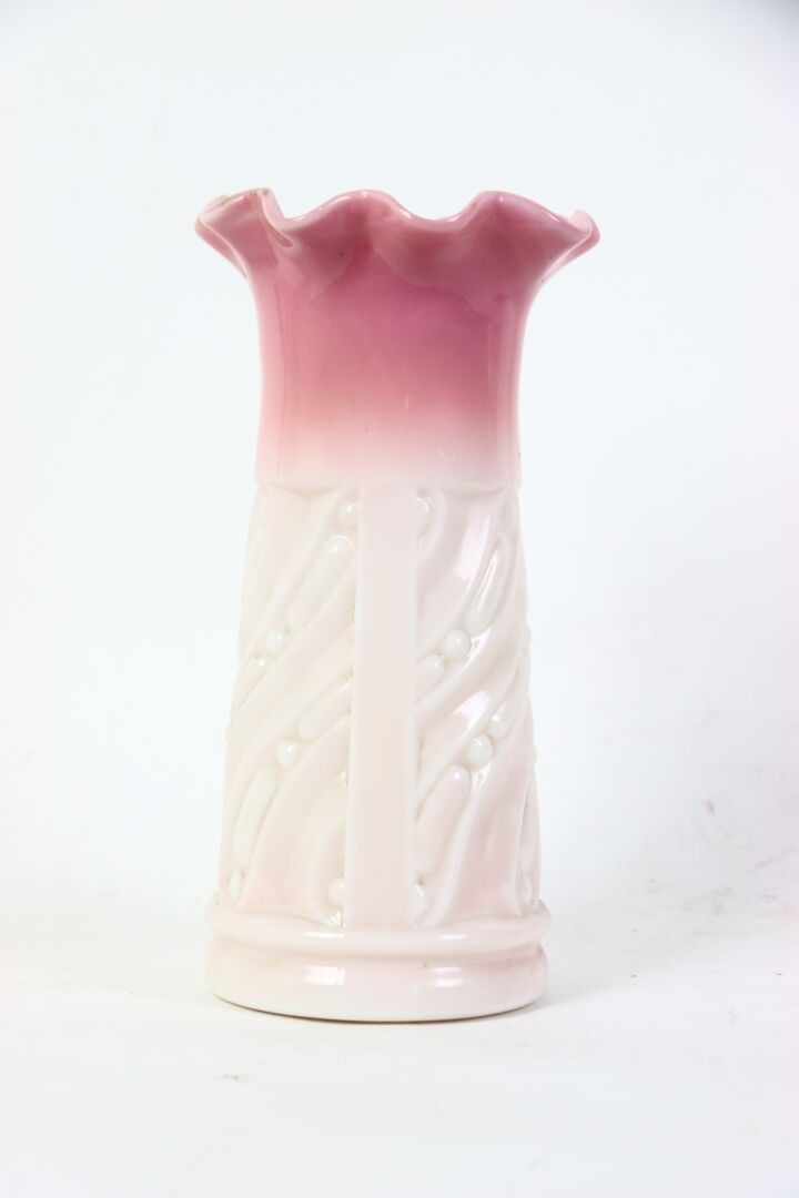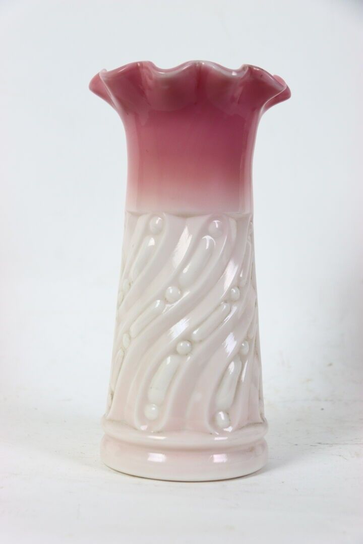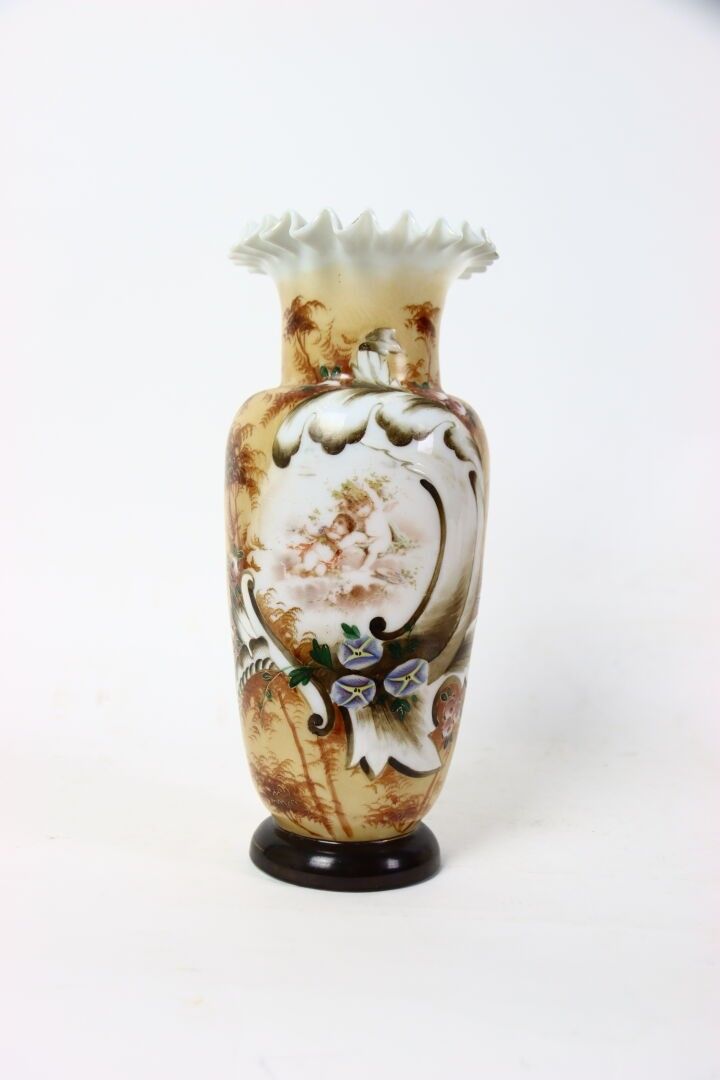 A set of two opaline vases, one in pink shaded opaline with a polylobed rim, the other in opaline decorated with children and flowers