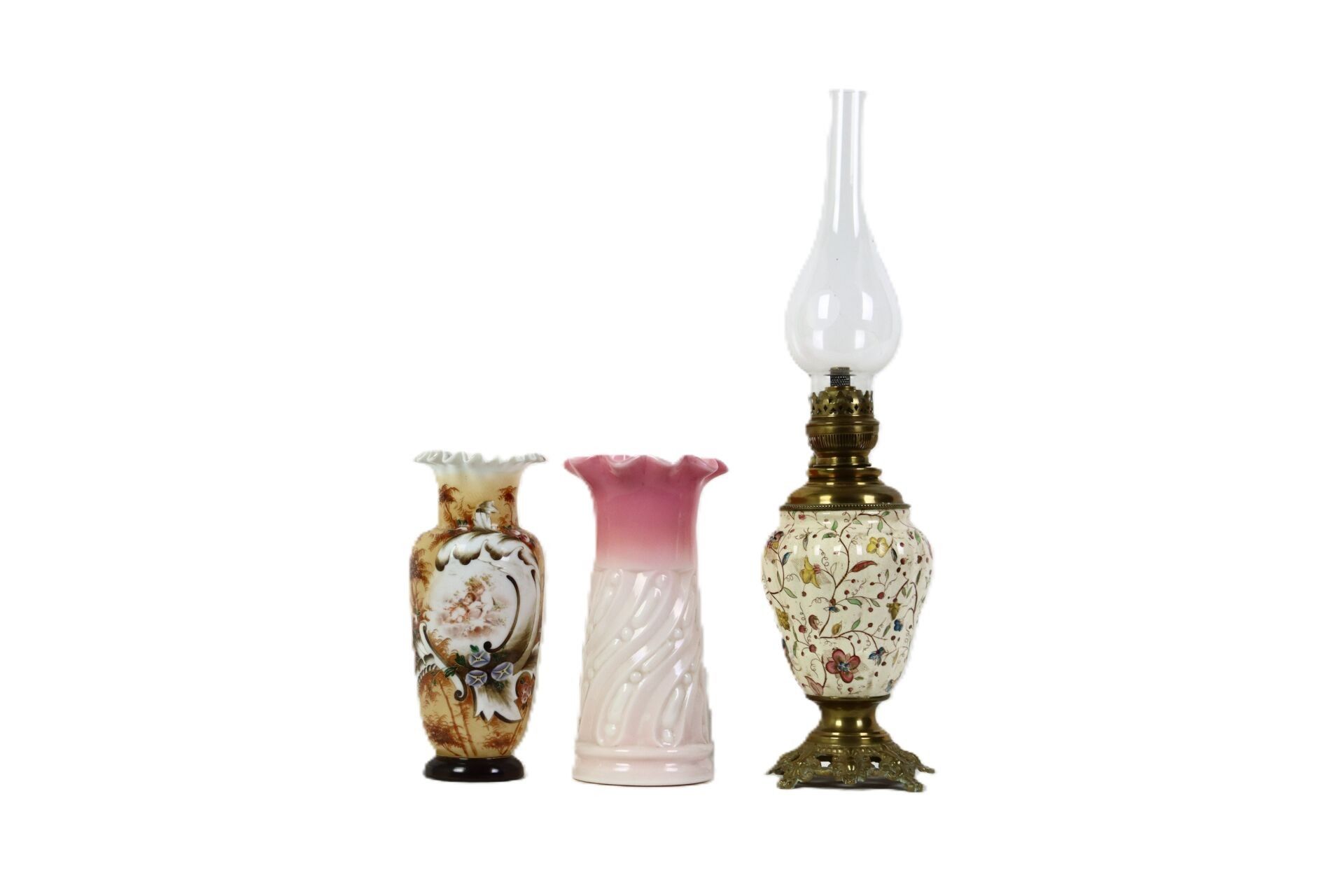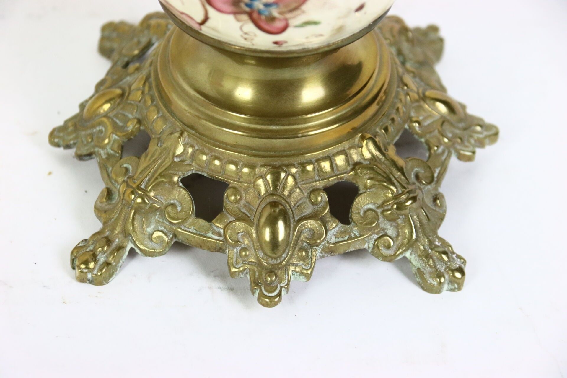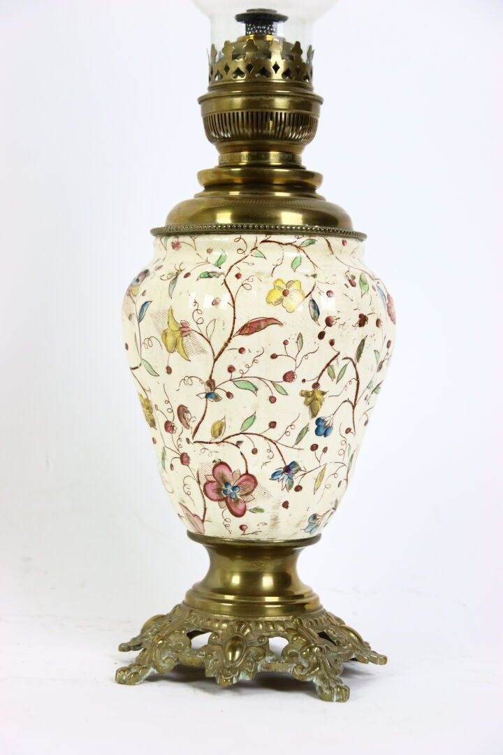 A gilt metal oil lamp with a polychrome enamelled ceramic shaft with floral decoration,