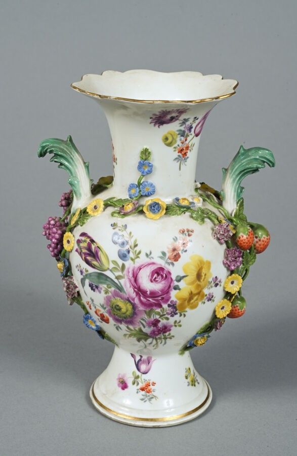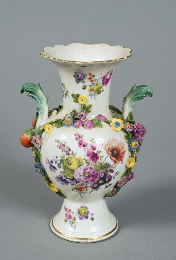 Baluster-shaped vase with polychrome floral decoration and garlands of flowers in relief, handles in the form of light green foliage, gold fillets.