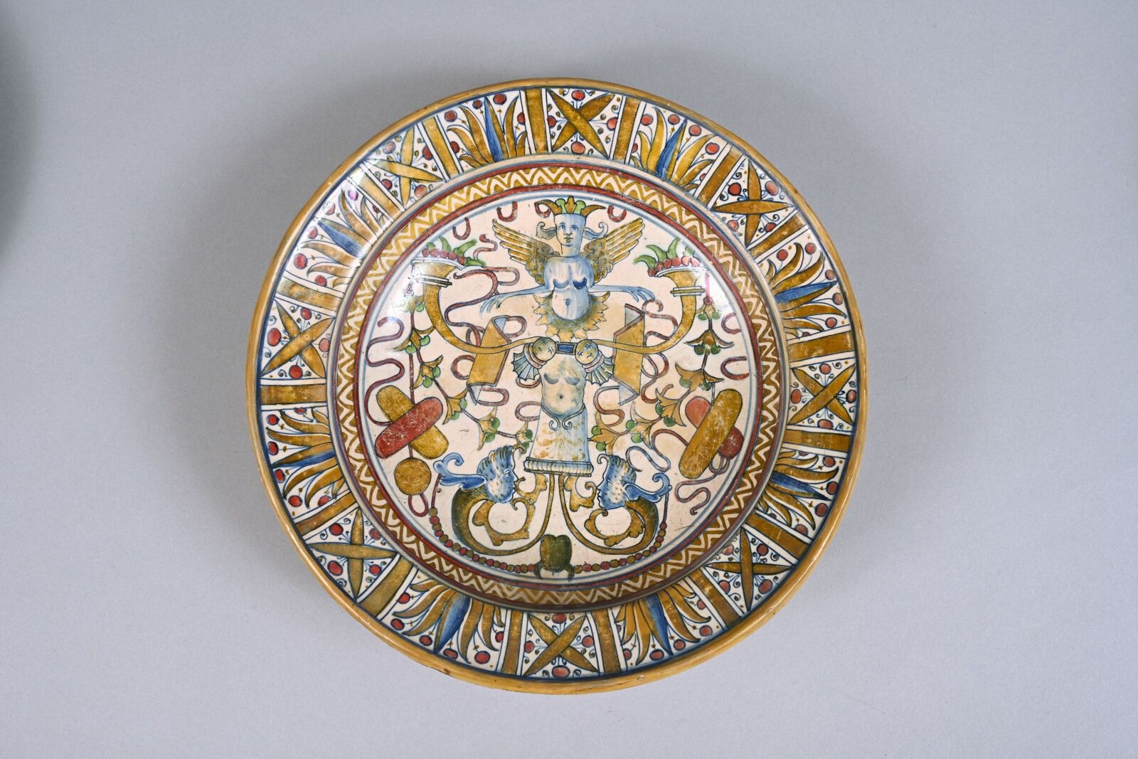 Large round majolica dish with polychrome decoration and buff and ruby red metallic lustre. In the centre, in a symmetrical composition a raffaellesche of a fantastic figure with a winged bust, crowned and surrounded by foliage, ribbons, winged faces and horns of plenty. Frieze of geometric motifs and on the wing radiant decoration of stylised motifs and ruby red dots. Varnished reverse.