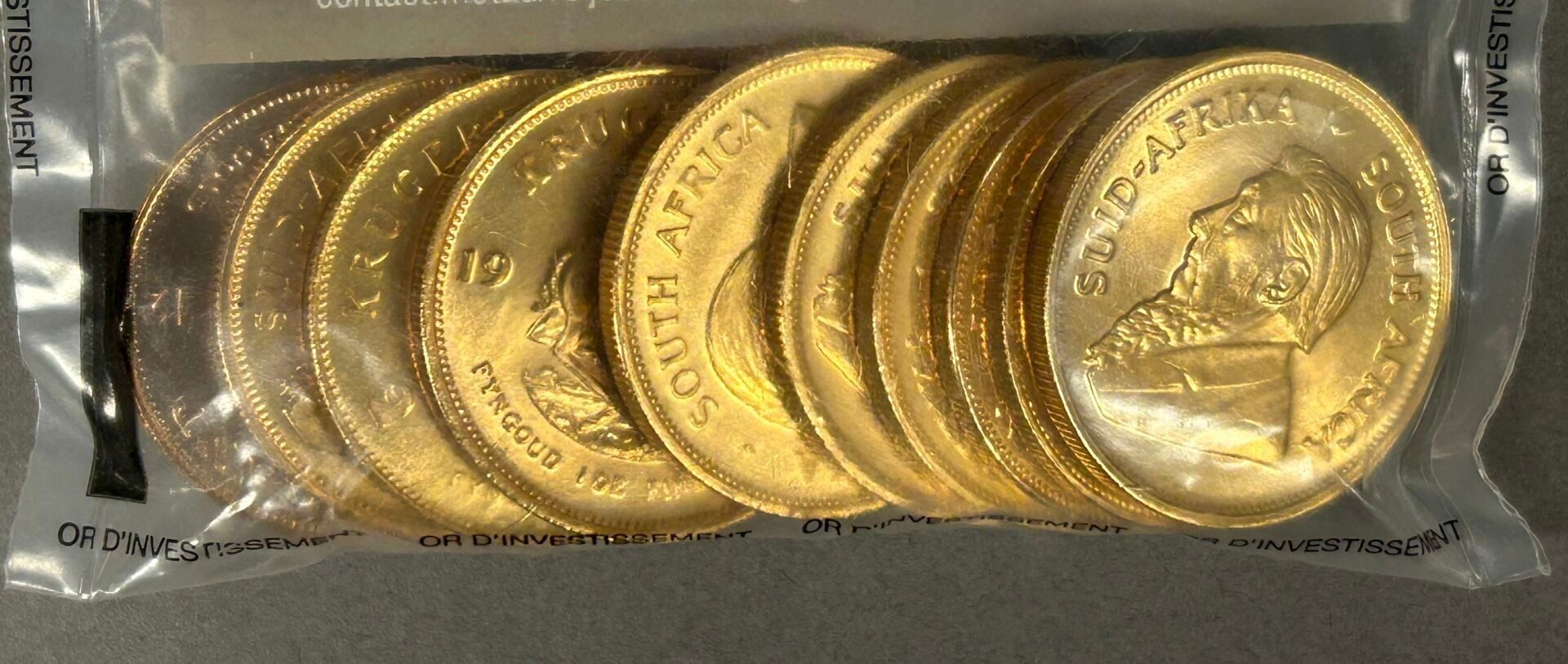 Lot of 12 pieces of 1 kruggerand in gold. Paul Kruger type. 1976 (2), 1977, 1978, 1979 (2), 1982, 1983, 1984 and 2012 (3). In sealed plastic bag numbered 20533 from Maison Joubert. 38 bis, rue Vivienne. 75002 Paris. Estimated total weight: 407.16 g.