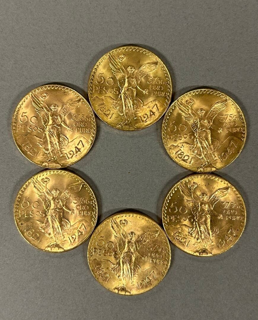 Set of 6 gold 50 peso coins. Type 100th anniversary of the independence of Spain (1821-1947).