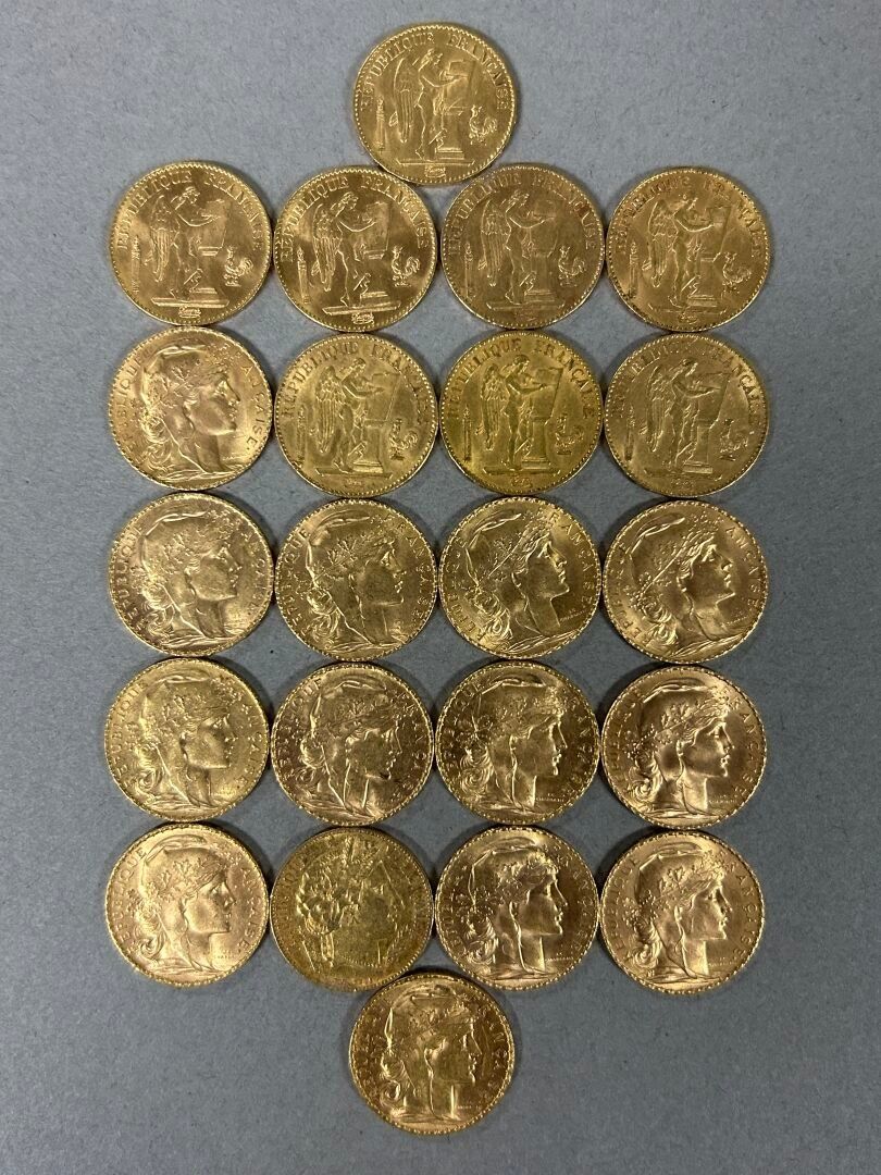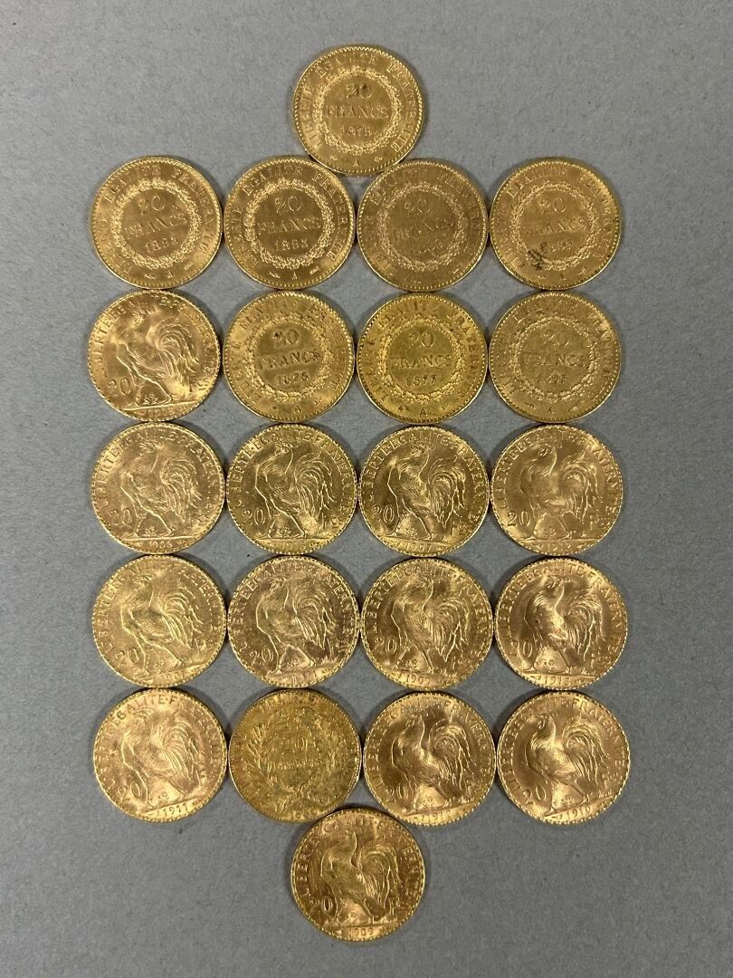 Lot of 22 gold 20 franc coins including: