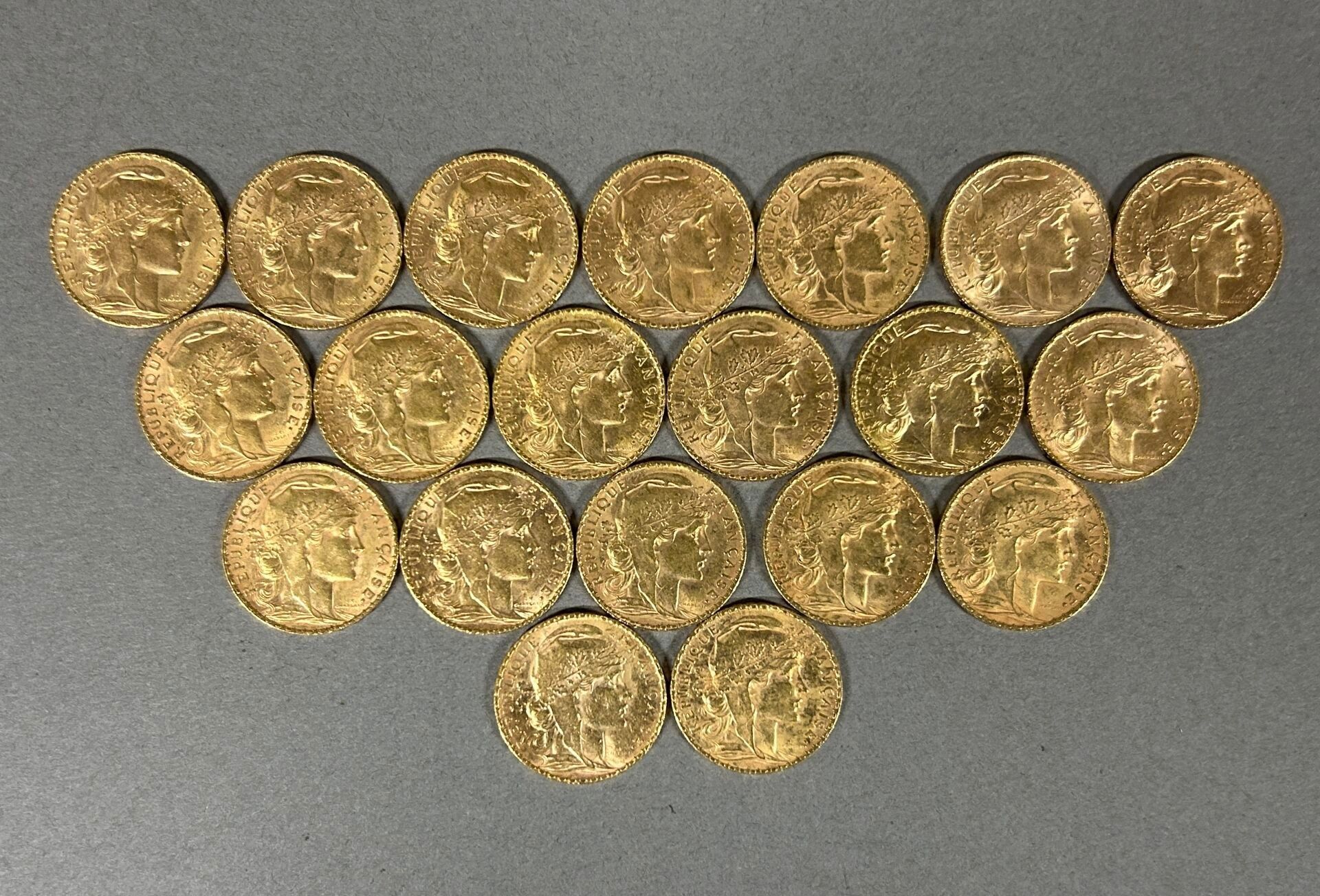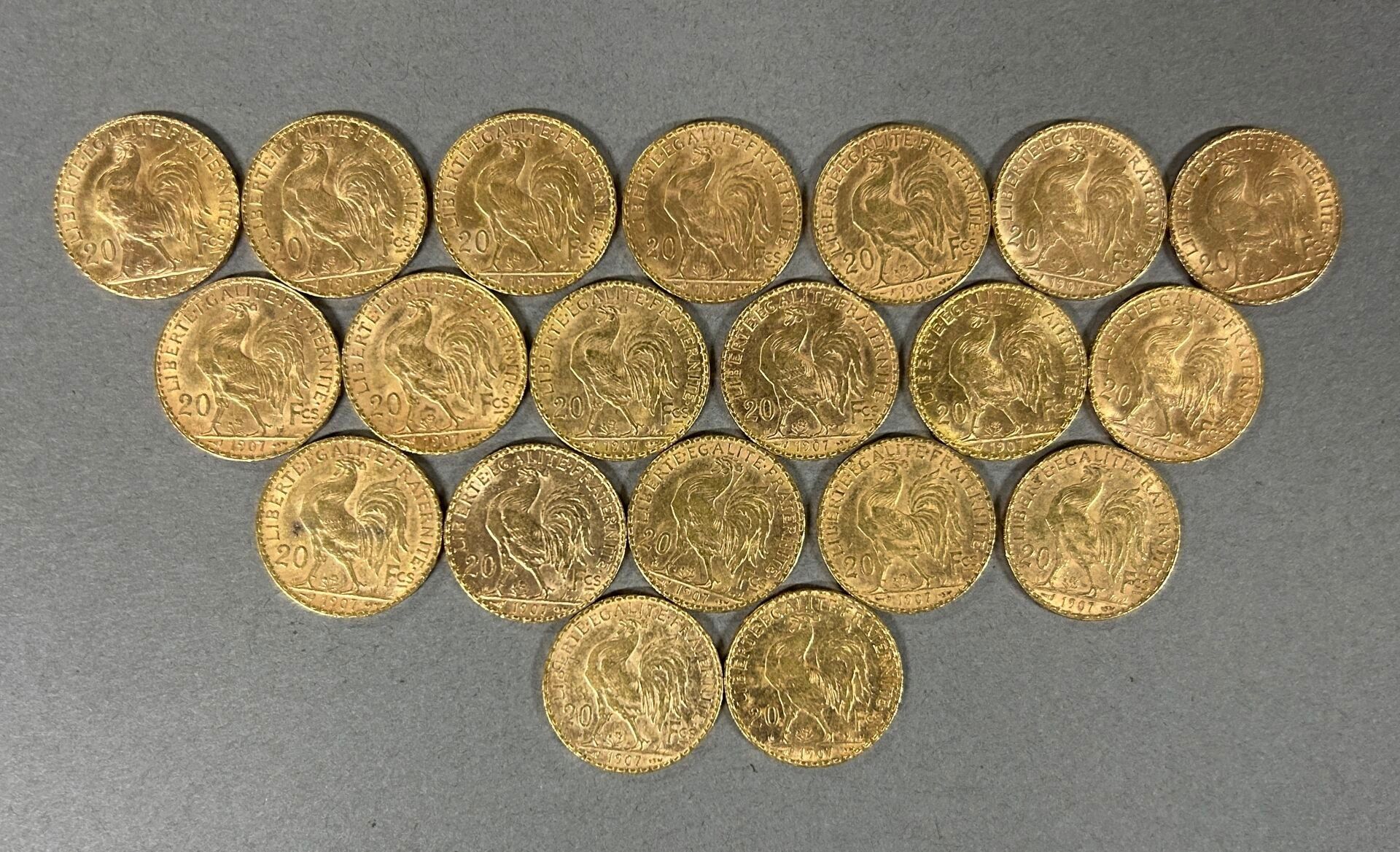 Lot of 20 gold 20 franc coins. Marianne type. 1906 and 1907 (19). Total weight: 128.5 g.