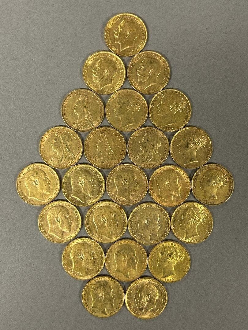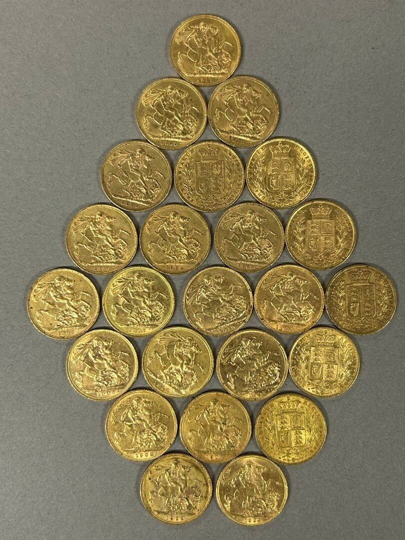 Lot of 24 gold 1 sovereign coins comprising: