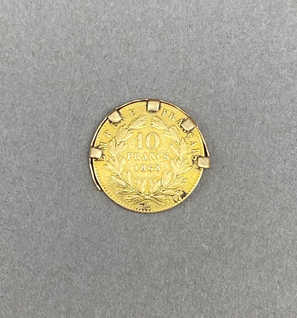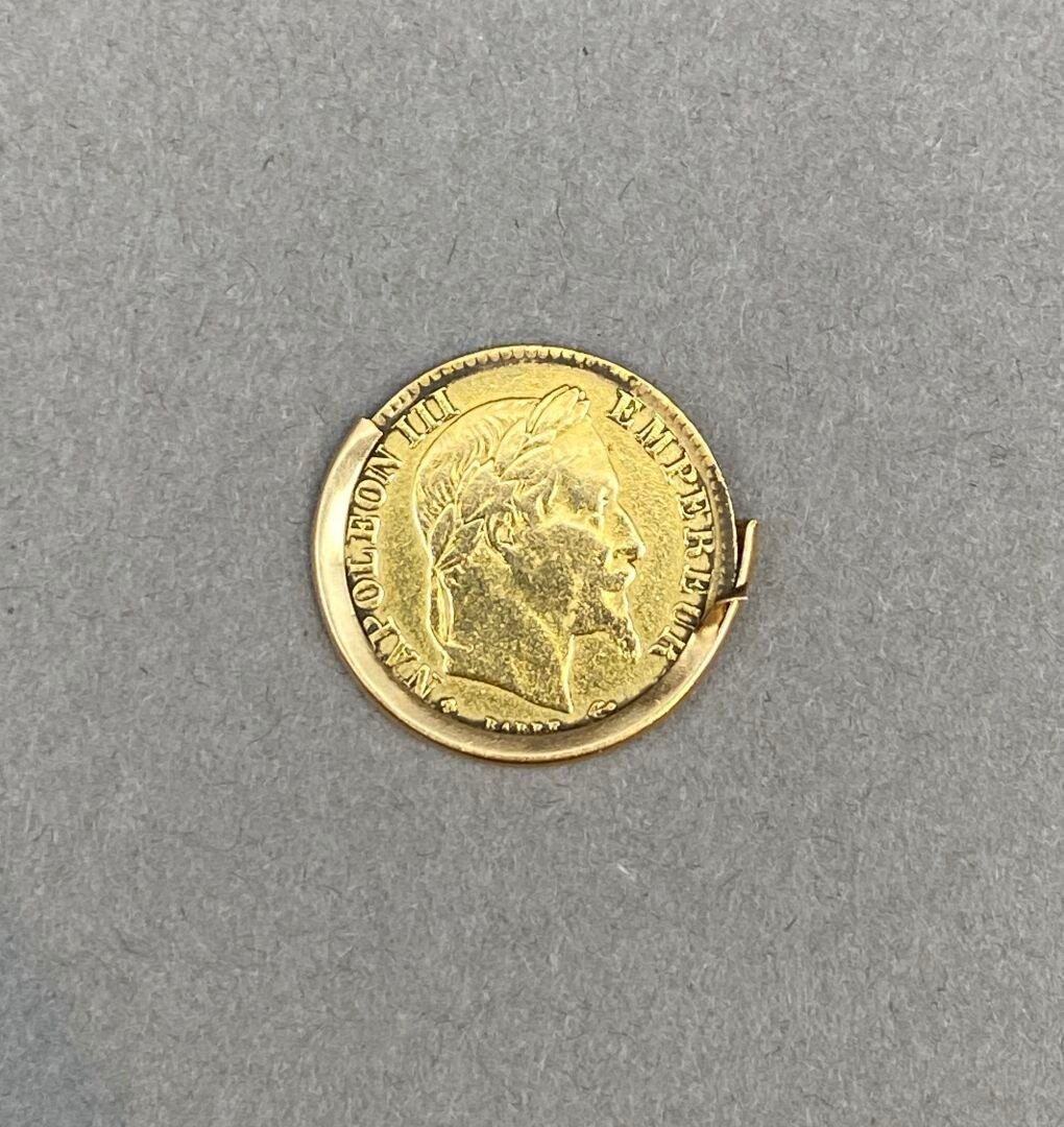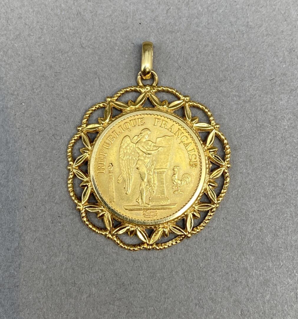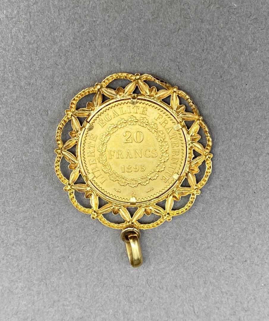 Lot including: - A 750°/°° (18 K) gold pendant set on claws with a 20-franc Génie de la République coin, 1895, atelier A. The setting is embossed and openwork with foliage and a cord. Eagle head hallmark. Diameter: 3.2 cm. Weight: 8.3 g. (Slight deformation). - A 10-franc coin partially set on a claw for an old gold pendant 750 °/°° (18 K), type Napoléon III tête laurée, 1868, atelier BB. Diameter: 1.9 cm. Weight: 3.6 g. (Accident and missing setting).
