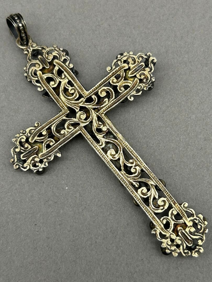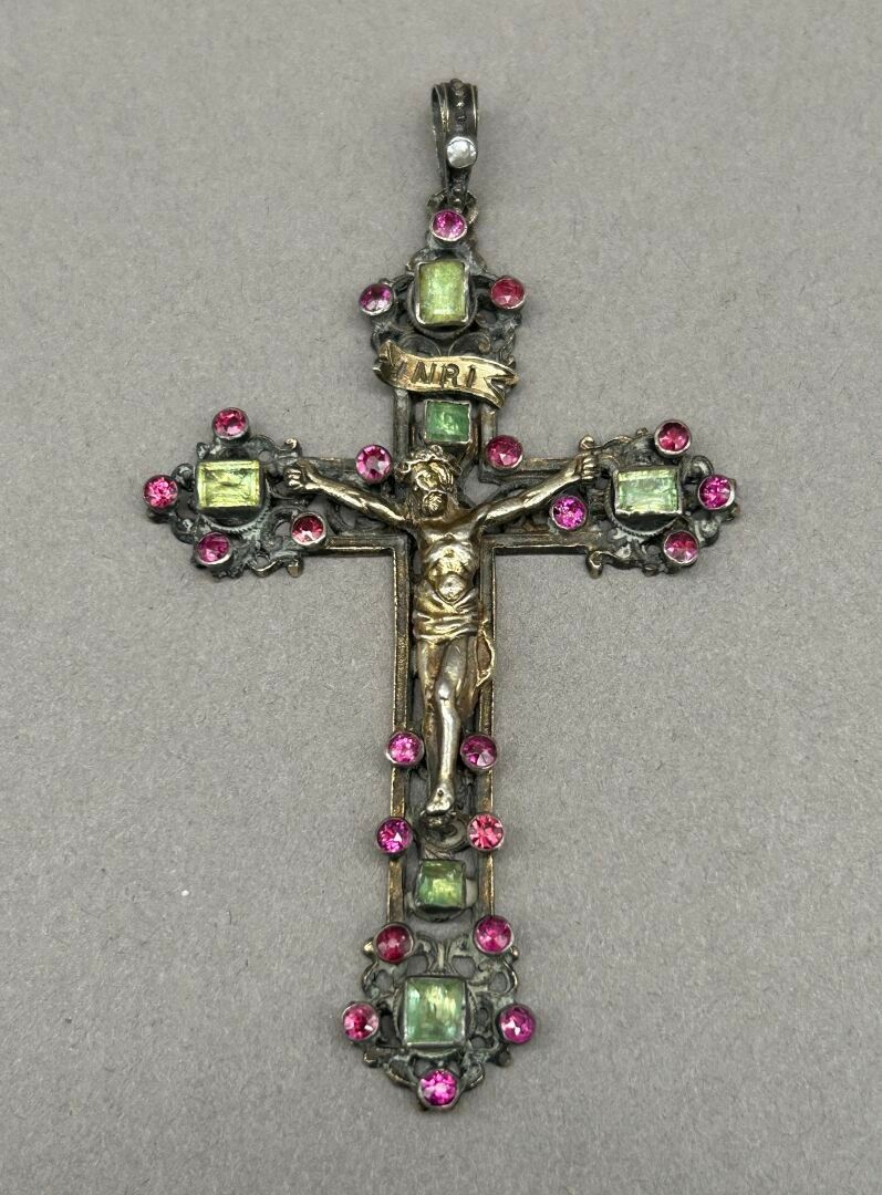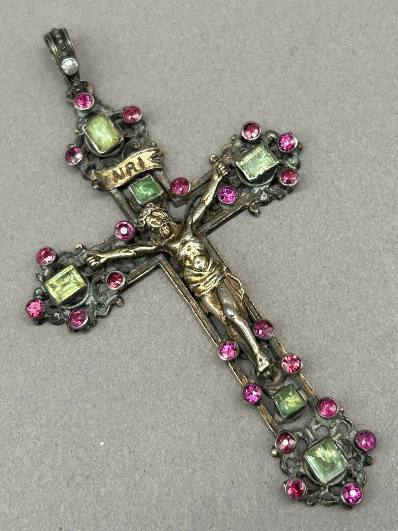Cross pendant in chased and partially openwork silver. Set with rose, mauve and green cut stones in a closed setting. The hoop is set with a mother-of-pearl pearl. Hallmarked. 19th century. Total height: 9.4 cm. Width: 5.4 cm. Height without clasp: 8.5 cm. Gross weight: 21.7 g. (Some chipping or minor damage to the stones).