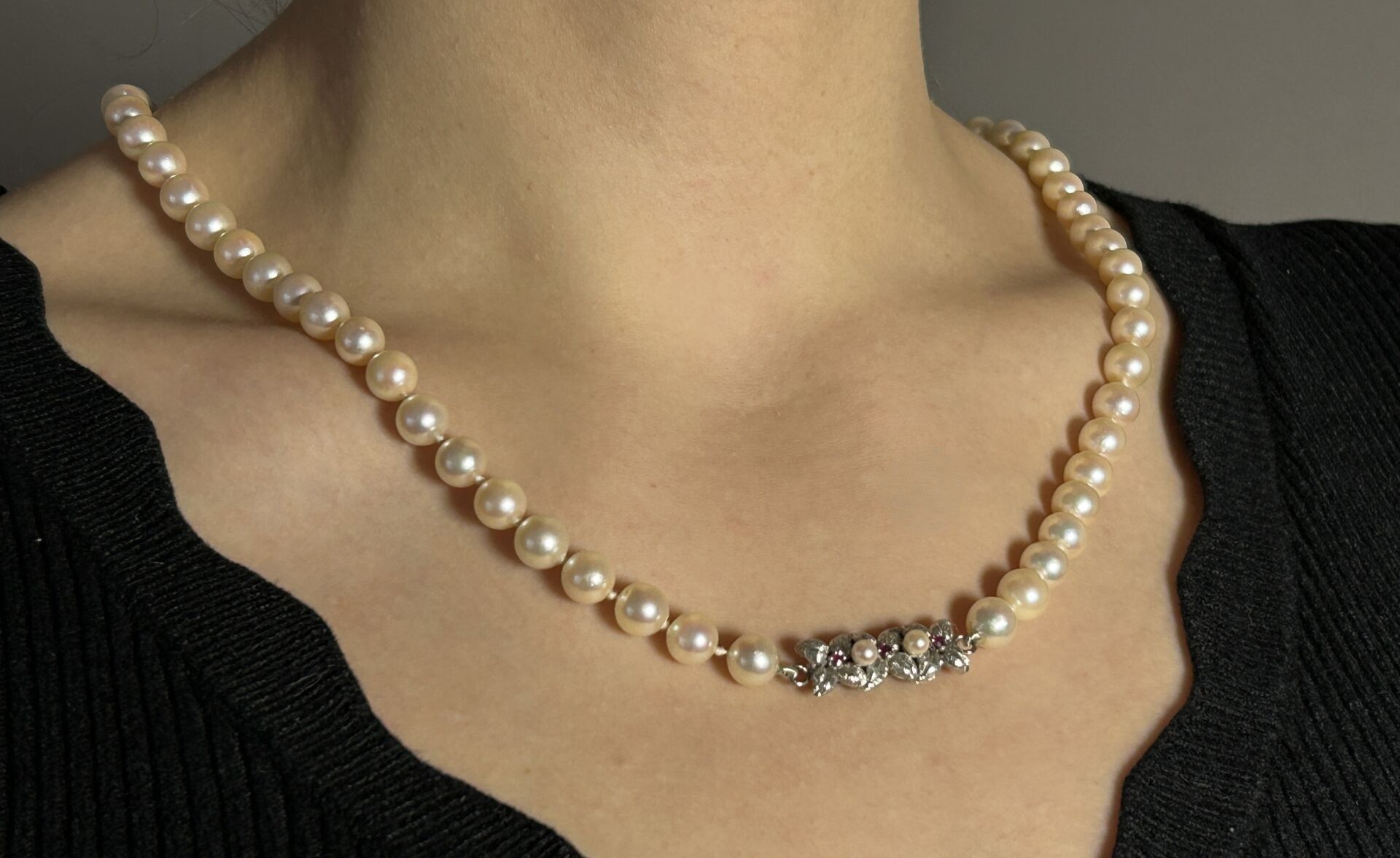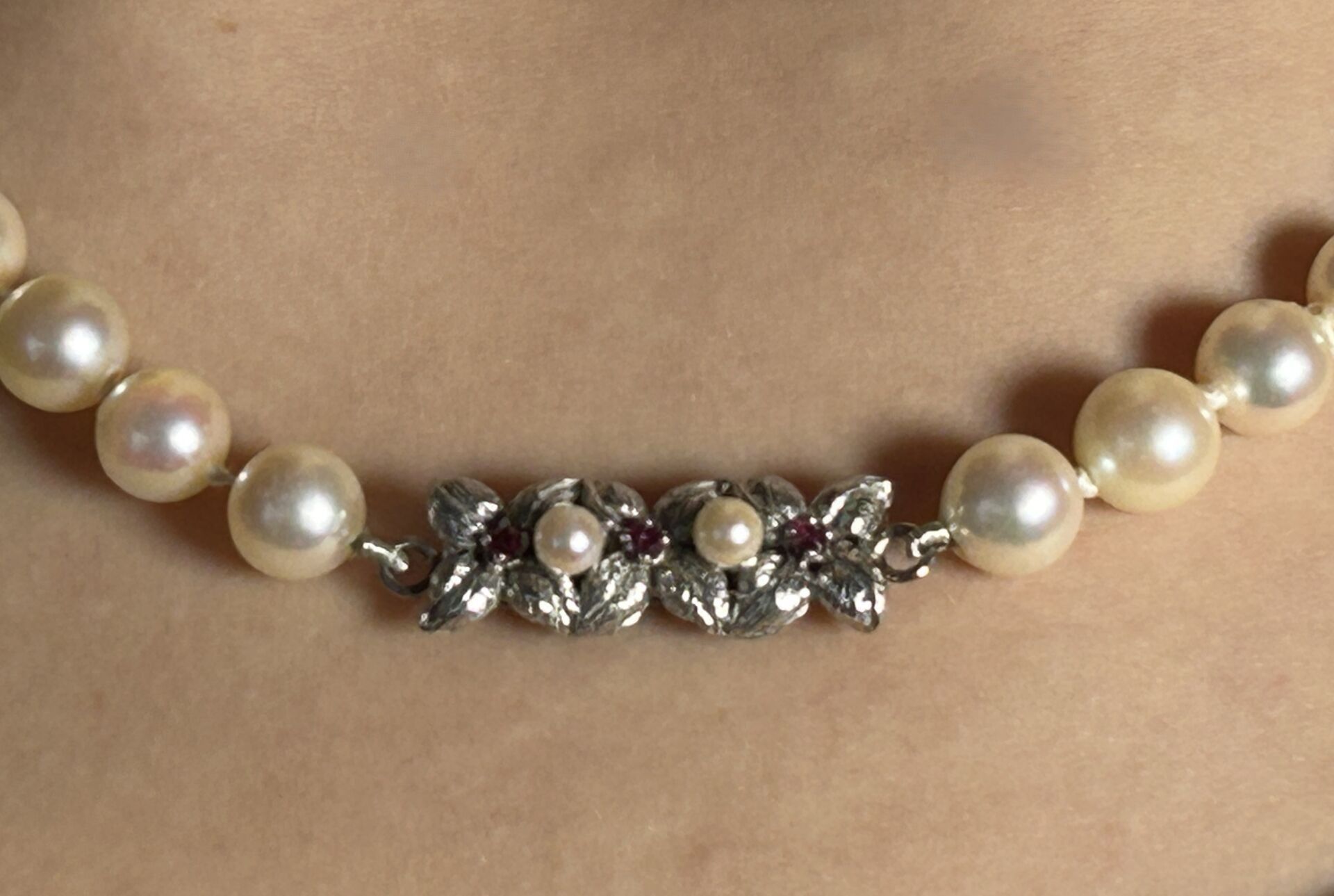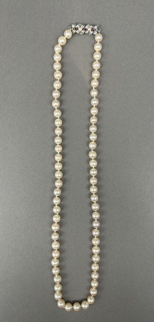 Cultured pearl choker necklace. Attachment in 750°/°° (18 K) white gold set with two small cultured pearls and three small rubies on a foliate background. Eagle head hallmark.