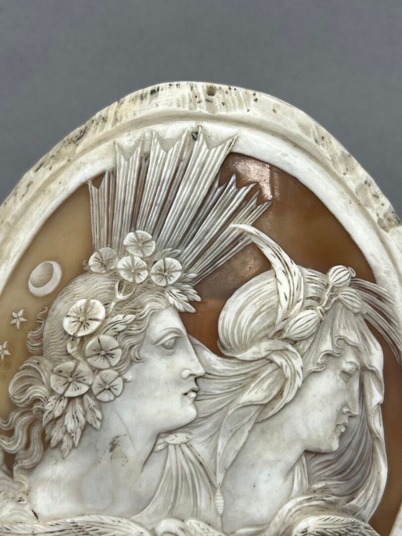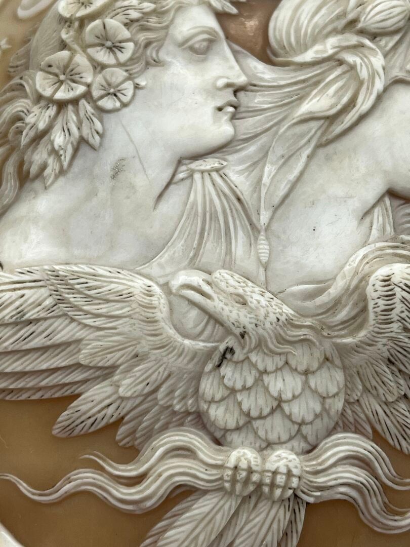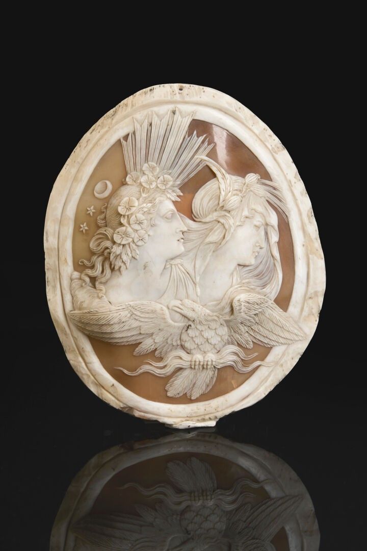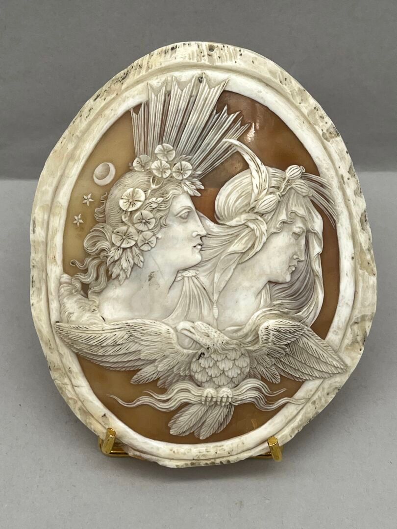 Cameo with an eagle with outstretched wings surmounted by a couple in profile. Shell cameo carved in relief.