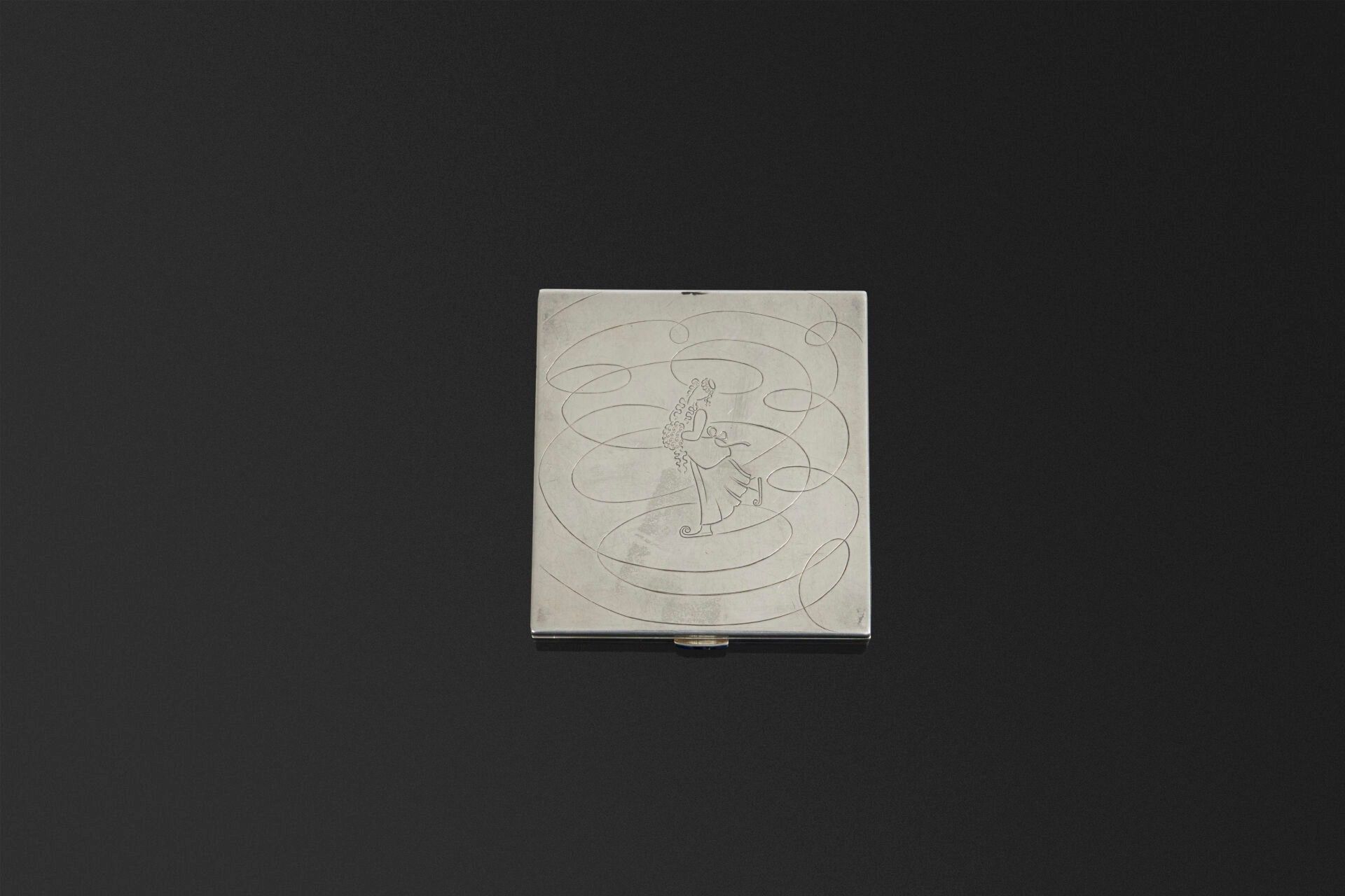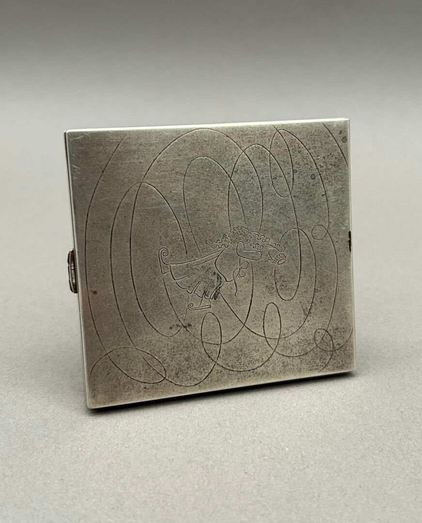 MARCHAK. Rectangular silver poudrier 950 °/°°. Hinged lid decorated with an inner mirror with bevelled edges. Powder compartment concealed by a removable hinged tray. Push button set with a line of three baguette cut blue stones. Exterior engraved with a skater in a muff among scrolls. Signed on the inside front edge "Marchak 3010". Minerva head hallmark and goldsmith's hallmark. Height: 1 cm. Width: 7.5 cm. Depth: 8 cm. Gross weight: 189.5 g. (Minor dents to the corners, missing inner mirror).
