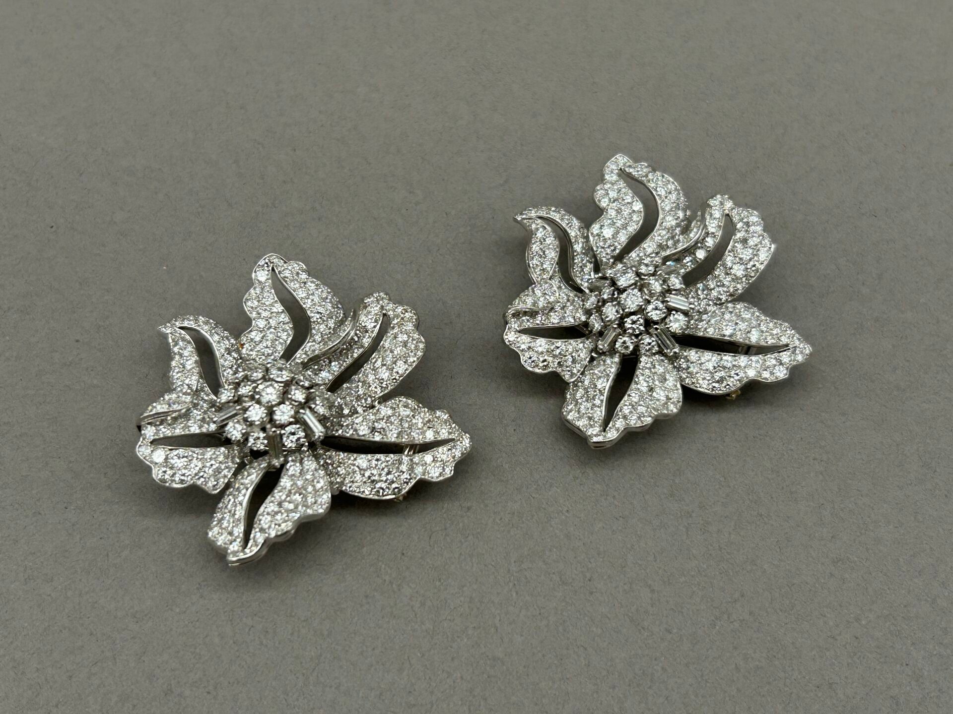 Pair of 750°/°° (18 K) white gold and platinum flower clips, the moving petals and articulated pistils set with round and baguette diamonds.