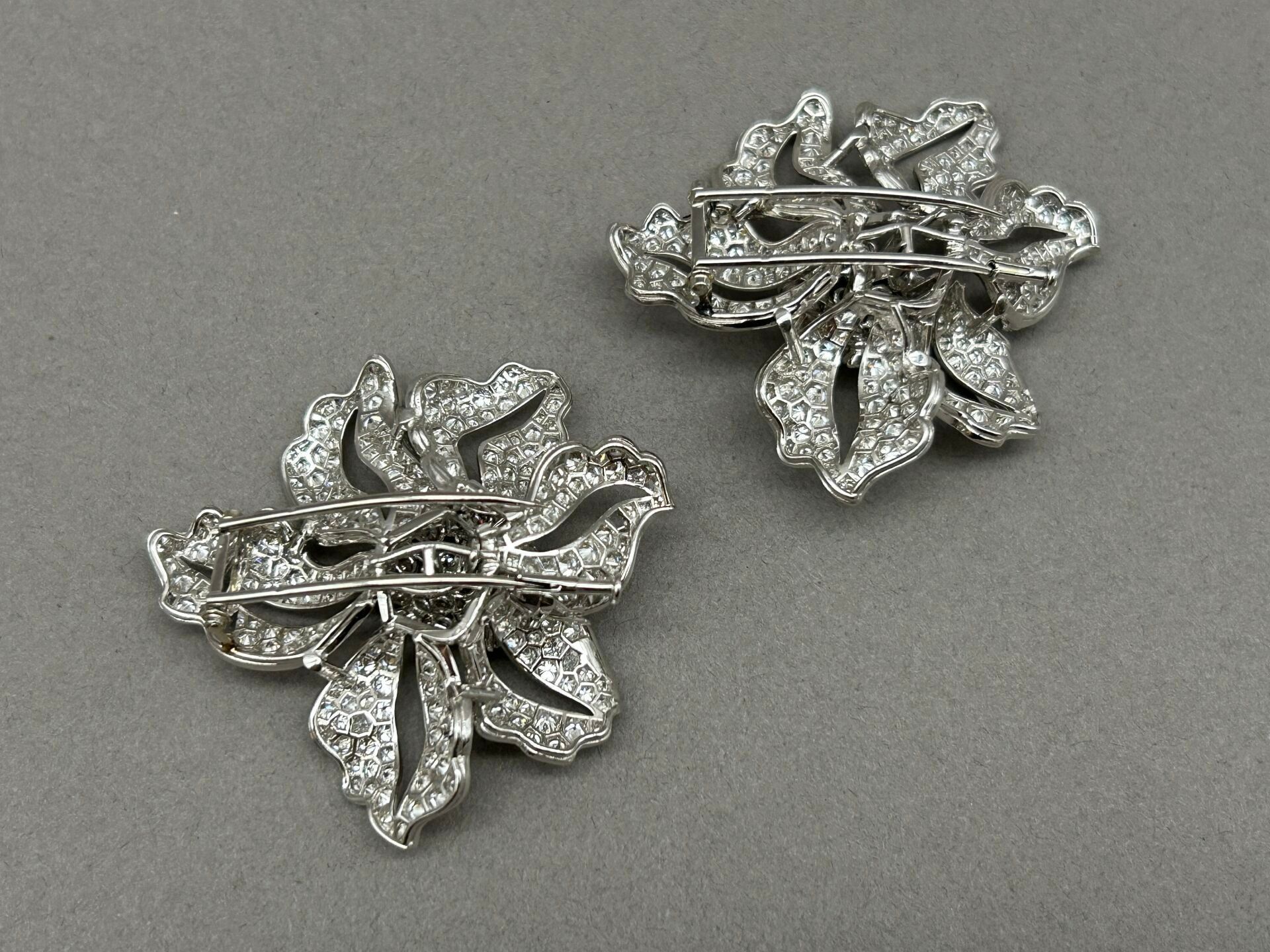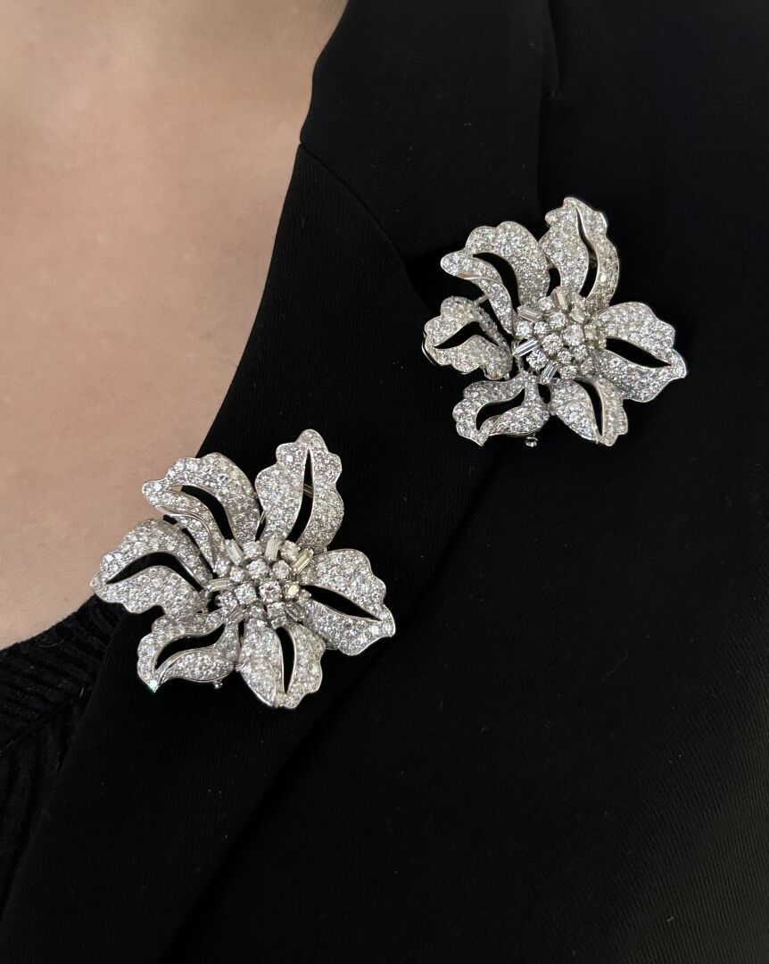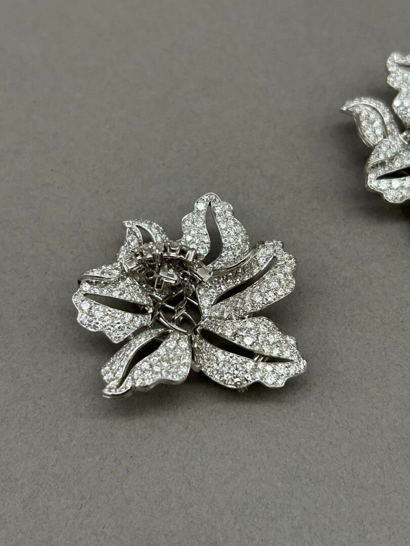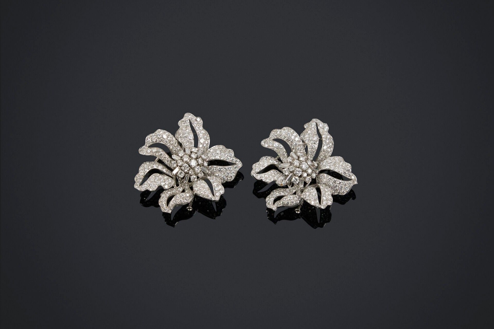 Premium Pair of 750°/°° (18 K) white gold and platinum flower clips,…