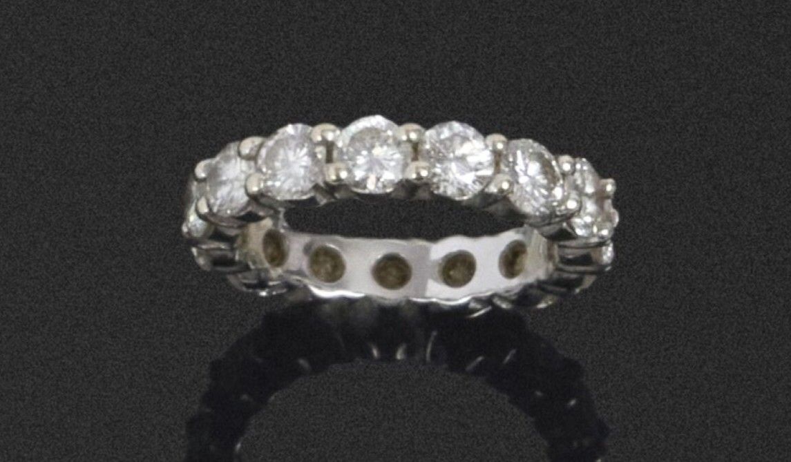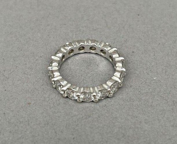 American wedding band in 750°/°° (18 K) white gold set with diamonds totalling approximately three carats.