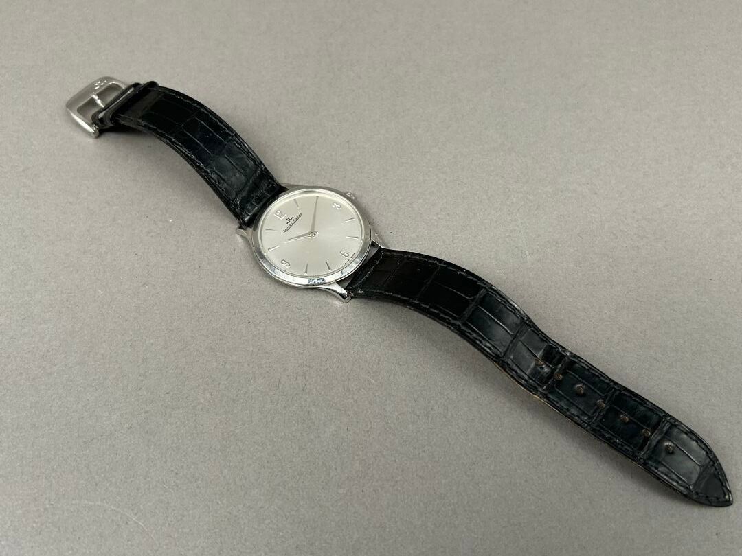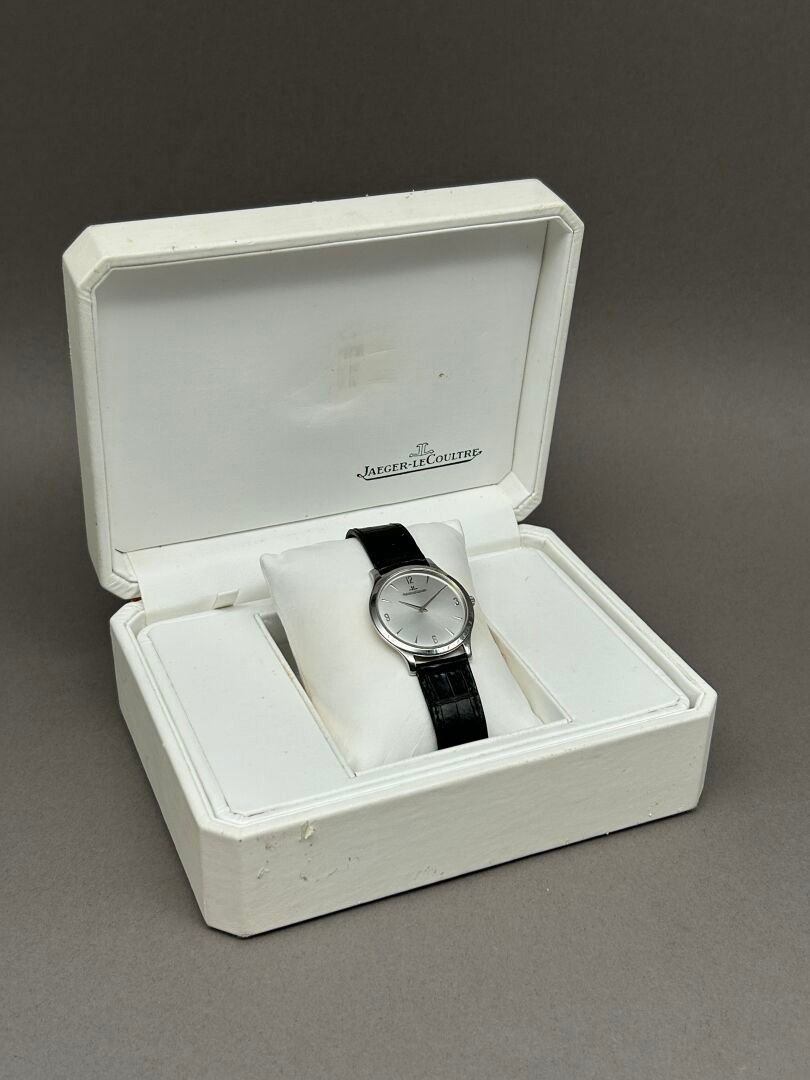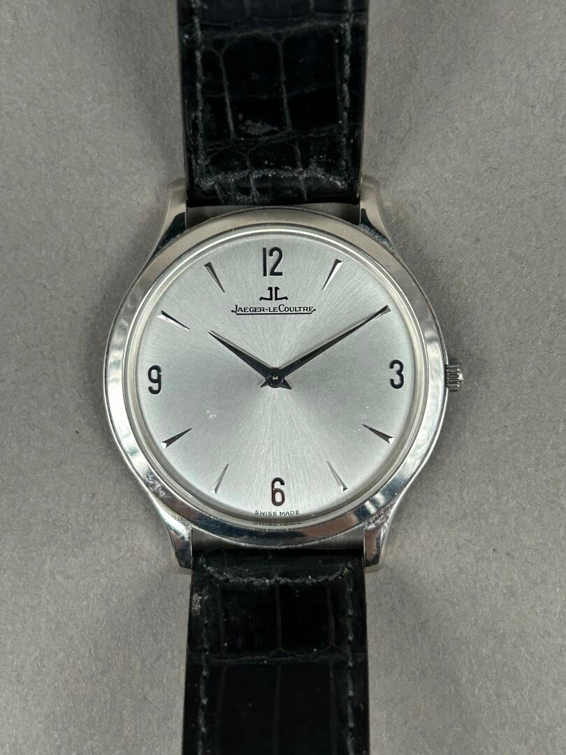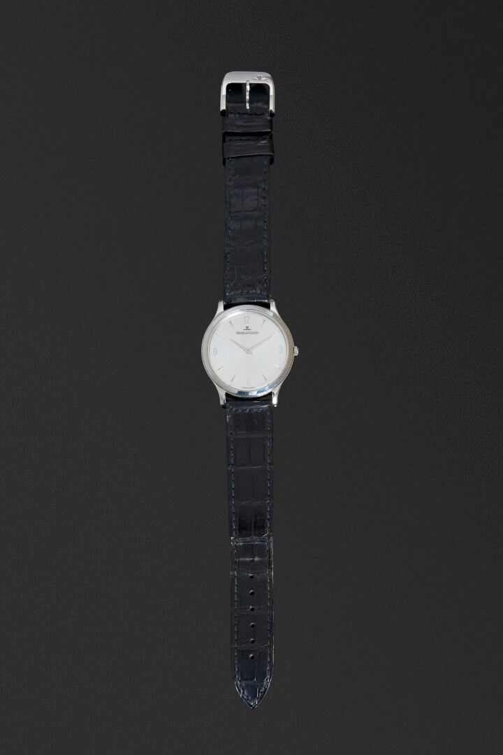Men's wristwatch, "Master Control 1000 hours Ultra Thin" model, reference 145.8.79 / 5 ATM. Extra-flat circular case in polished plain steel with sapphire crystal porthole. Dial showing the hours in Arabic numerals and spear-shaped hour-markers on a matt silvered background. Dauphine hands. Back with four screws. Signed. Case numbered 1604. Black crocodile leather strap (Crocodilia spp. CITES appendix II B) with signed steel pin buckle. In a creamy-white case with the brand name.