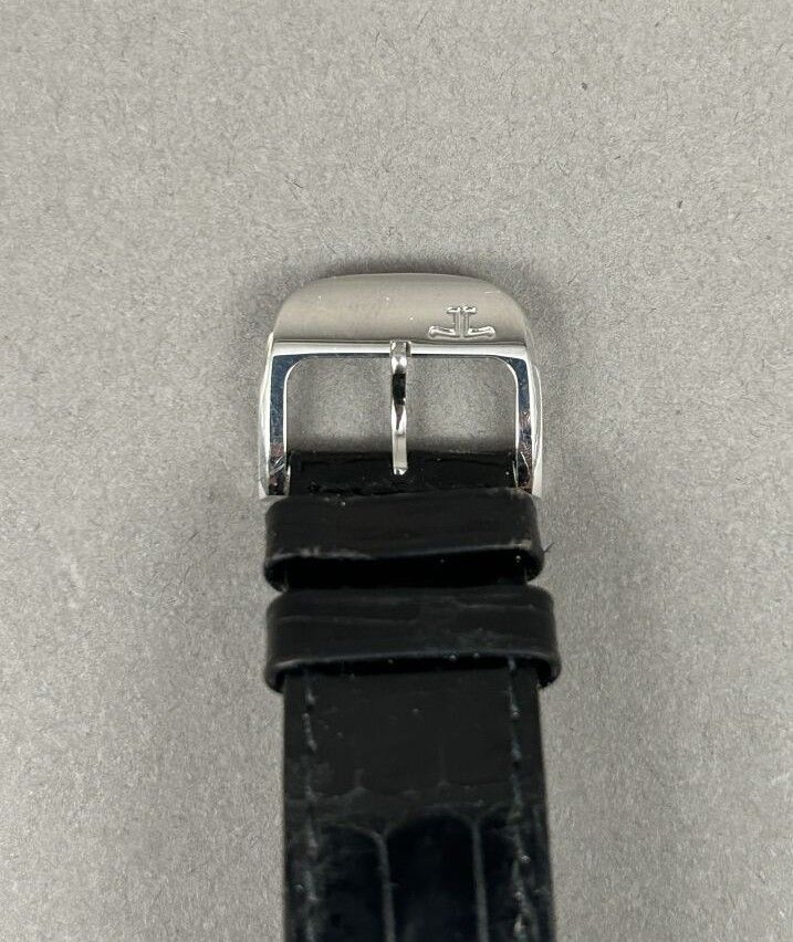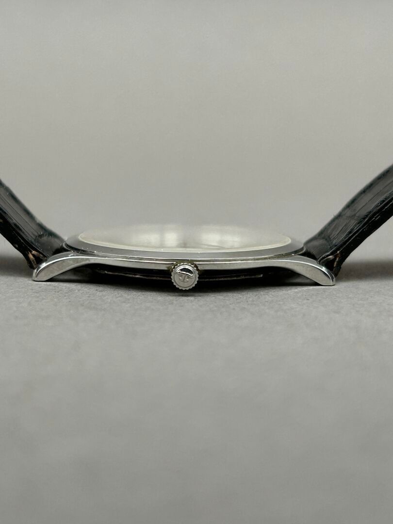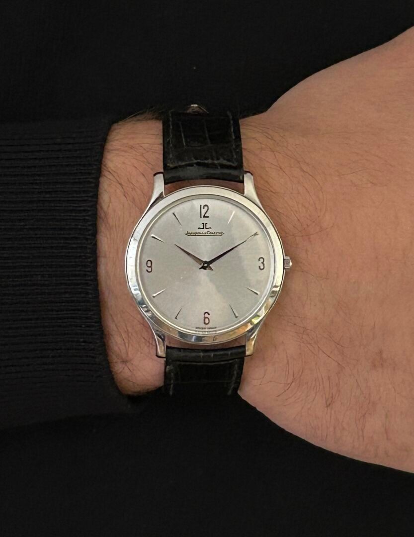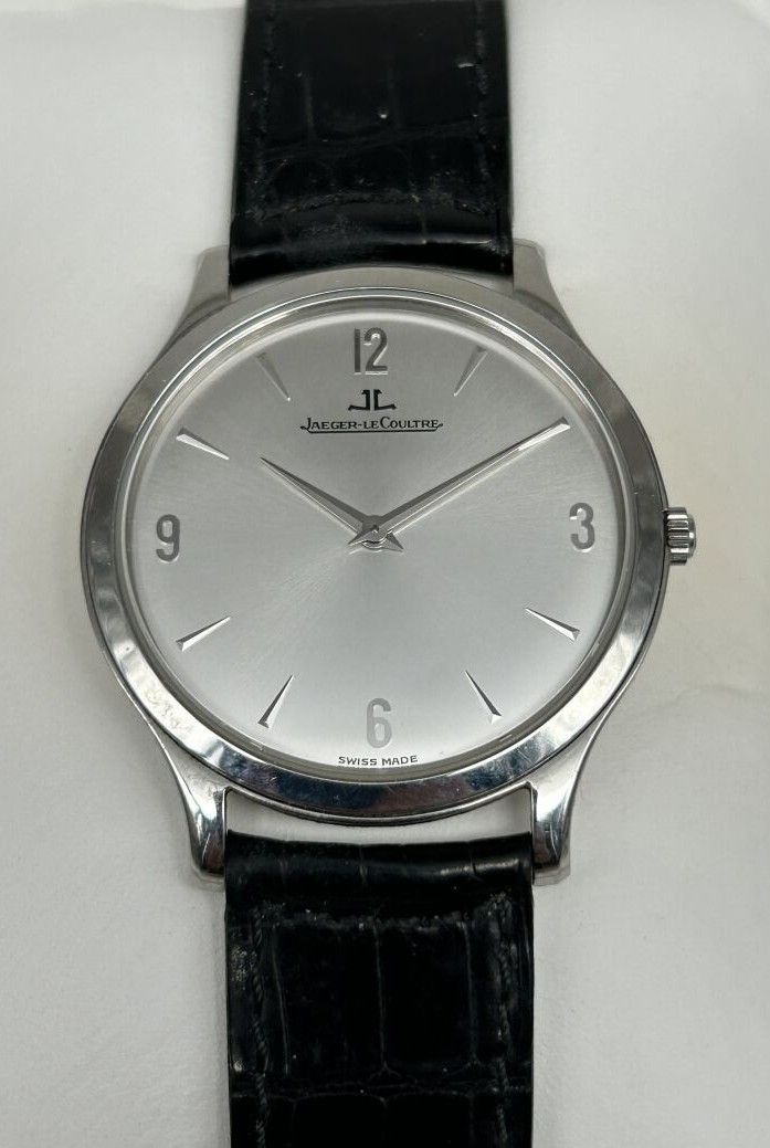 Men's wristwatch, "Master Control 1000 hours Ultra Thin" model, reference 145.8.79 / 5 ATM. Extra-flat circular case in polished plain steel with sapphire crystal porthole. Dial showing the hours in Arabic numerals and spear-shaped hour-markers on a matt silvered background. Dauphine hands. Back with four screws. Signed. Case numbered 1604. Black crocodile leather strap (Crocodilia spp. CITES appendix II B) with signed steel pin buckle. In a creamy-white case with the brand name.