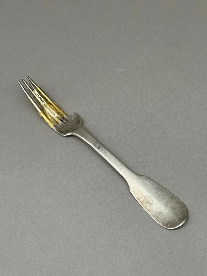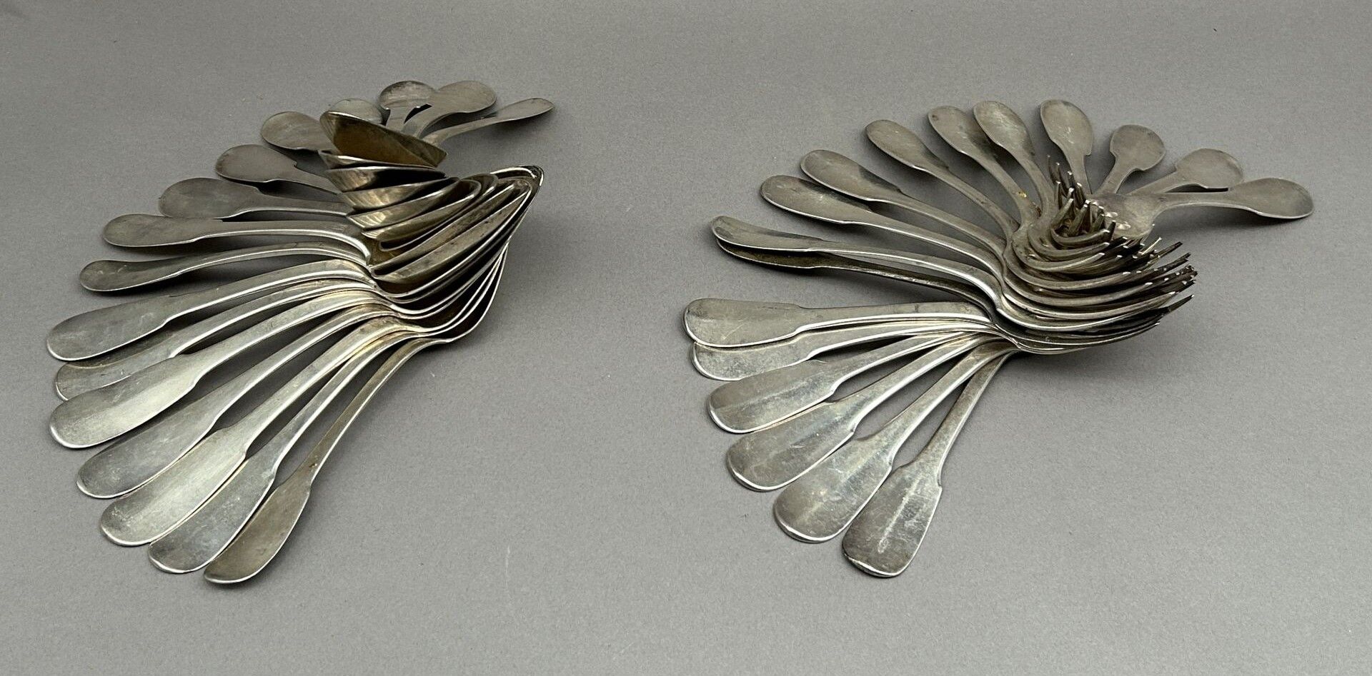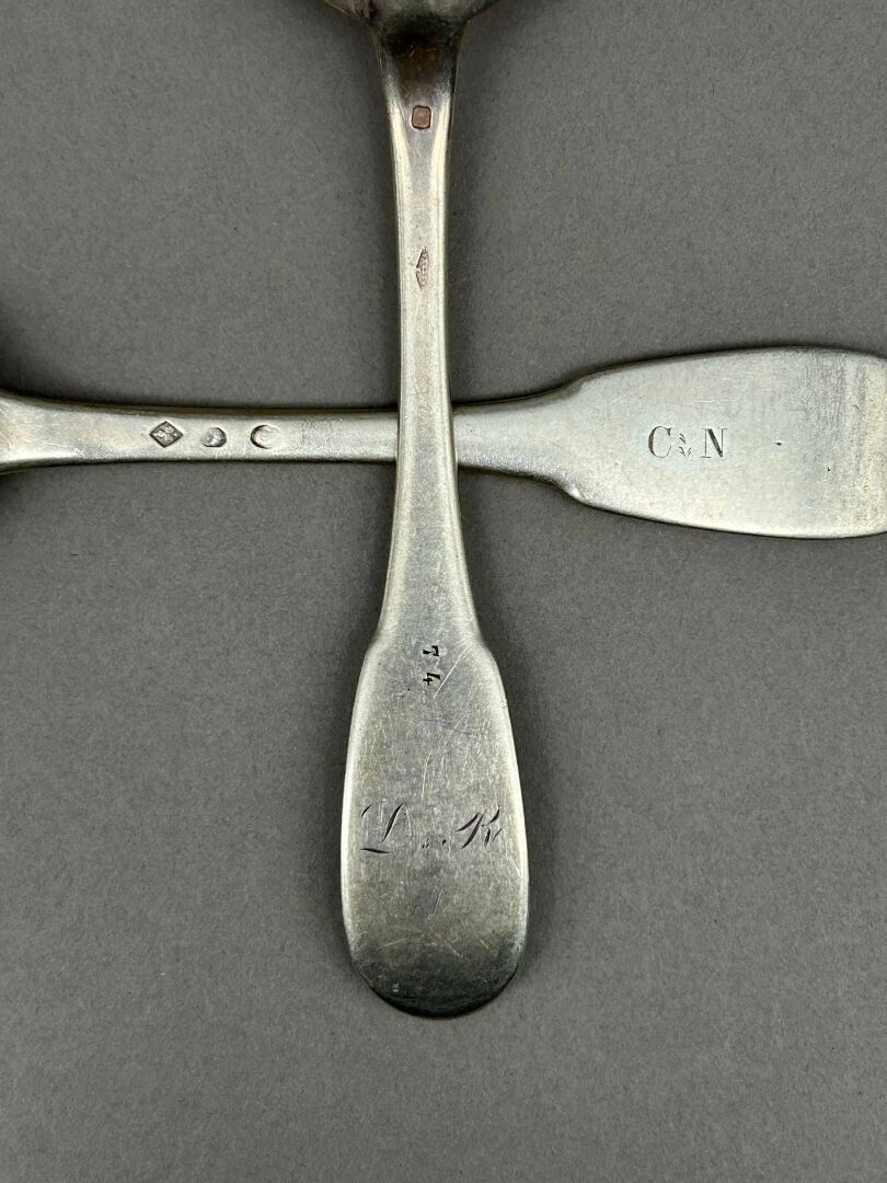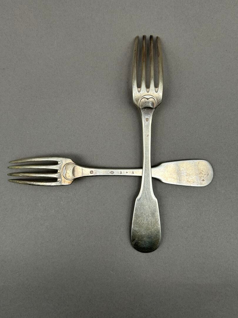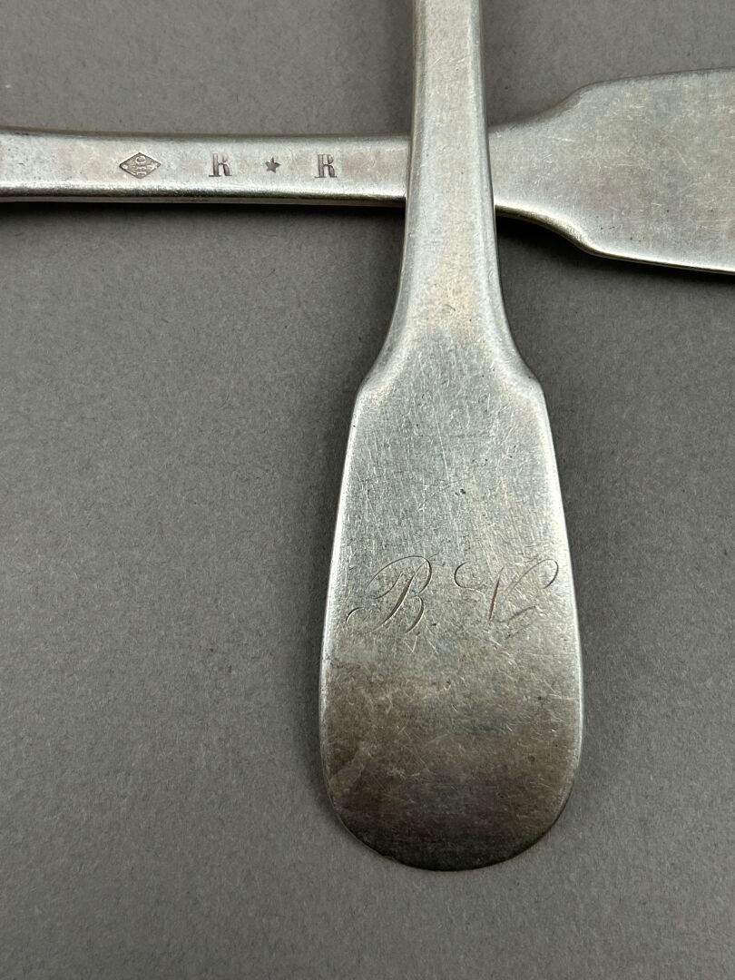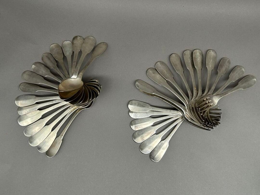 Set of silver cutlery including: 16 soup spoons and 18 large forks. Single-flat model. Some cutlery engraved "Bardy" (3 cutlery sets), "B.N." (10 forks and 4 spoons), C.N. (1 spoon), A.B. (1 place setting), L.R. (1 cutlery set). First cock, Old Man and Minerva head hallmarks.