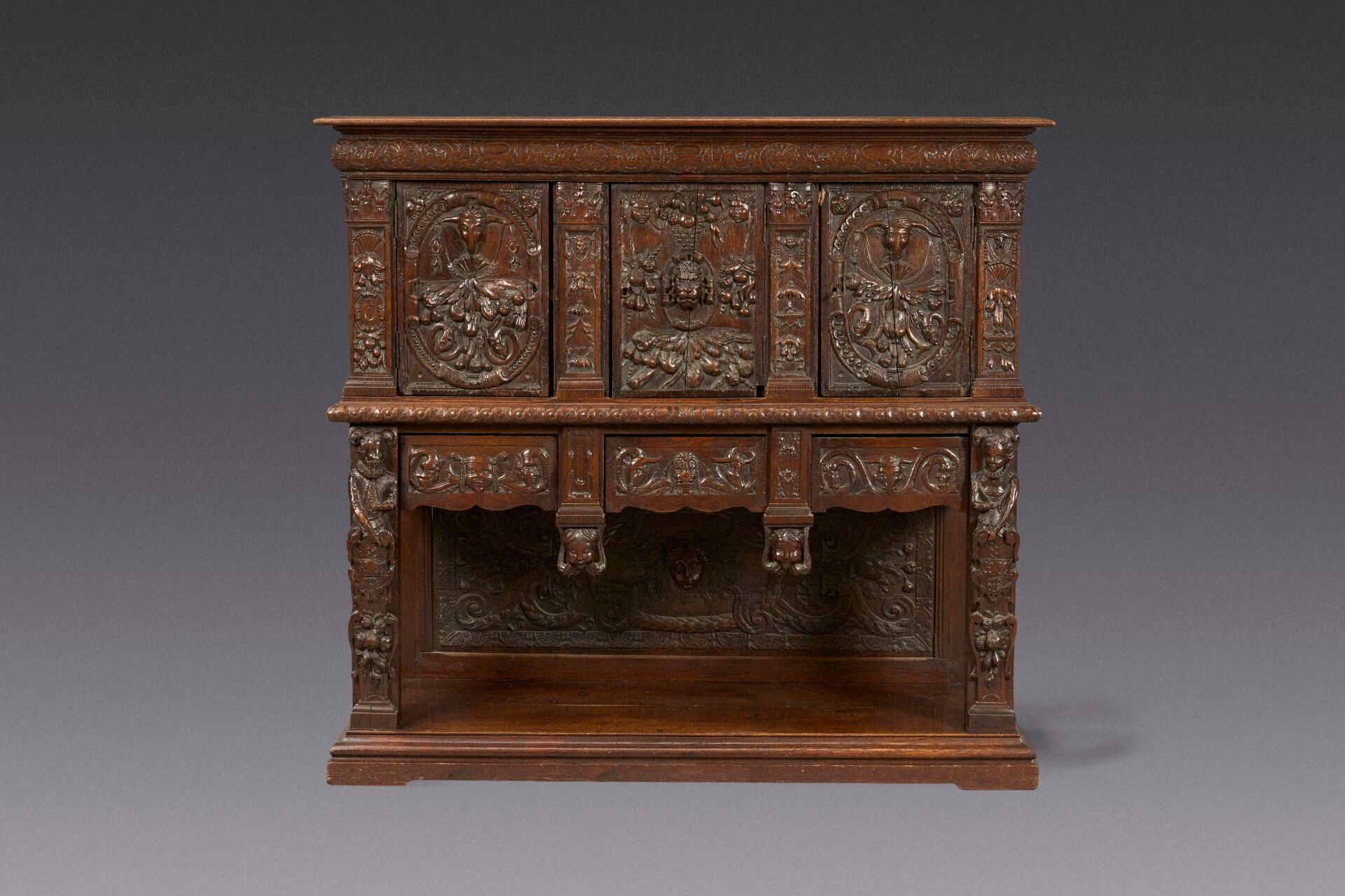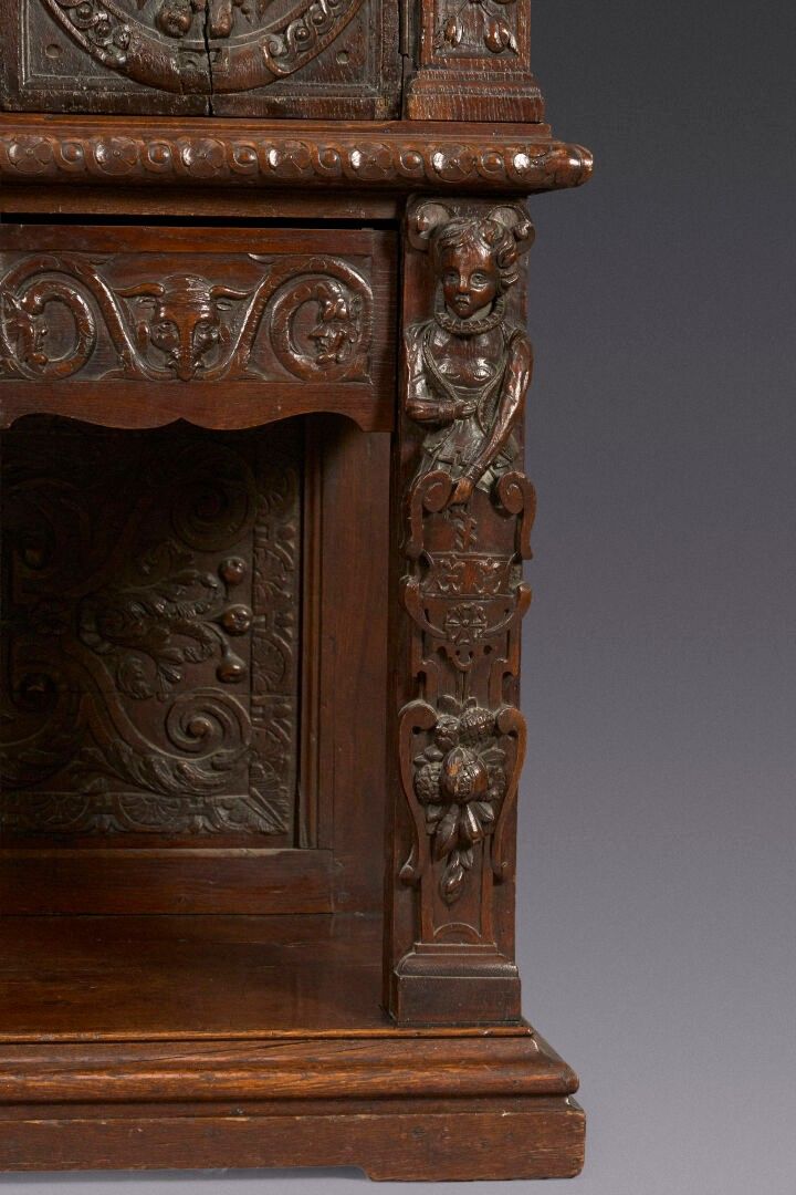 Large straight single cabinet in moulded and carved oak. Opens at the top with three leaves. The lower part has three drawers. Decorated in relief with ram or lion heads, fruit baskets, garlands, masks and foliage. Front jambs decorated with figures in term. Napkin pleat sides. Resting on a plinth base.