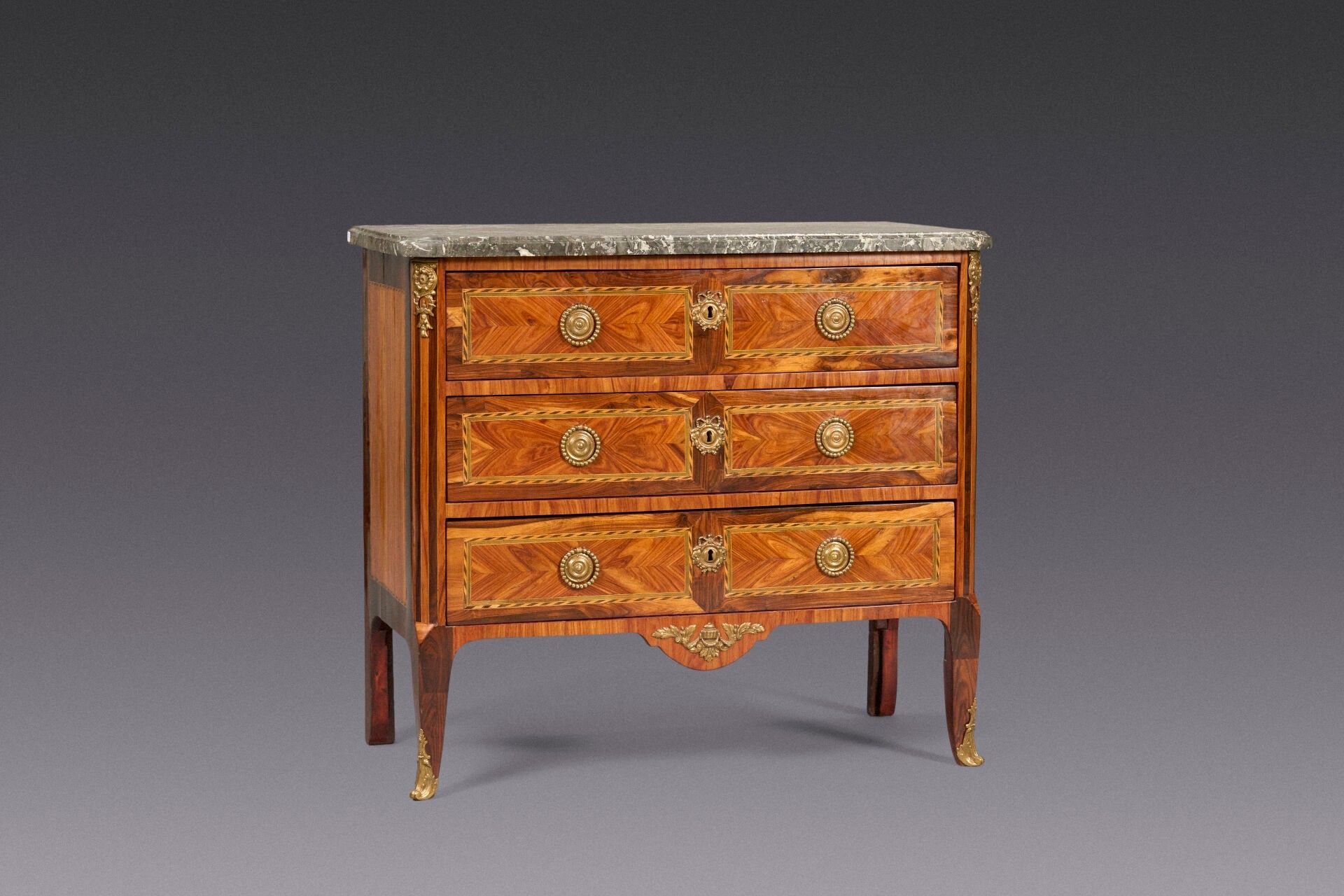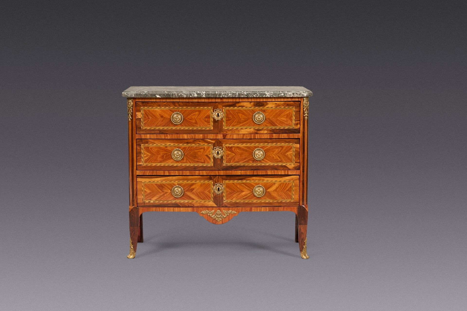 Rosewood, violet wood and stained wood veneer straight chest of drawers. Opens with three drawers. Flat front mounts with simulated fluting. Apron with cul-de-lampe. Curved front legs. Decorated with butterfly wings in rectangular frames edged with ribbon motifs.