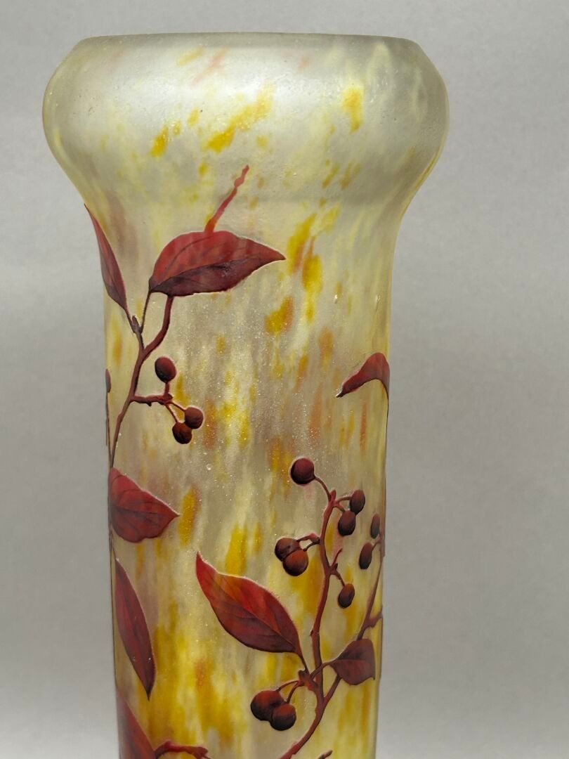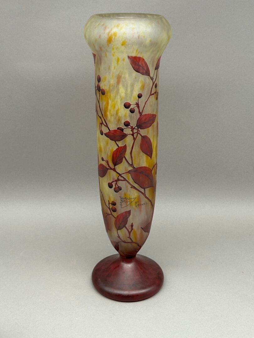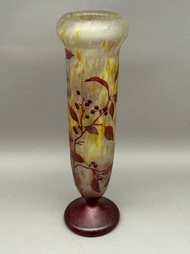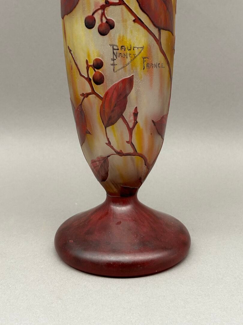 Conical vase with swollen neck on pedestal. Proof in purplish-red lined glass on an orange-yellow marbled ground. Décor of branches and berries engraved in cameo with acid and enhanced with enamels. Signed and dated Nancy-France.