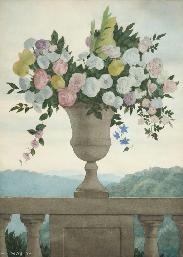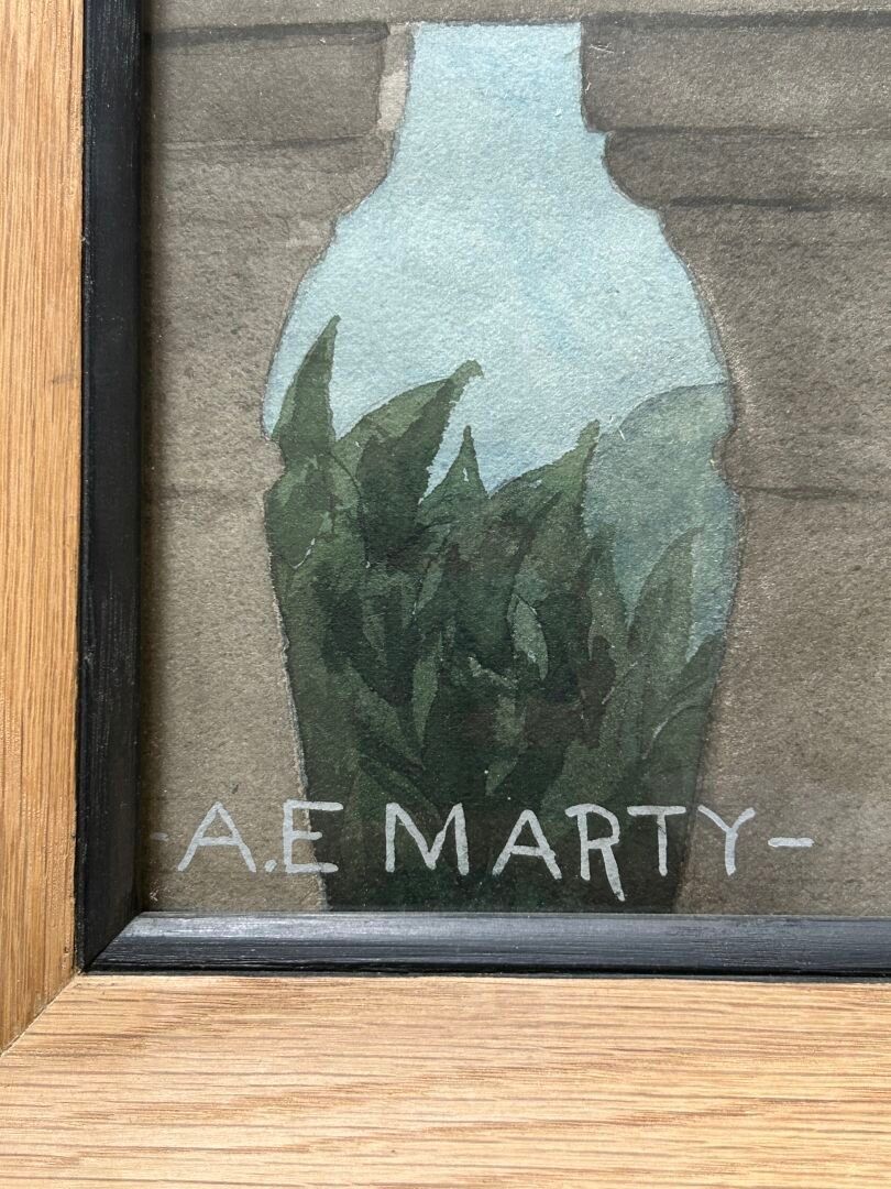 Pencil, ink and watercolour on paper, signed lower left. Under glass frame.
