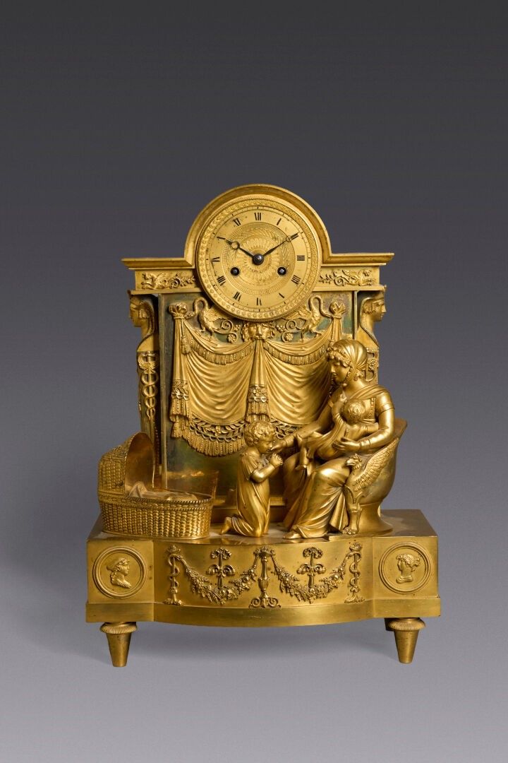 An ormolu and chased bronze "La maternité" clock depicting the Duchesse de Berry breastfeeding the Duc de Bordeaux, with her daughter Louise praying in front of the bassinet. The bronze dial shows the hours in Roman numerals and forms the pediment of an architectural design decorated with drapery and swans, the caryatid uprights surmounted by Egyptian heads. It stands on a base with an arched projection decorated with garlands, flowers and profiles in medallions, and finished with tapered legs.