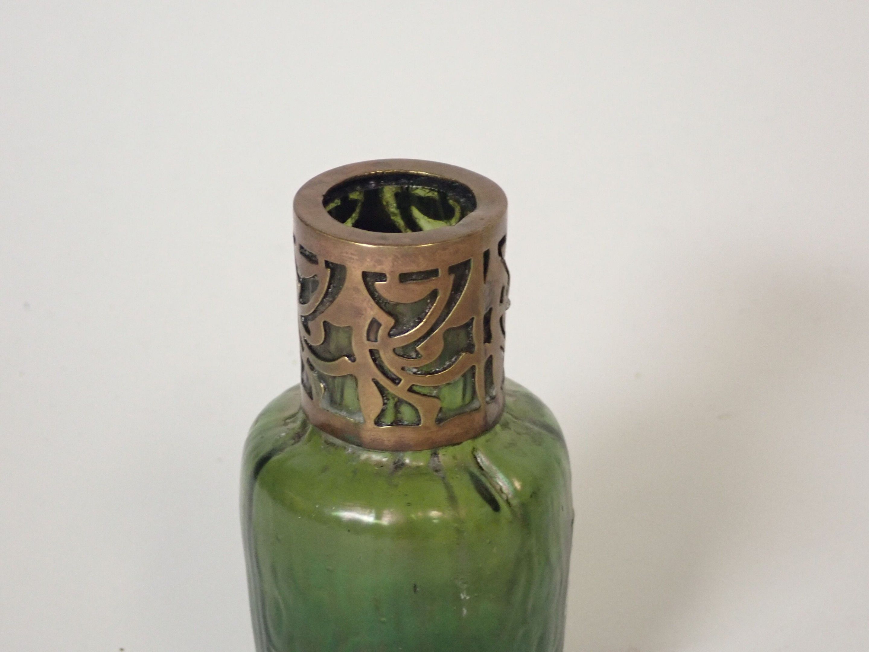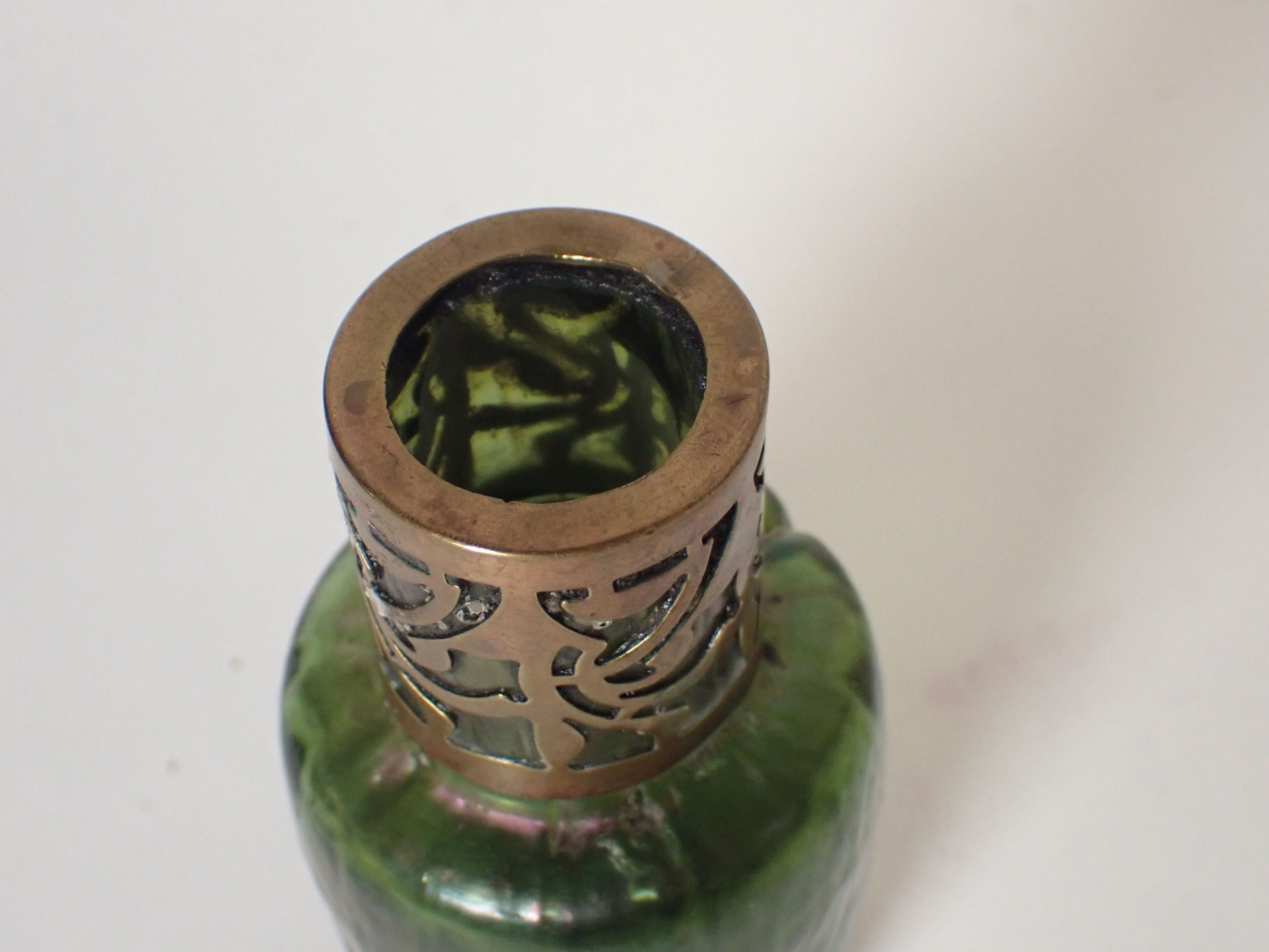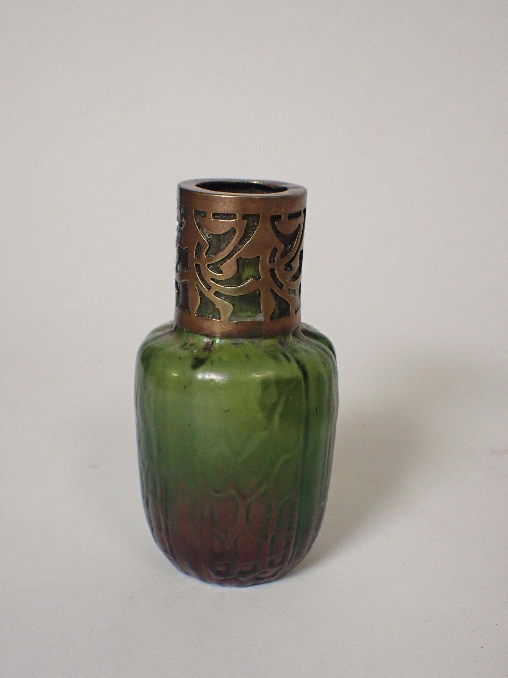 In the taste of LOETZ, circa 1900. Small Art Nouveau baluster vase in iridescent glass, bronze openwork mounting.
