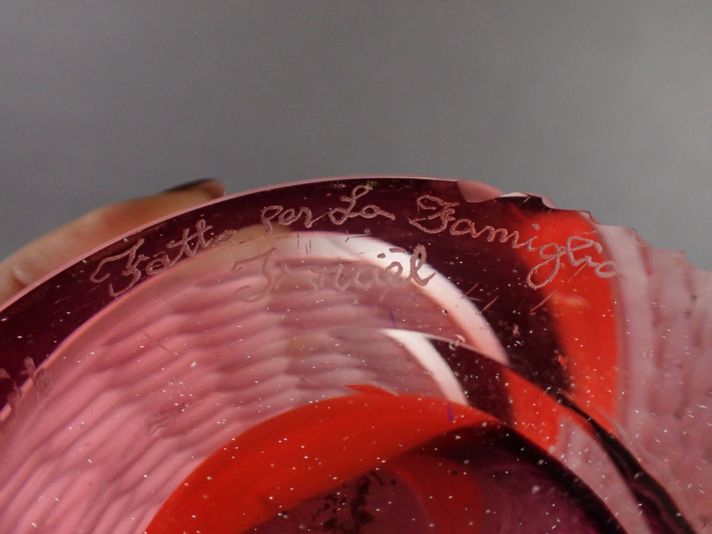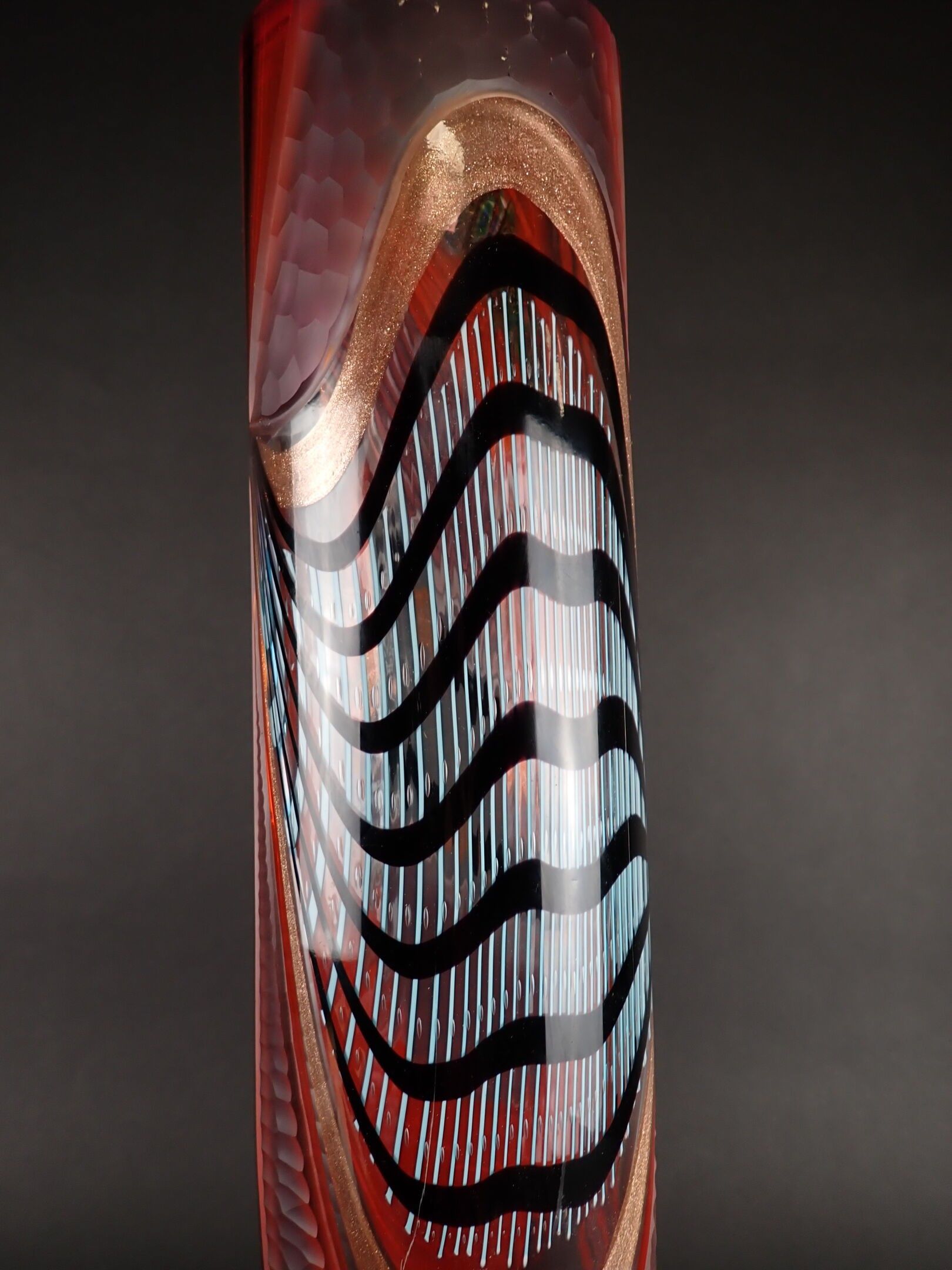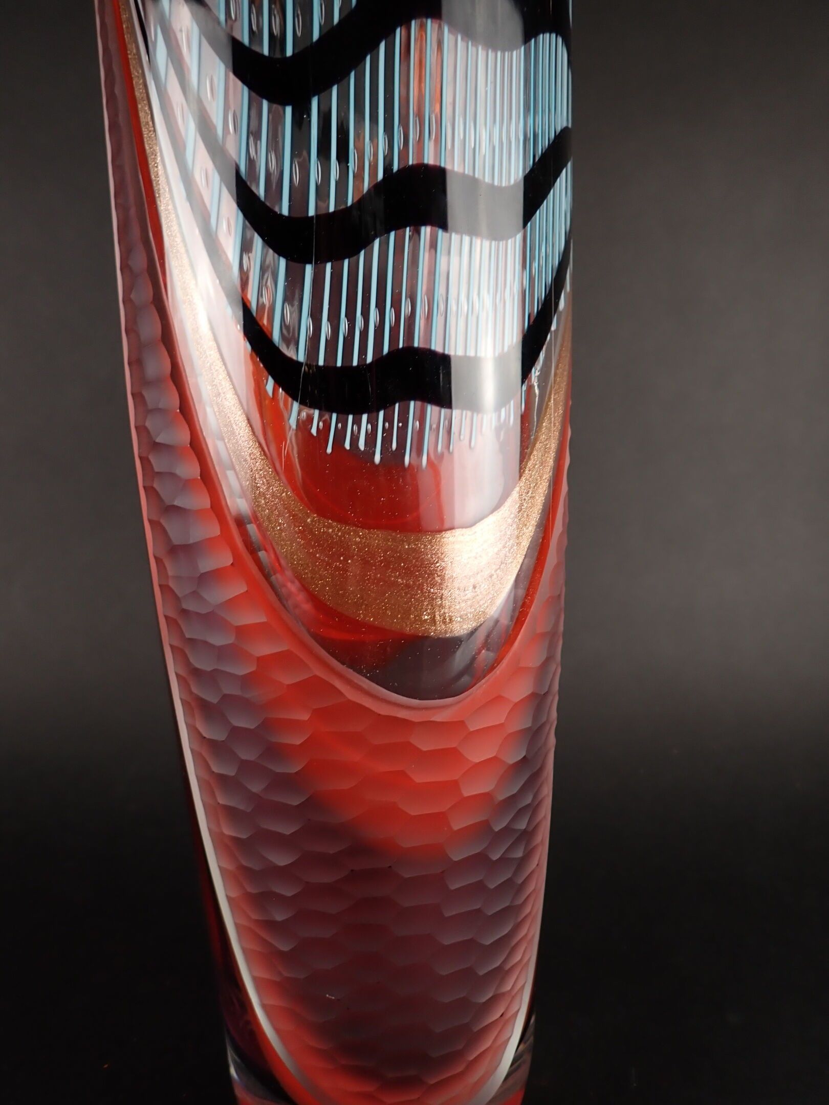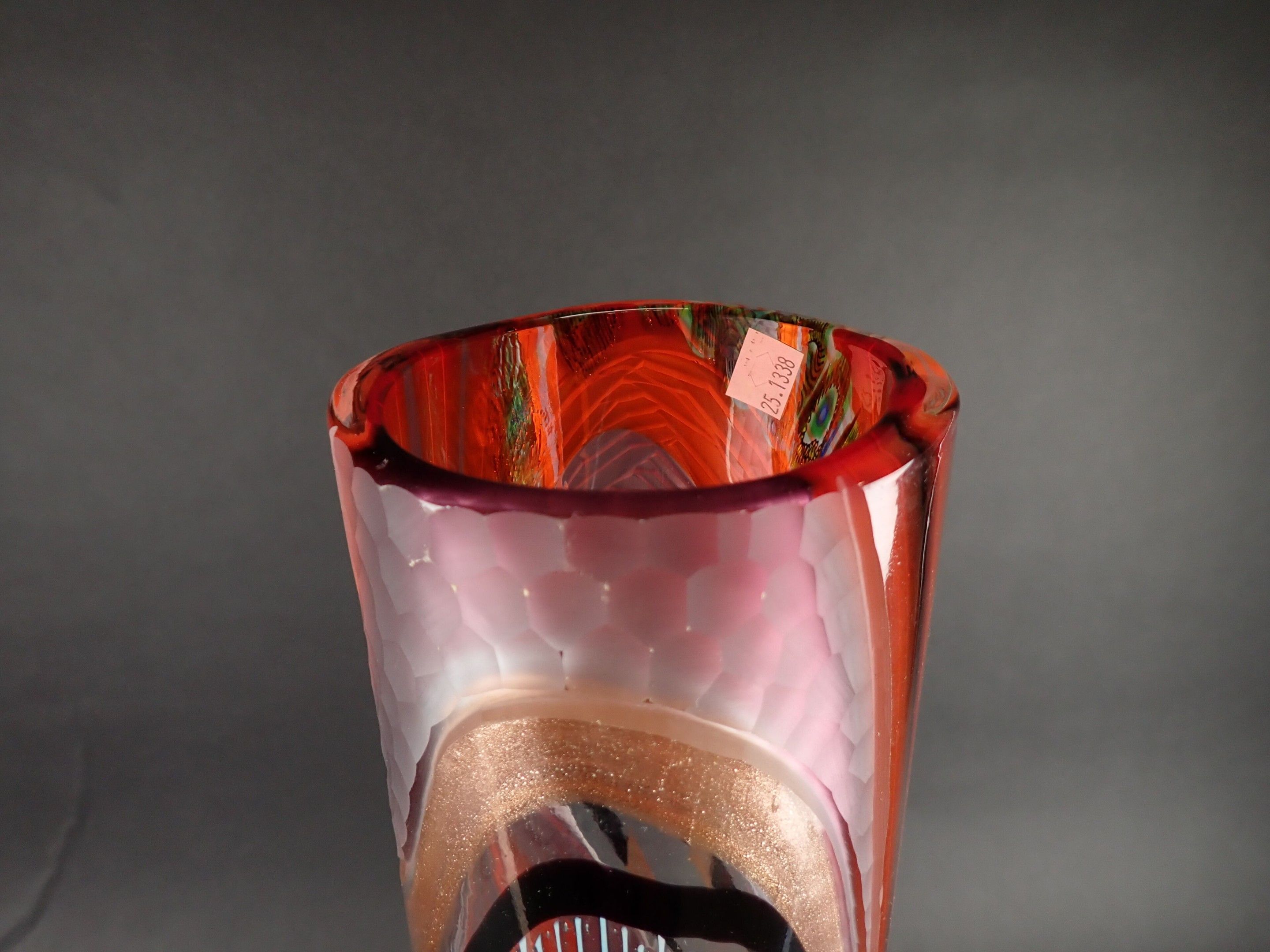 ART GLASS STUDIO. Large Murano vase with attractive polychrome multi-layered decoration including gold spangles, and engraved with a millstone, signed Al... Berigo, signed: "Fatto per la famiglia XX"- Height: 60 cm