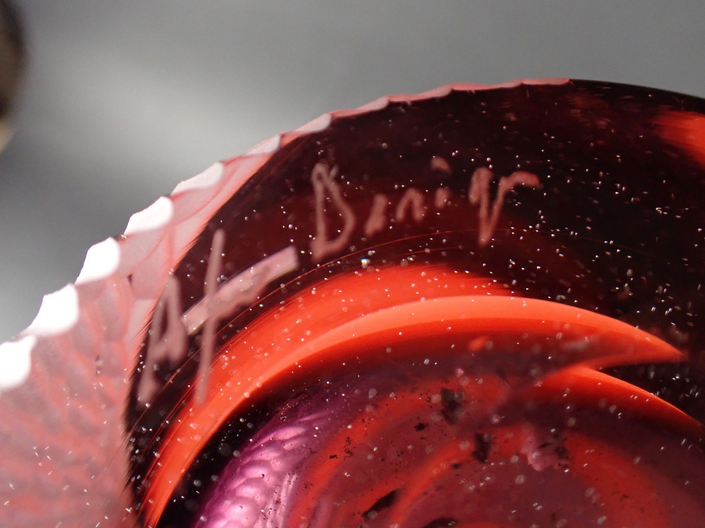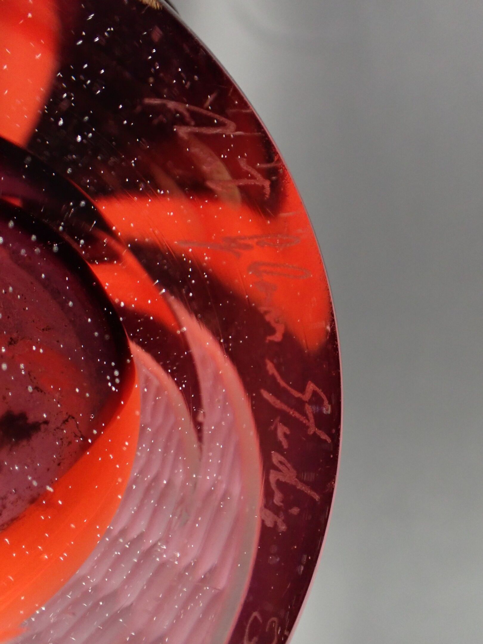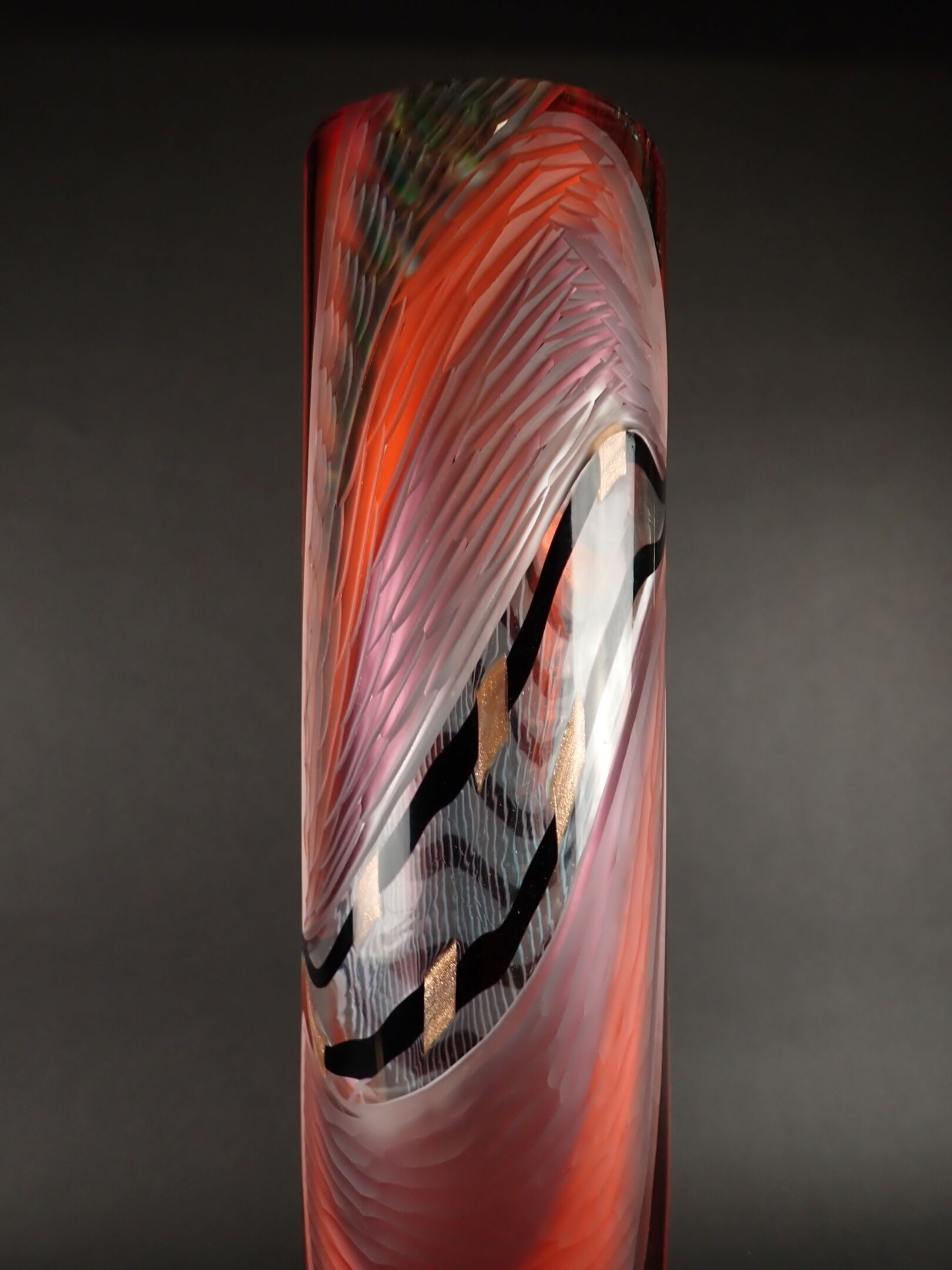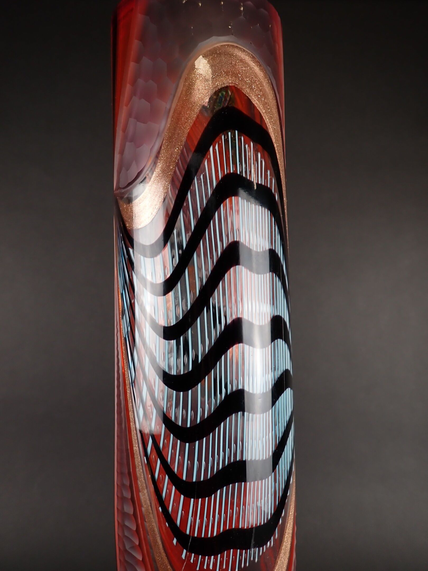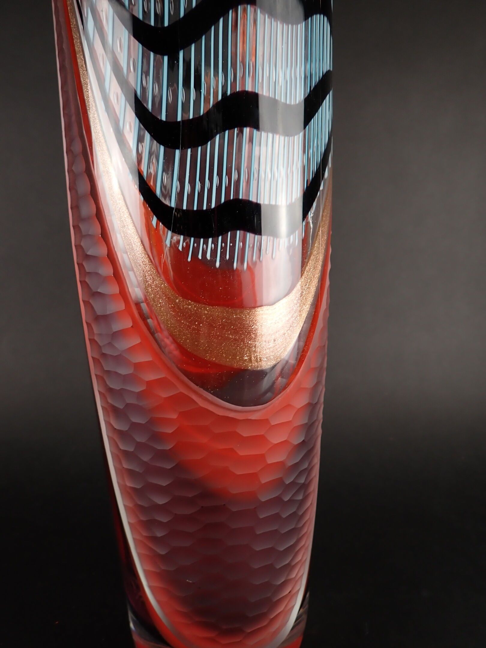 ART GLASS STUDIO. Large Murano vase with attractive polychrome multi-layered decoration including gold spangles, and engraved with a millstone, signed Al... Berigo, signed: "Fatto per la famiglia XX"- Height: 60 cm
