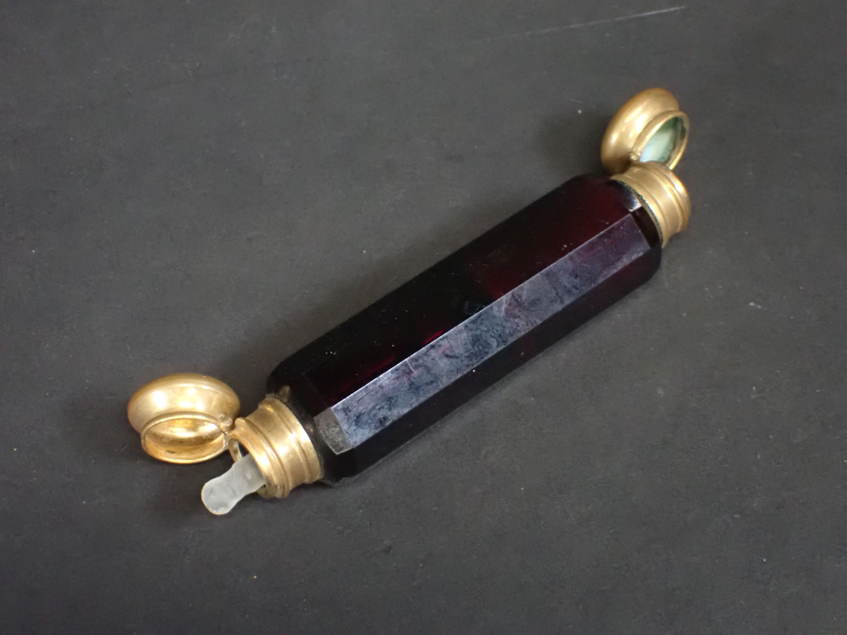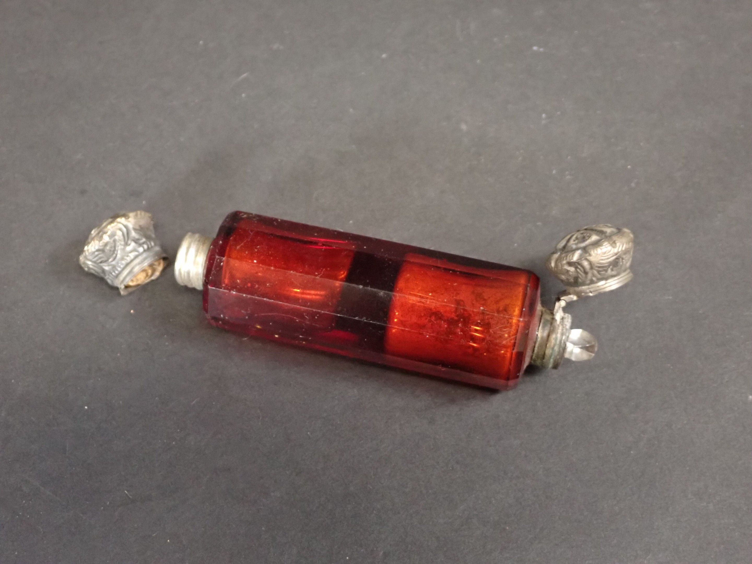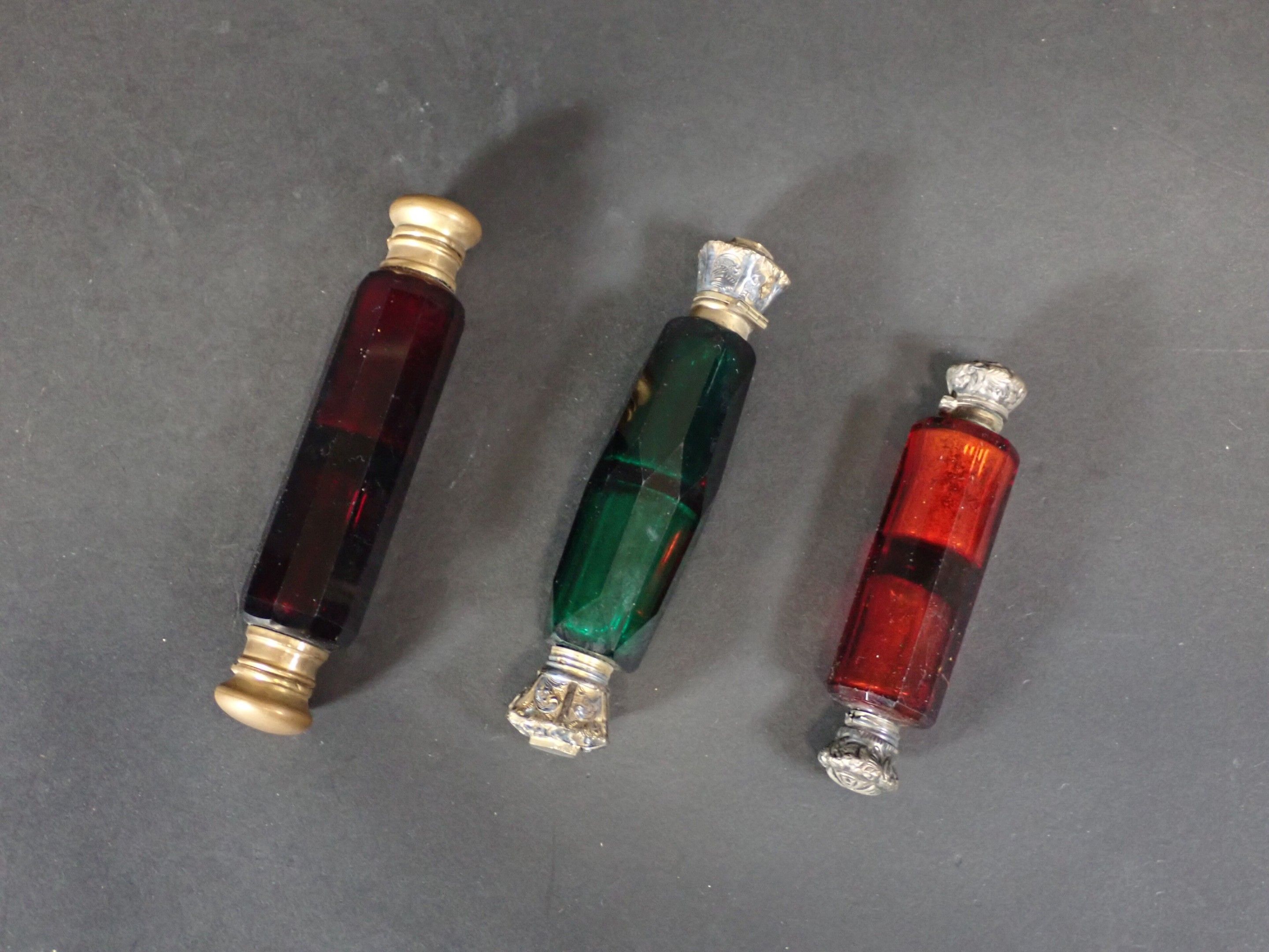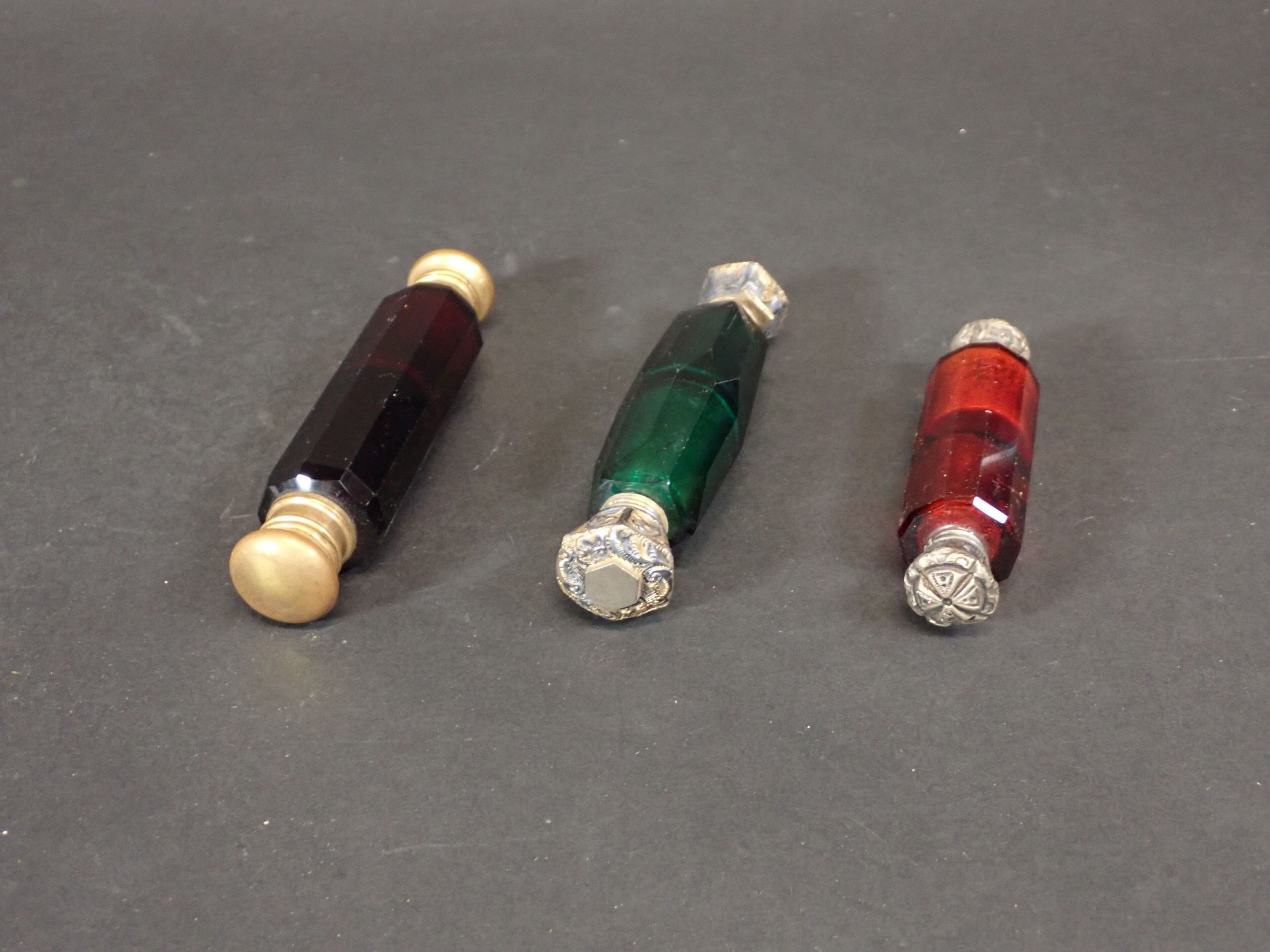 Set of 3 late 19th century salt bottles with double compartments in coloured glass and double metal stoppers - Length 13 to 10 cm (wear)