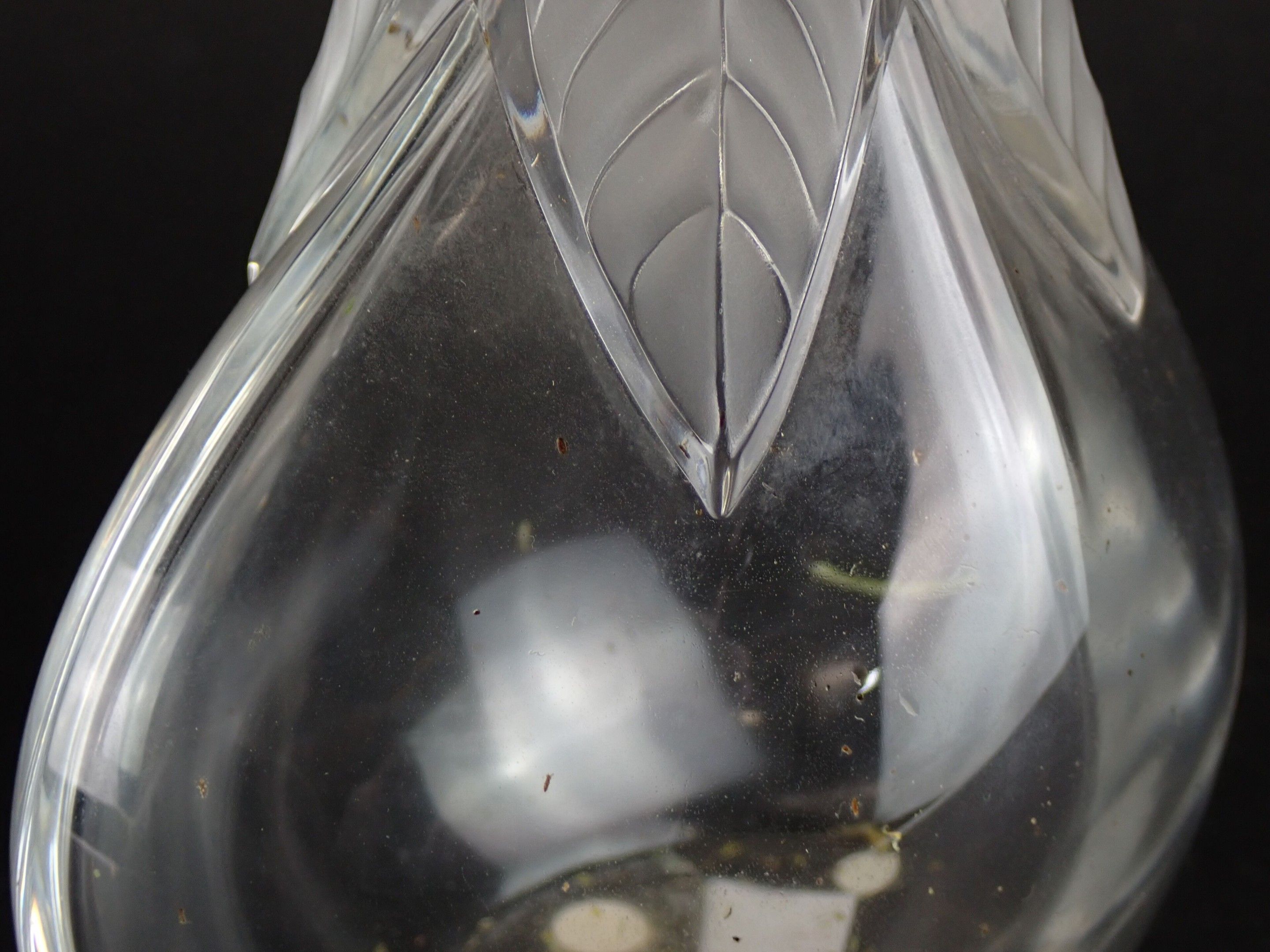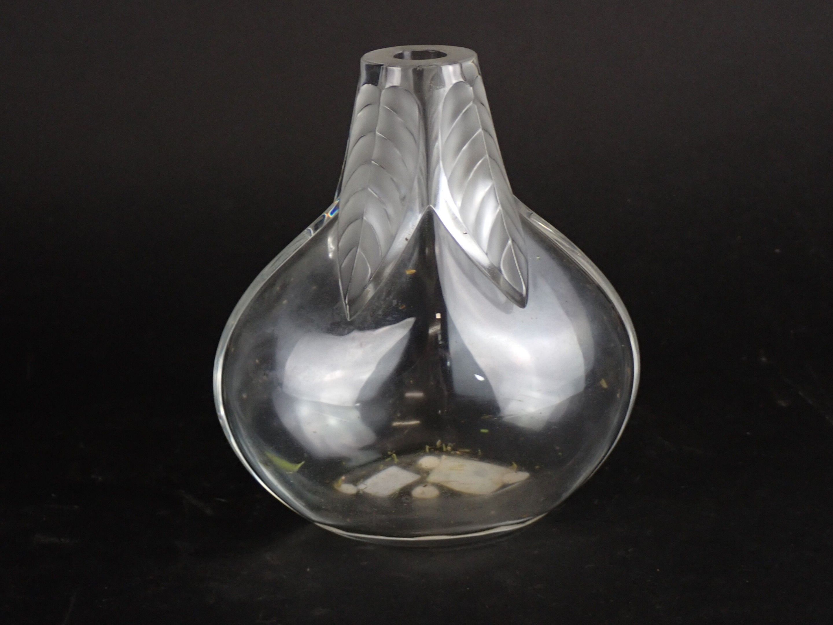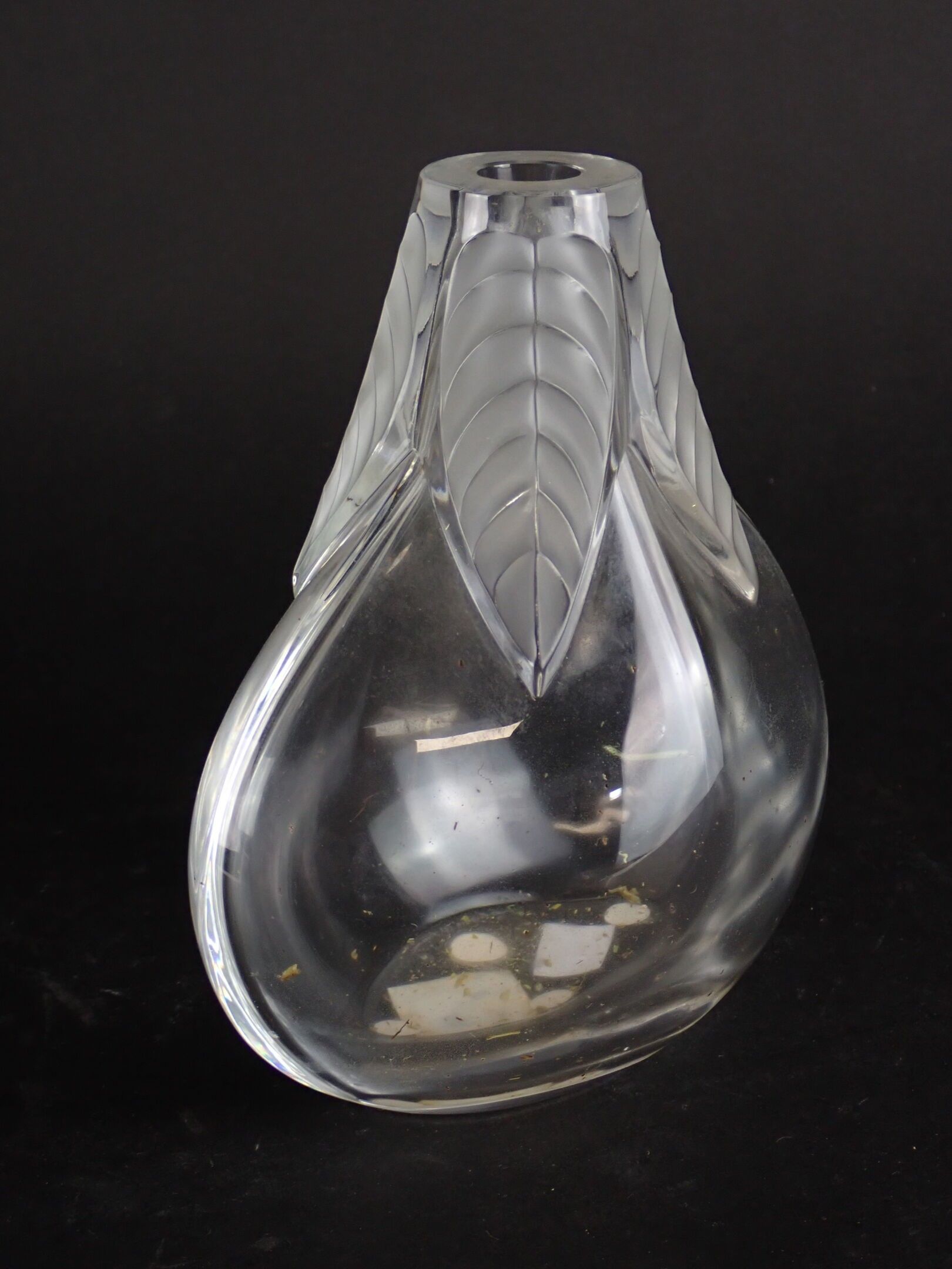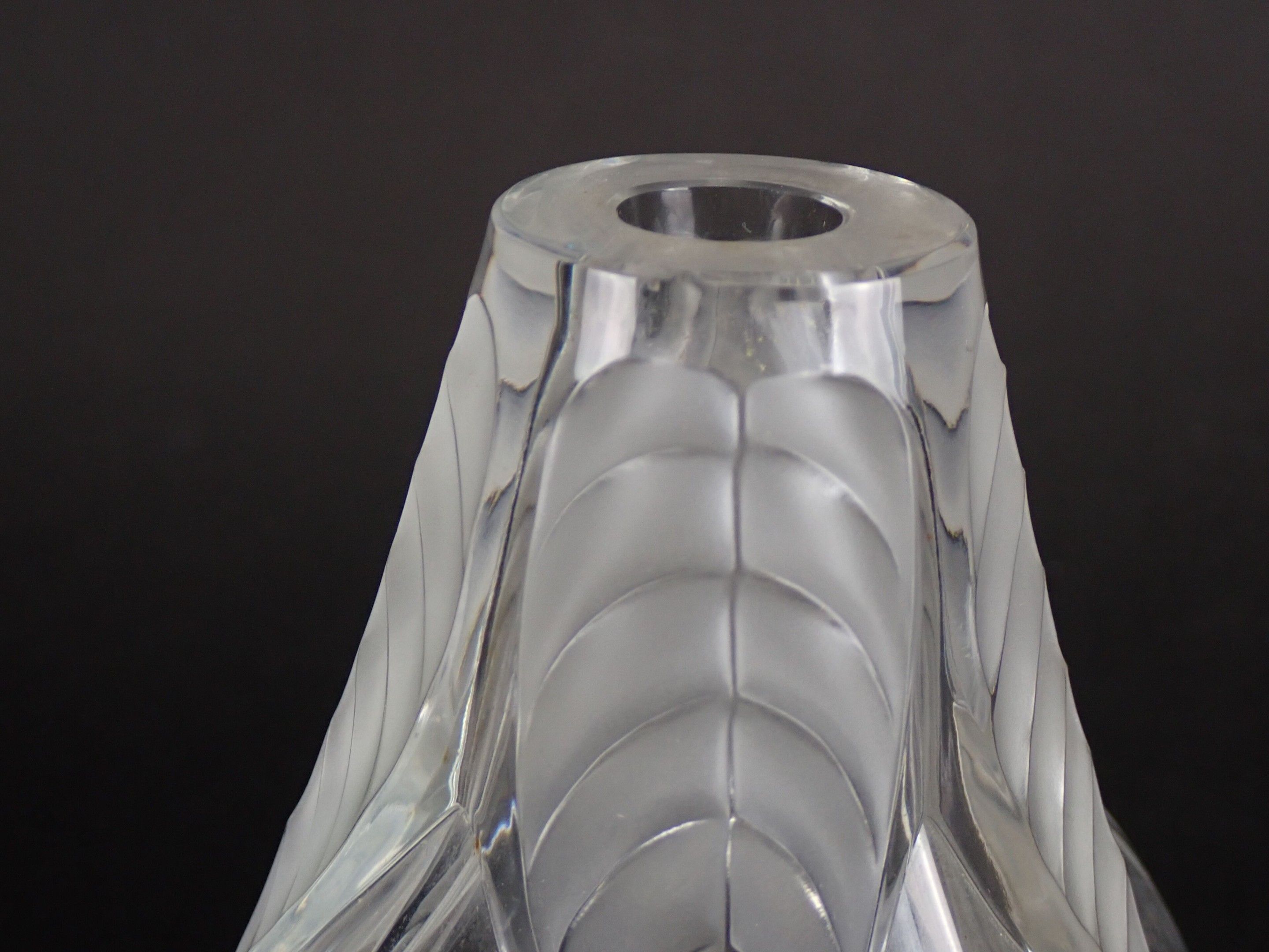 LALIQUE FRANCE An "Osumi" shaped vase in colourless and partly frosted pressed crystal with a neck decorated with foliage. Height : 17 cm