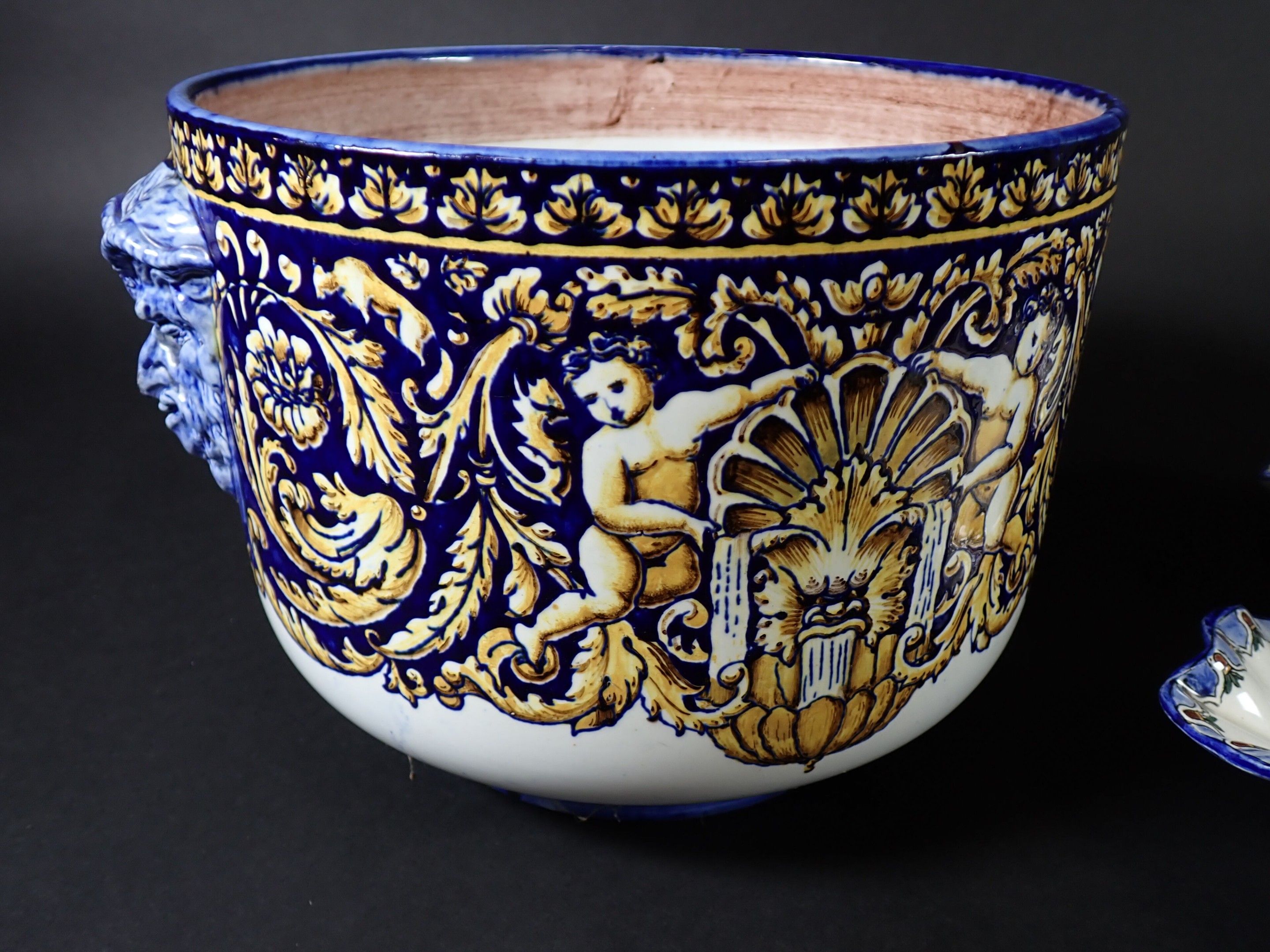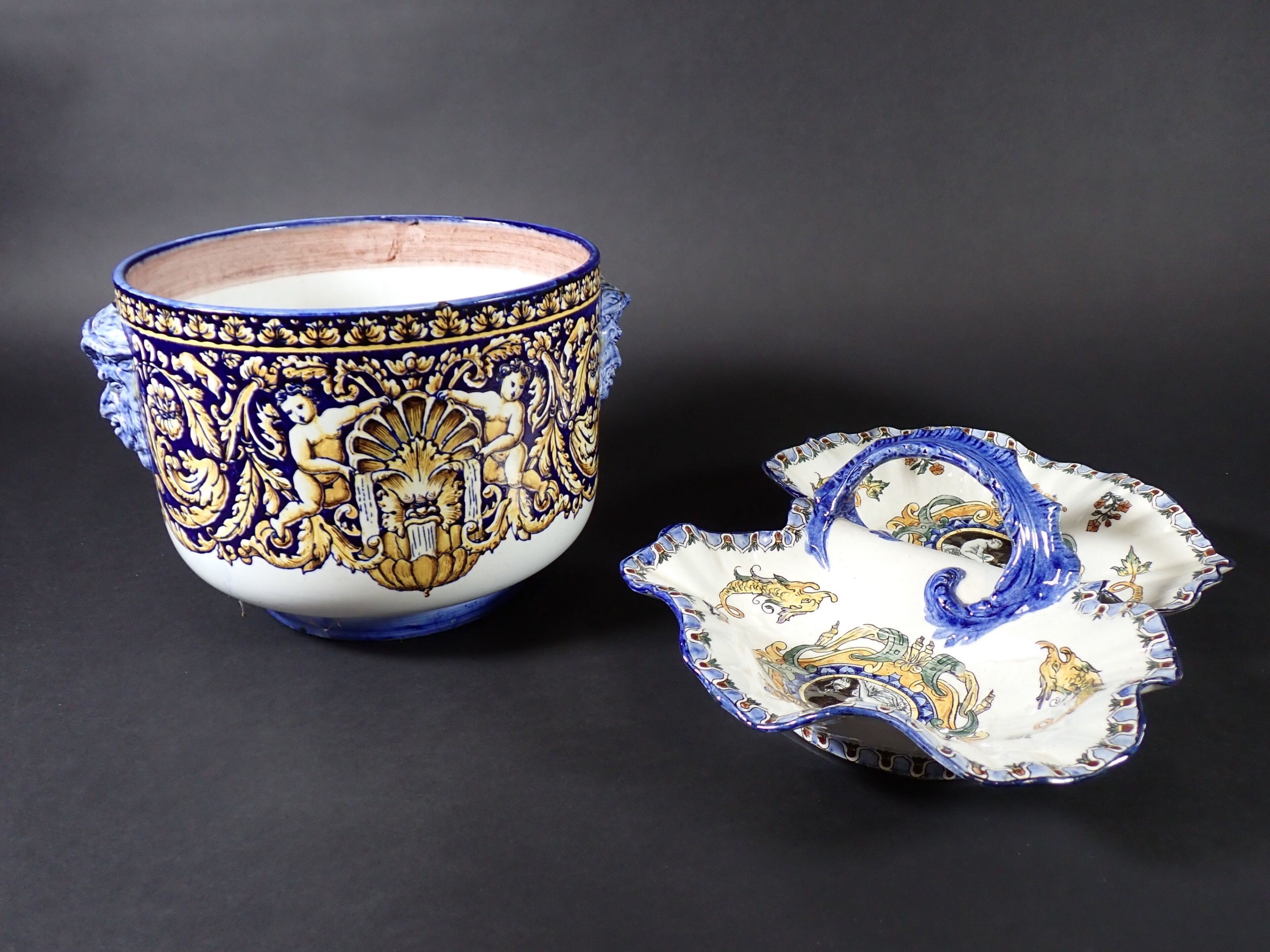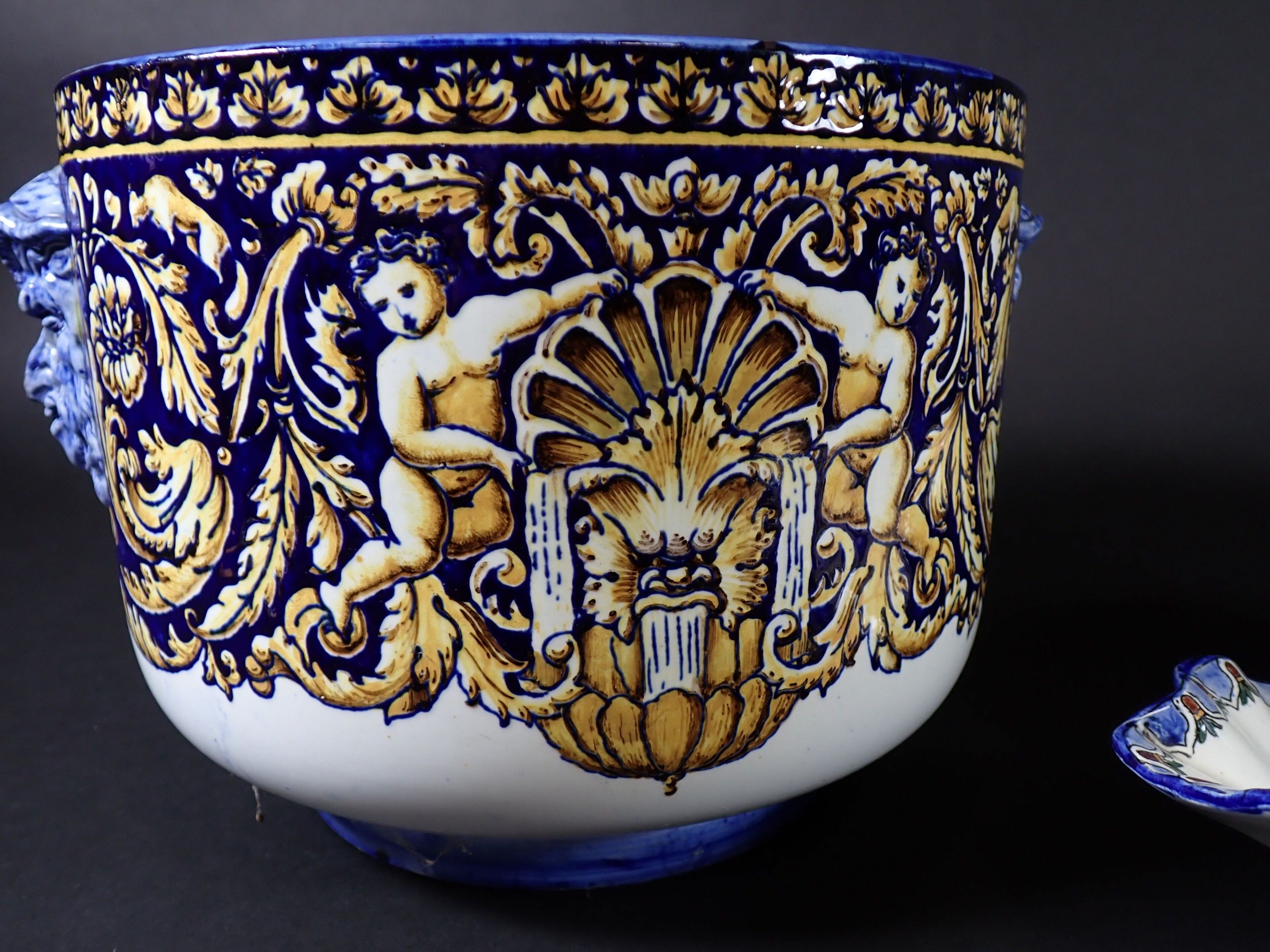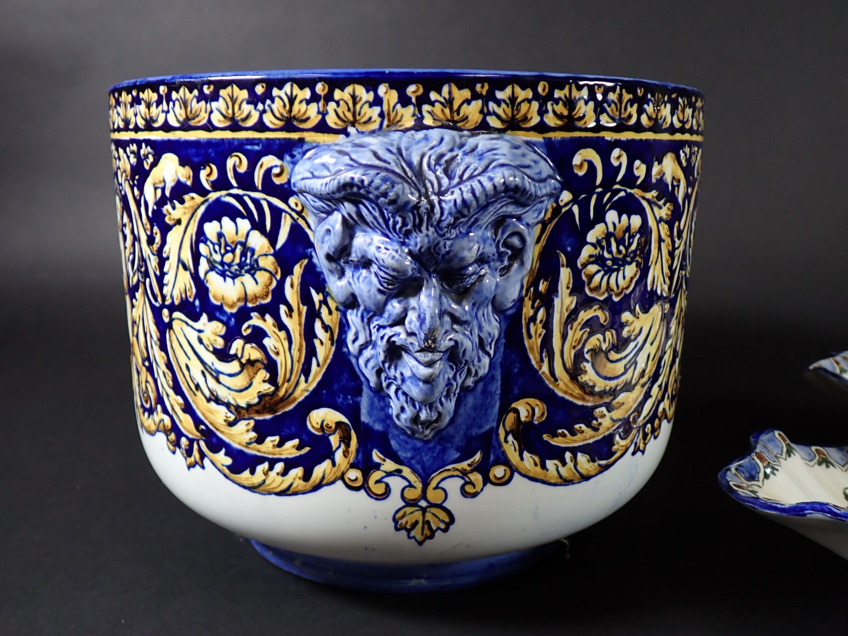 GIEN. Circular pot-holder and begging dish in earthenware with Renaissance-style decoration, two masked handles. Height 18 cm - length: 30 cm
