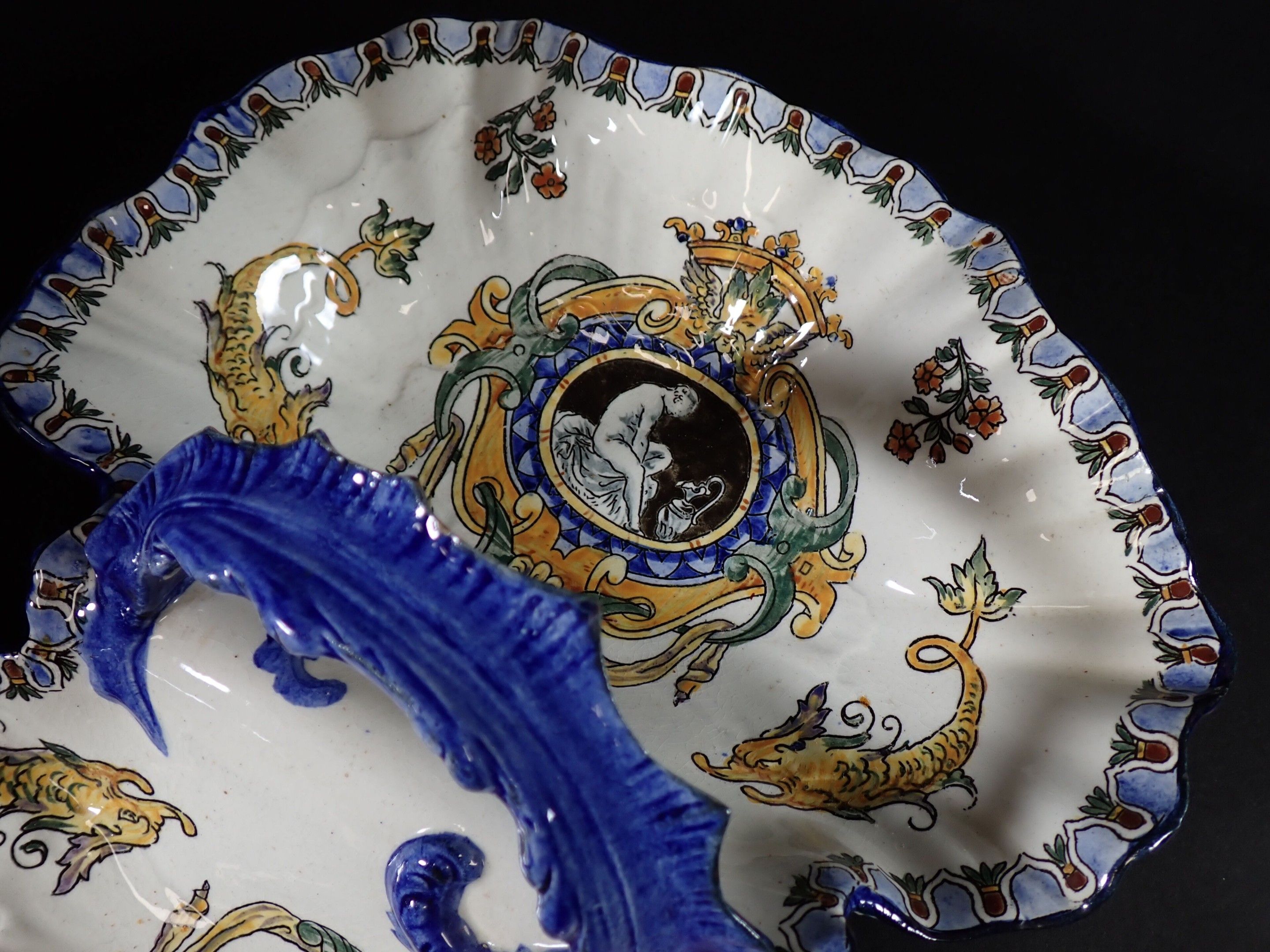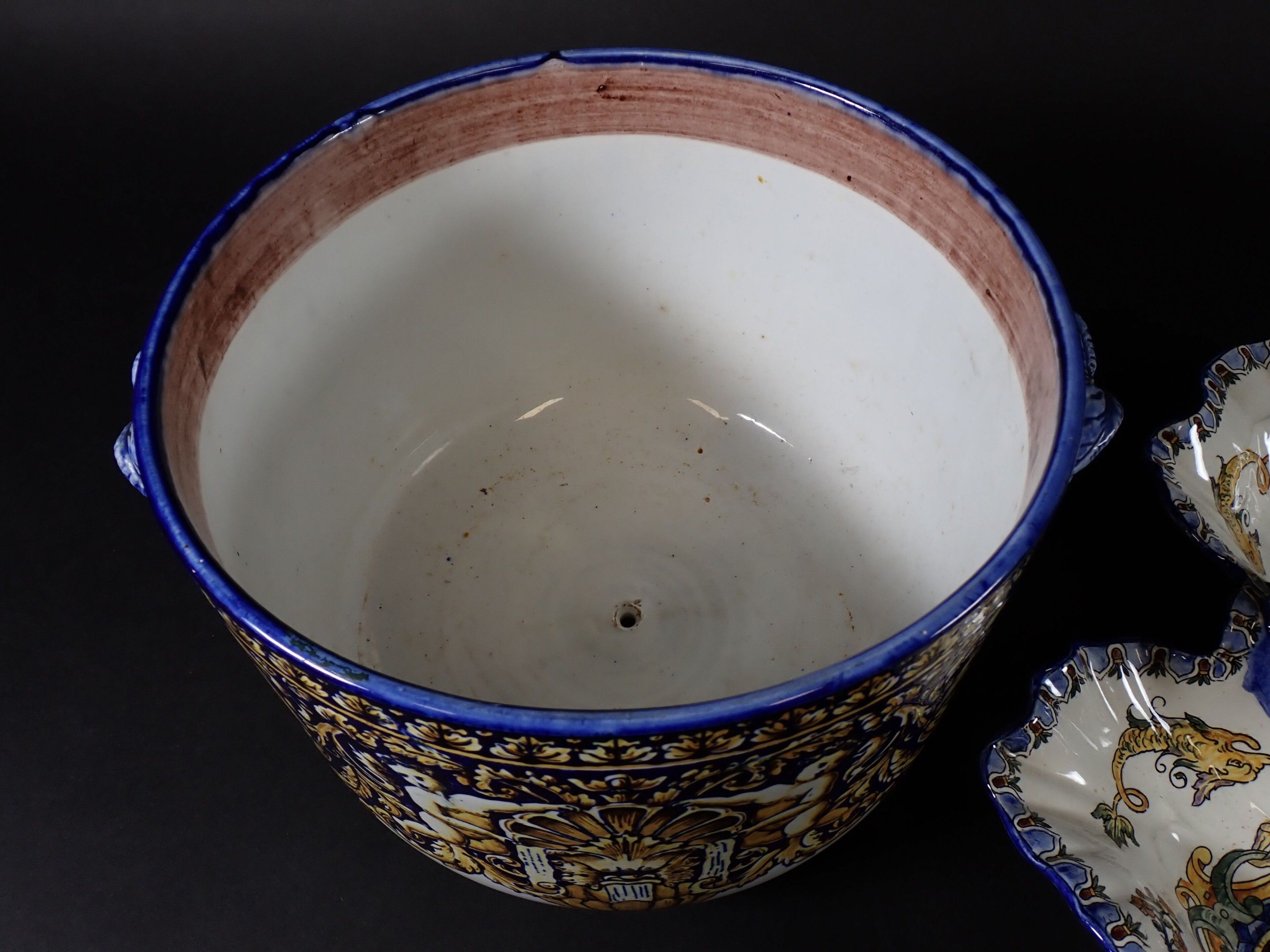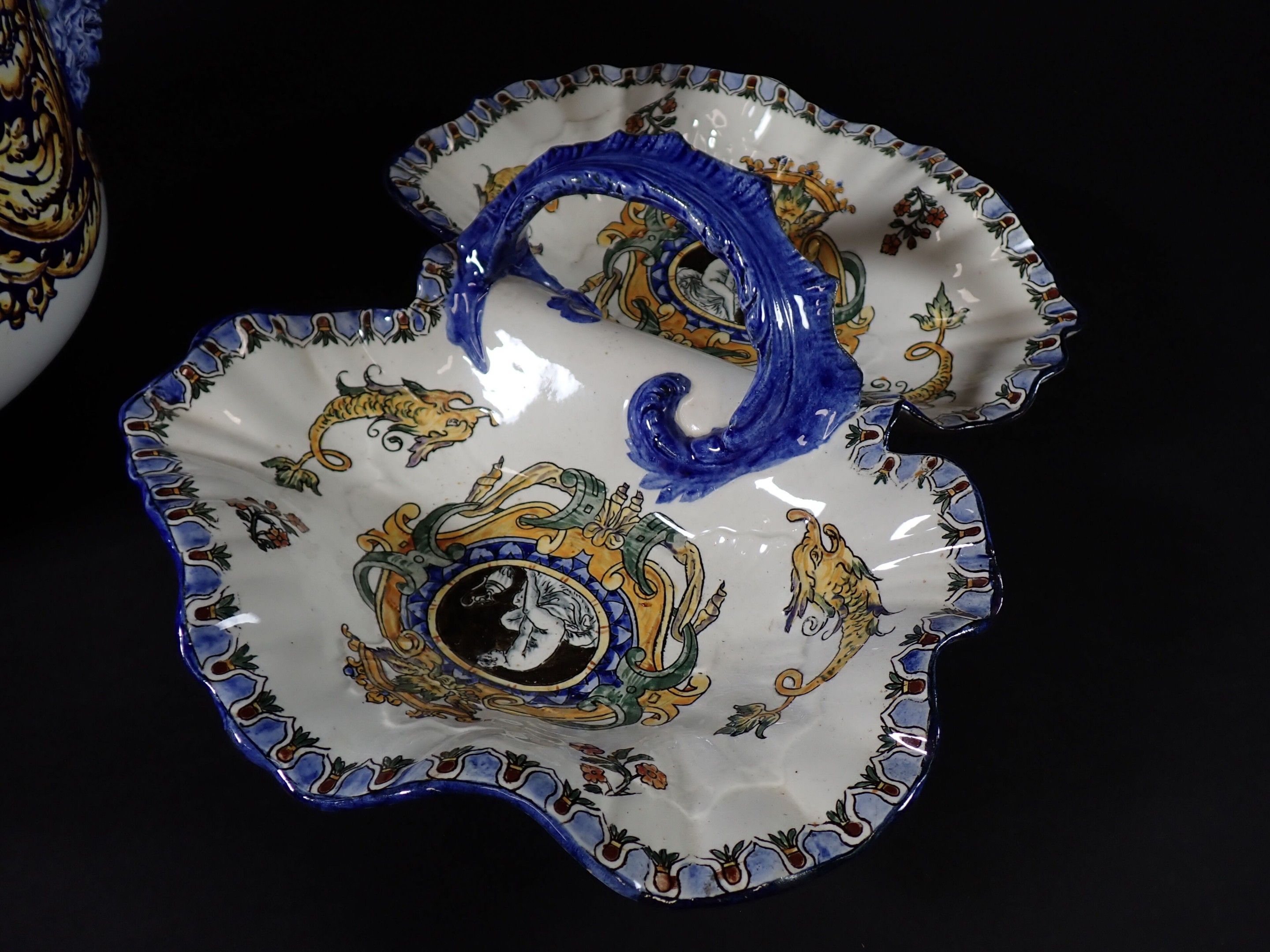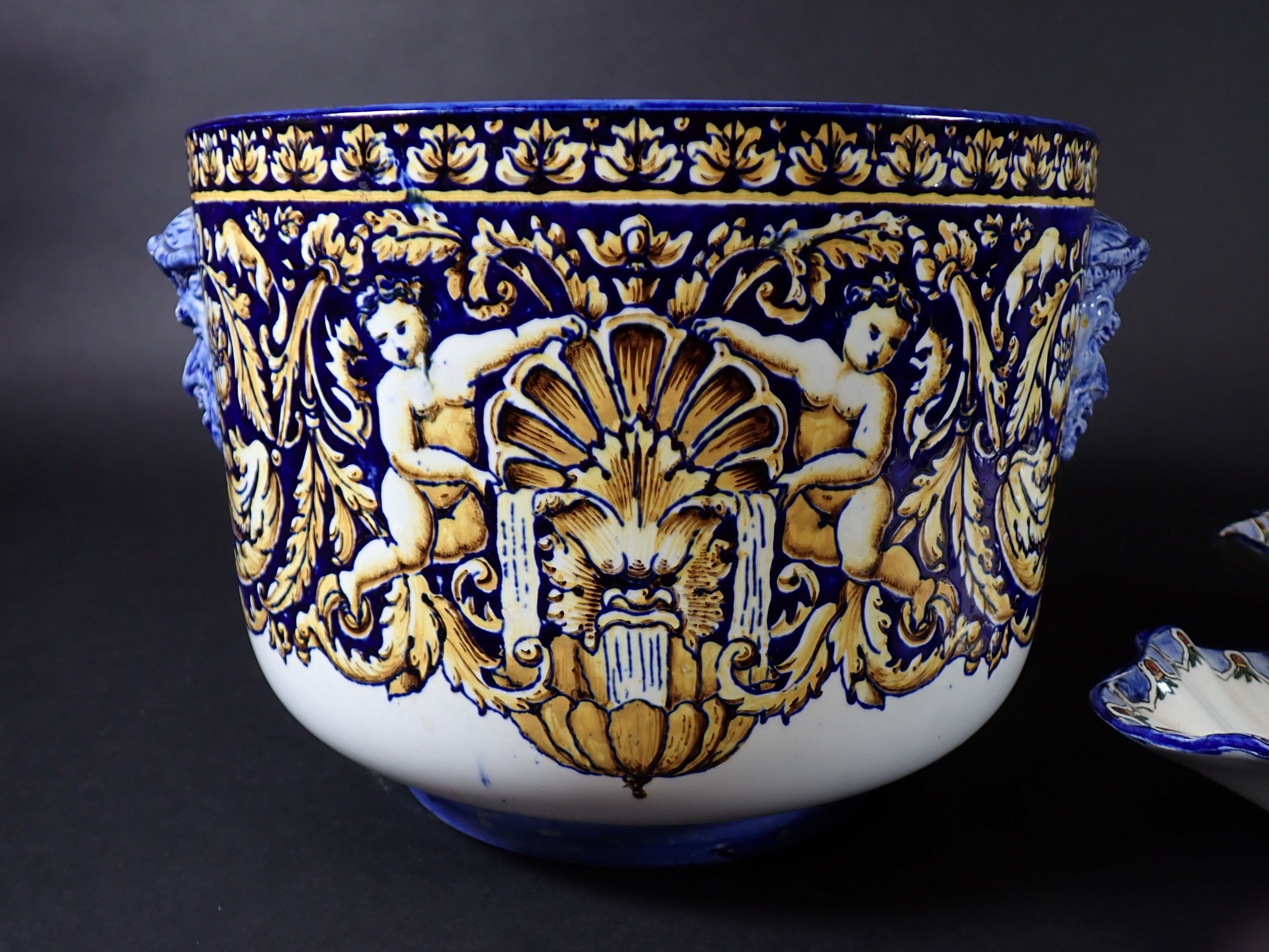 GIEN. Circular pot-holder and begging dish in earthenware with Renaissance-style decoration, two masked handles. Height 18 cm - length: 30 cm