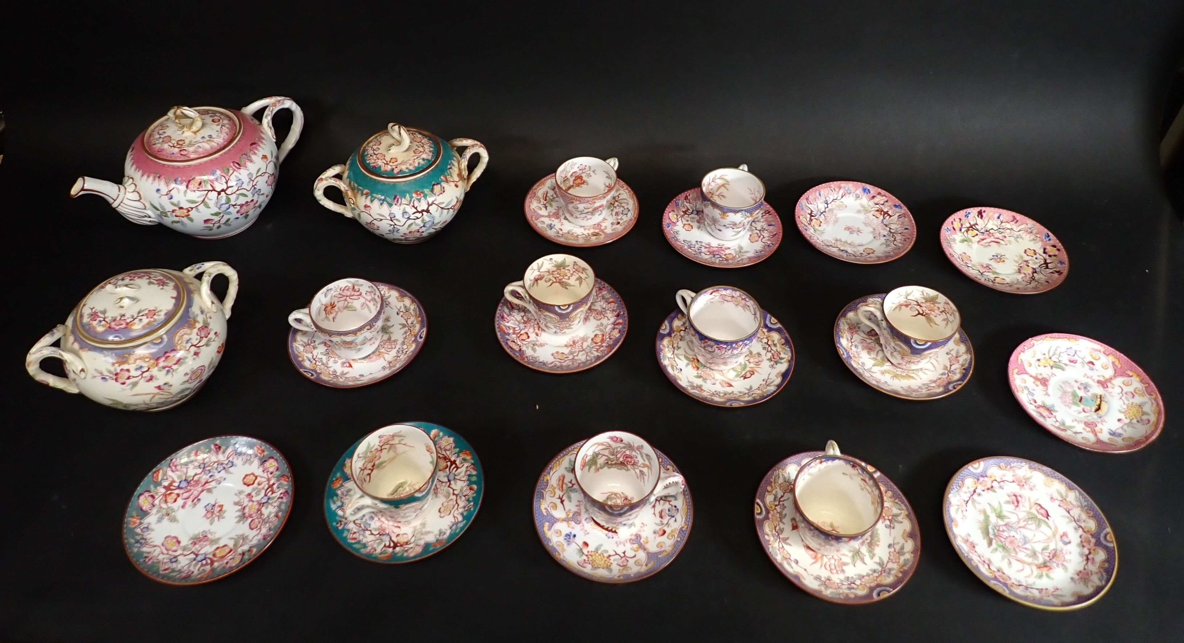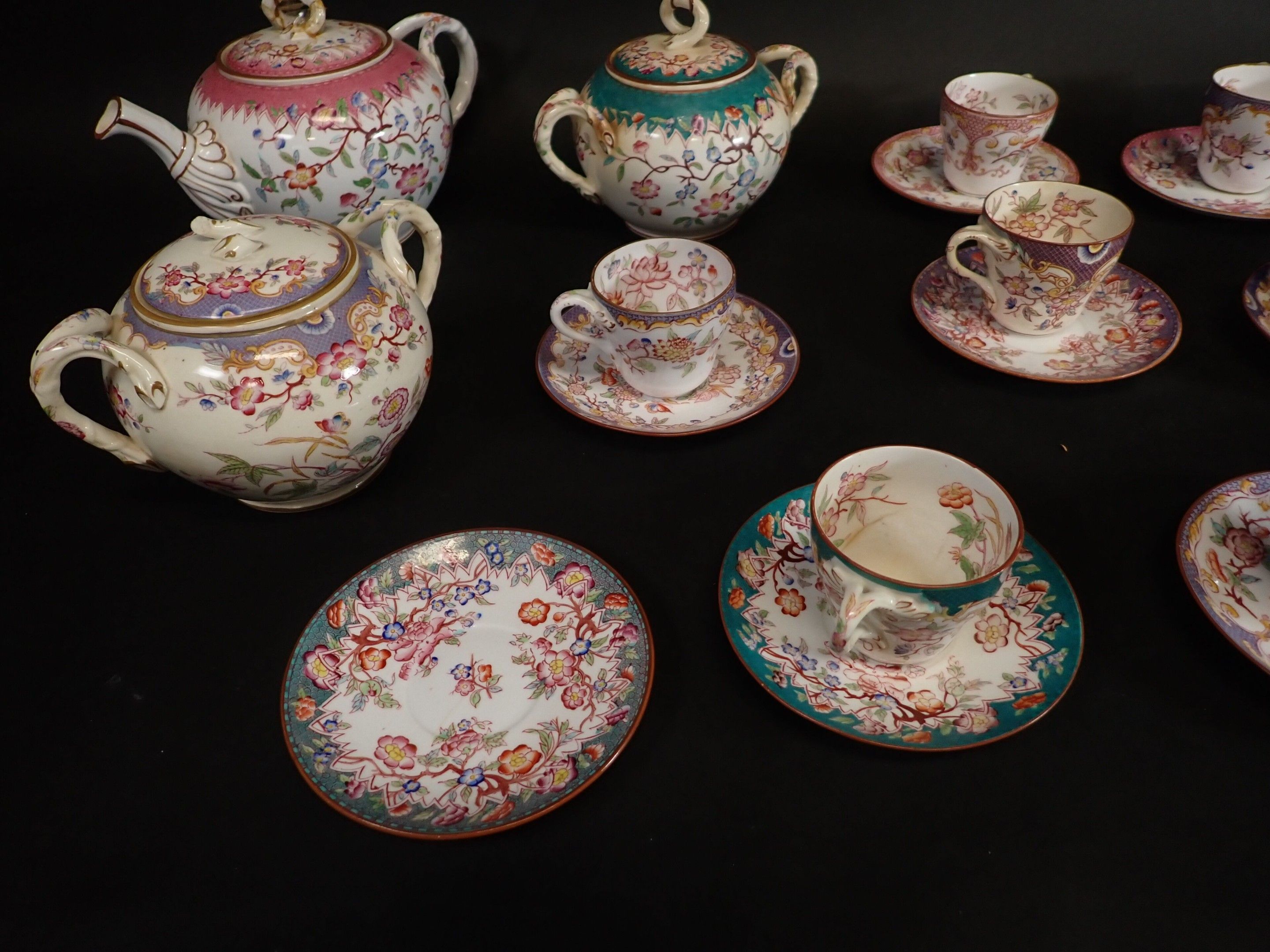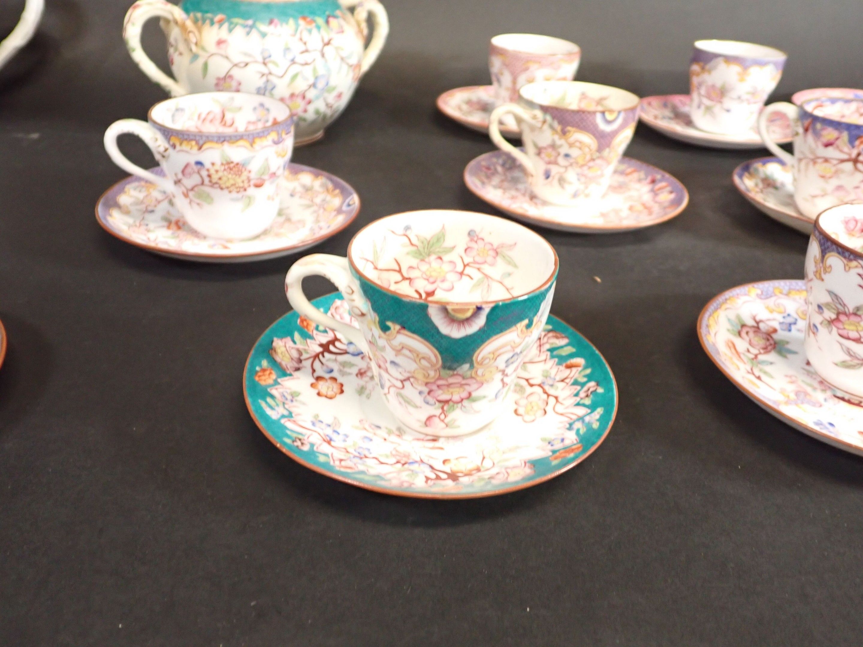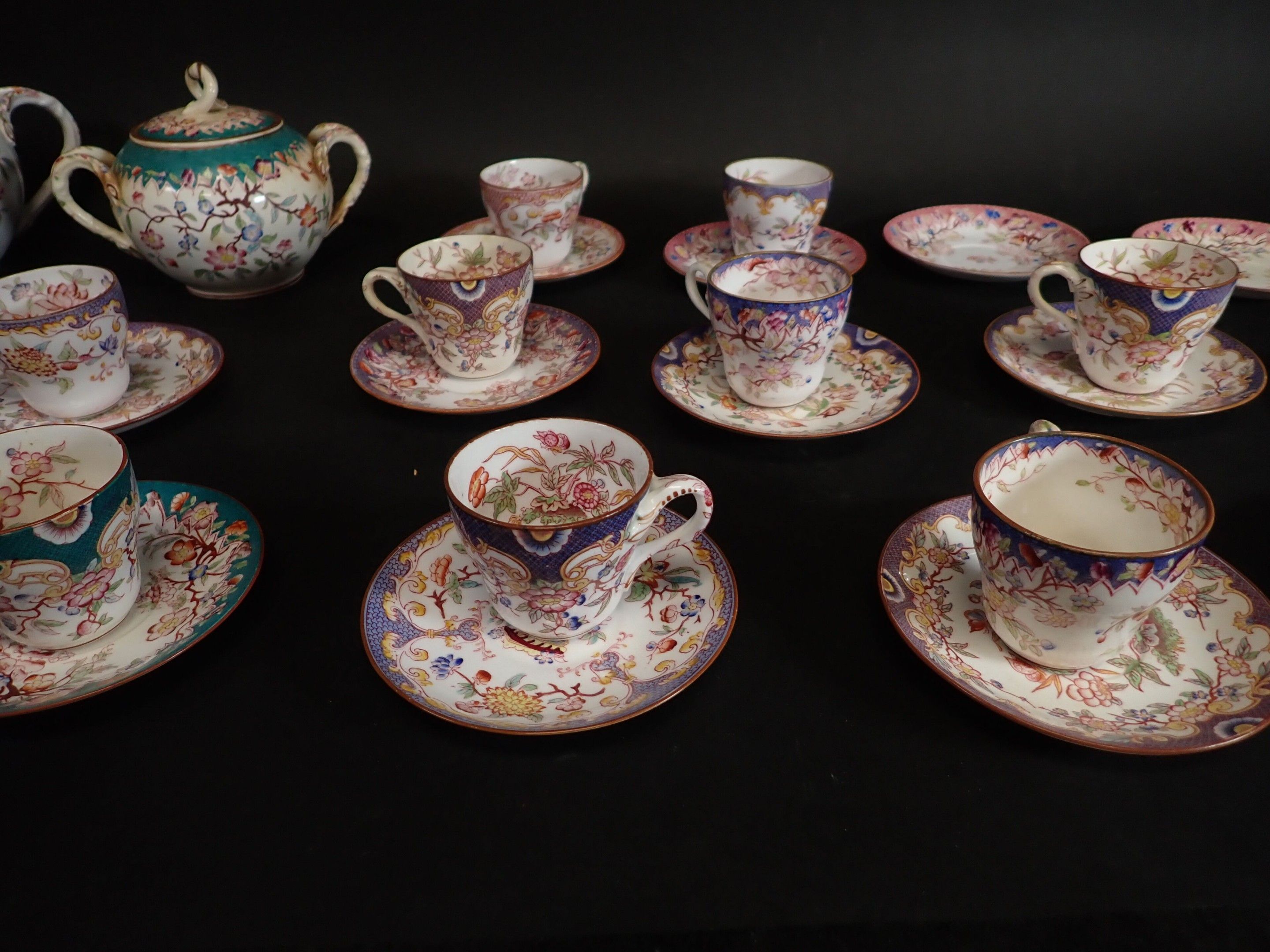 MINTON, SARREGUEMINES, GIEN and others. Porcelain tea service including 1 teapot, 2 sugar bowls, 9 cups, saucers (wear, accidents)