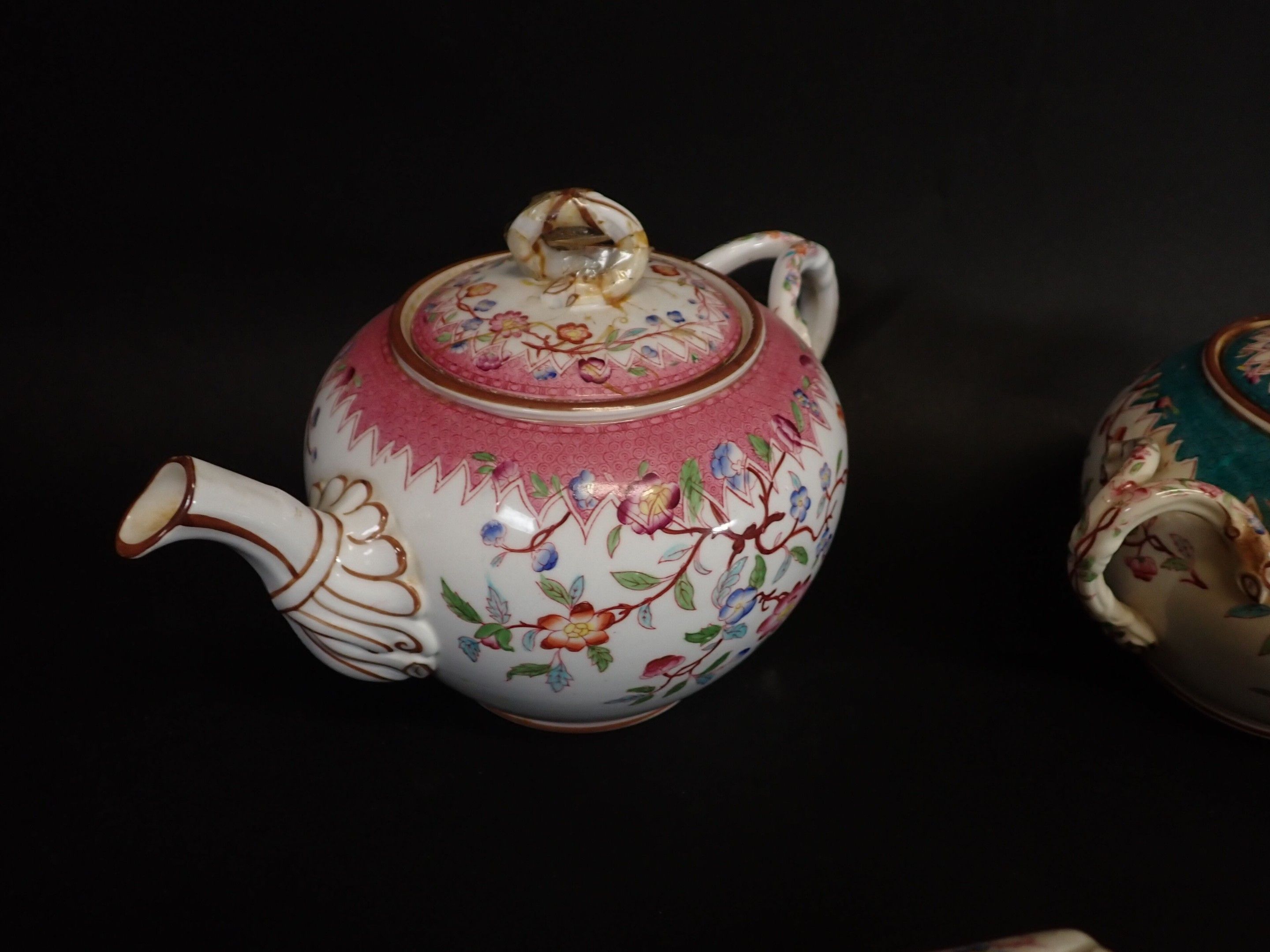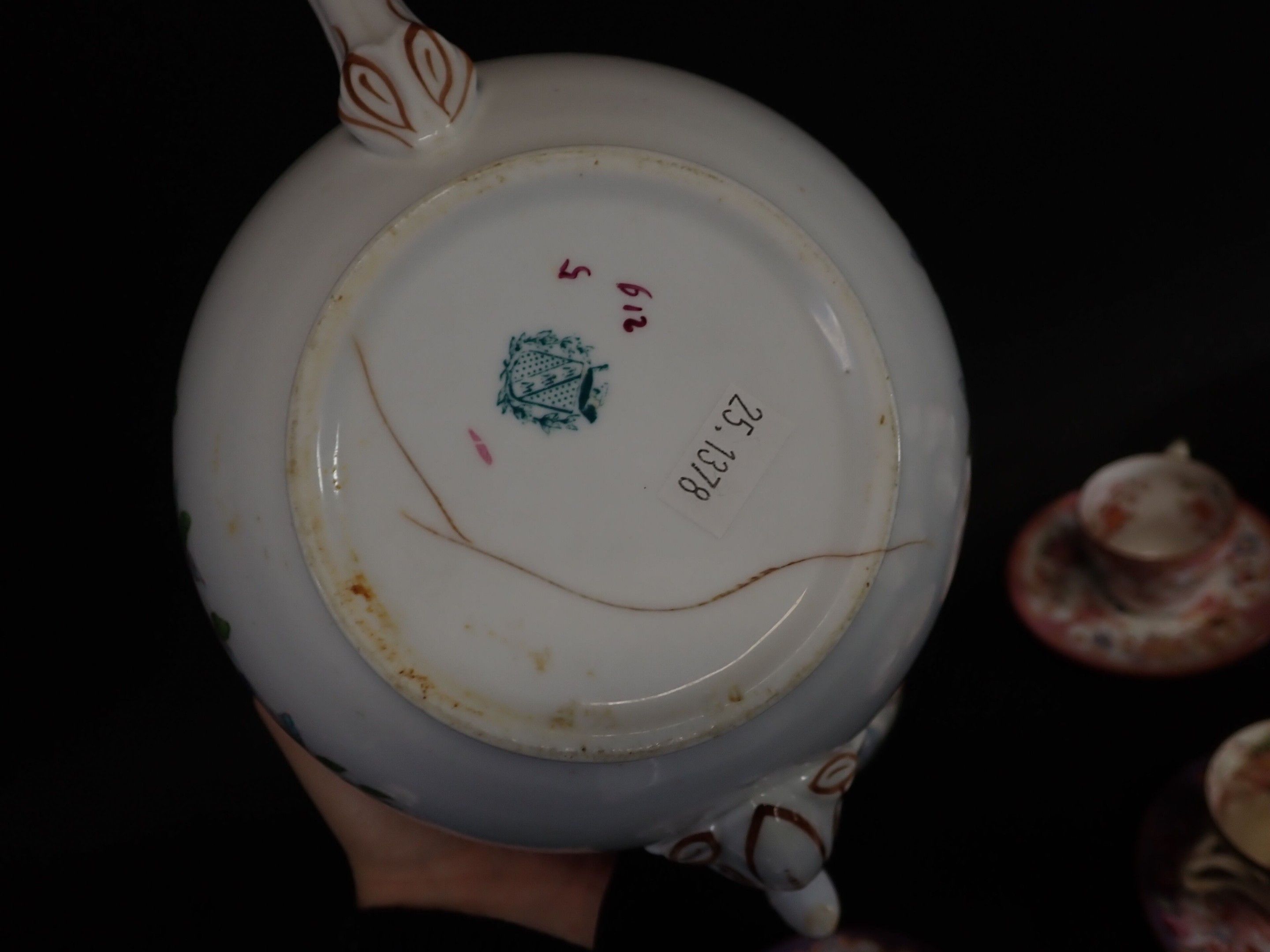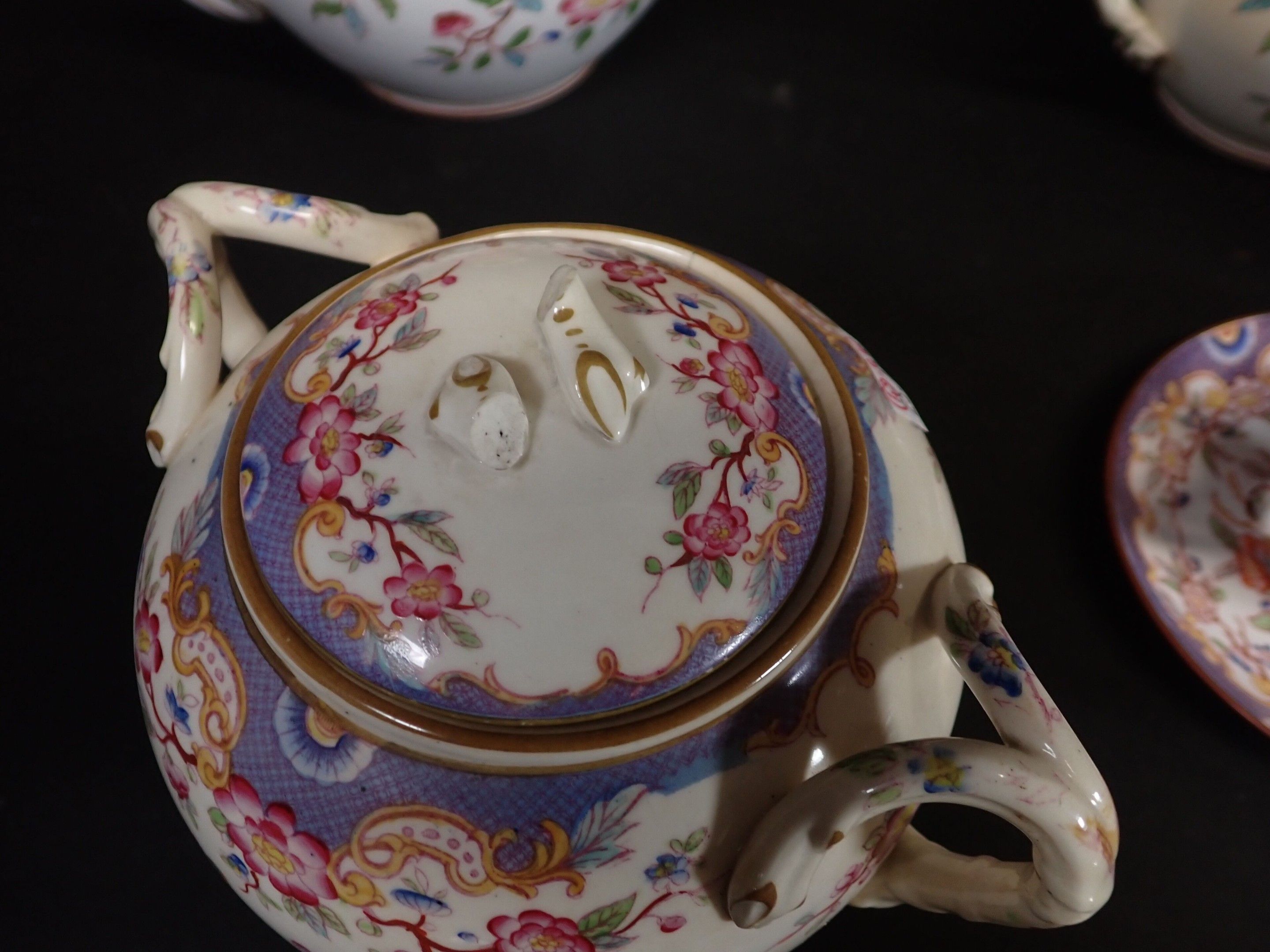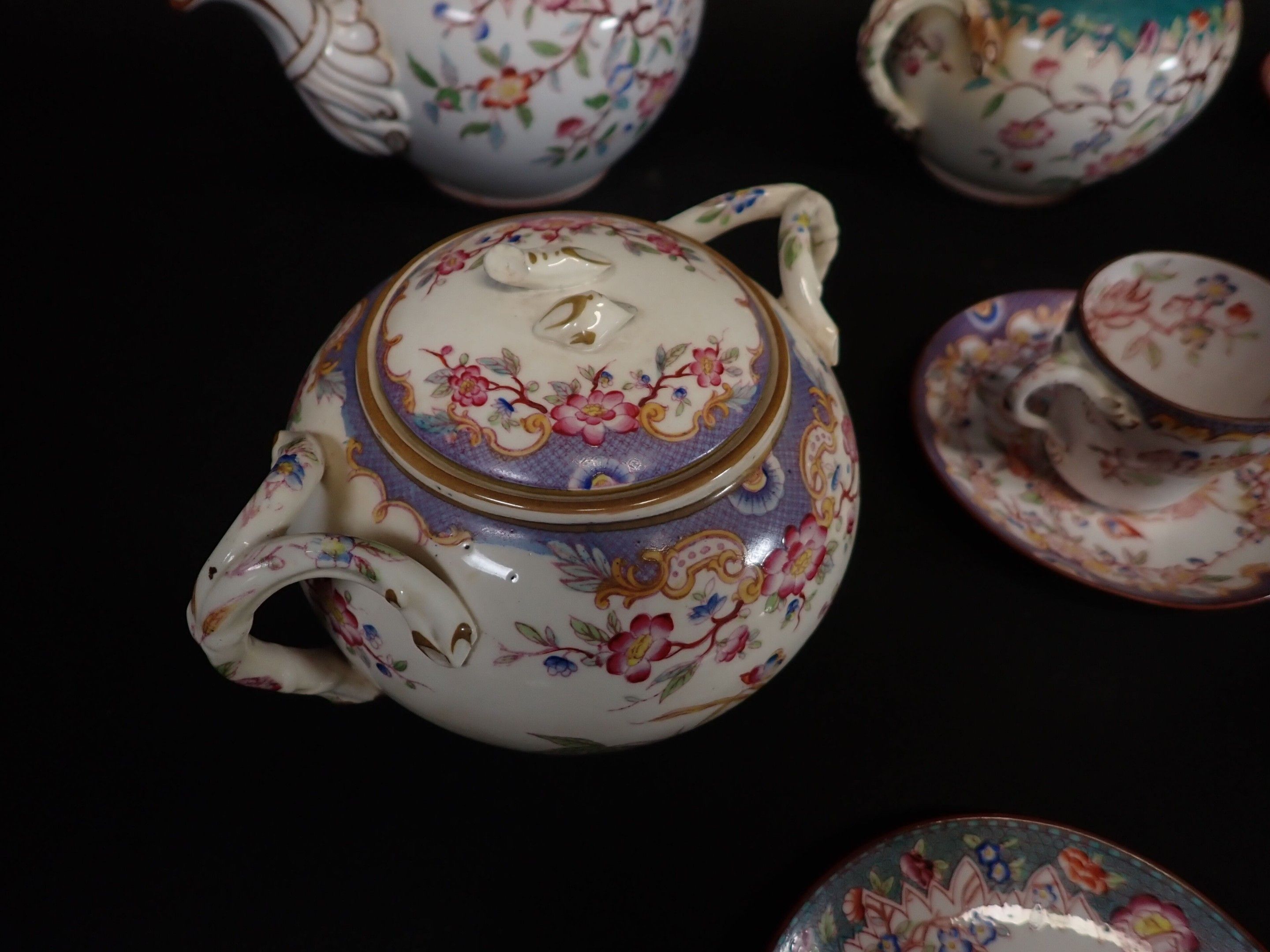 MINTON, SARREGUEMINES, GIEN and others. Porcelain tea service including 1 teapot, 2 sugar bowls, 9 cups, saucers (wear, accidents)