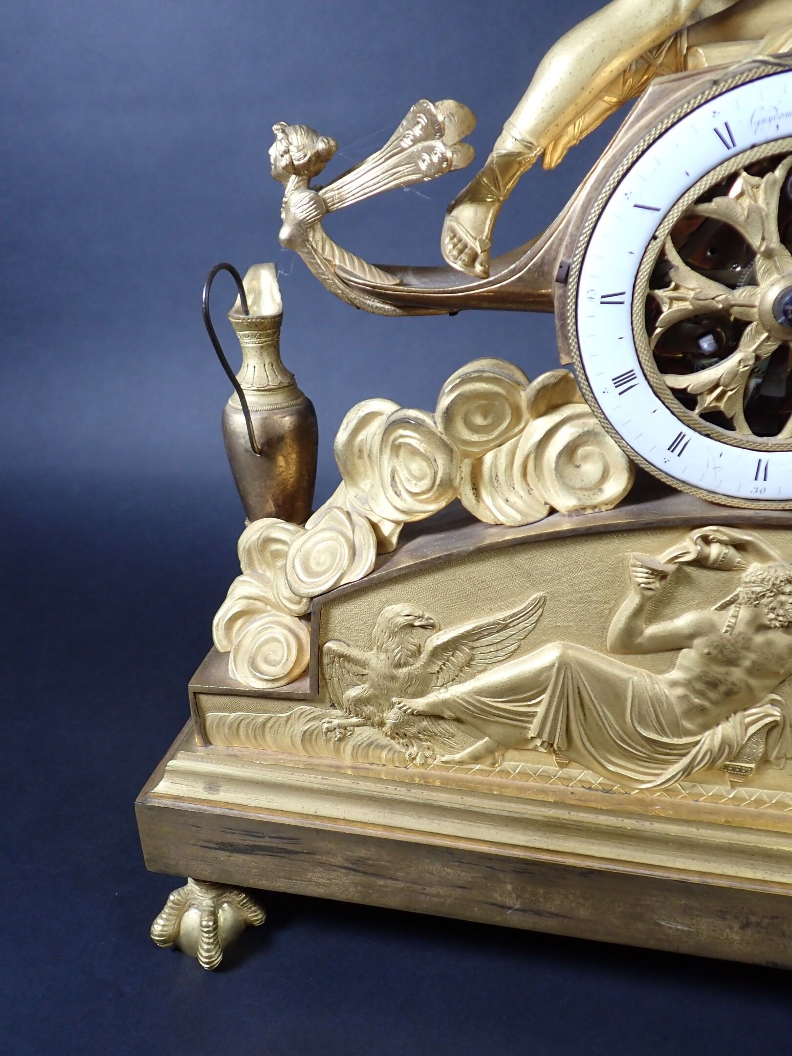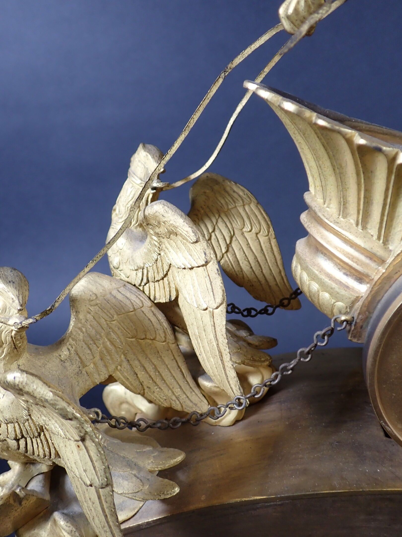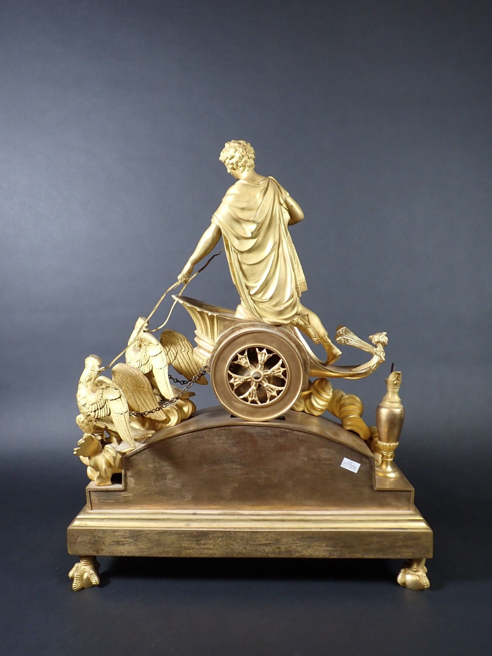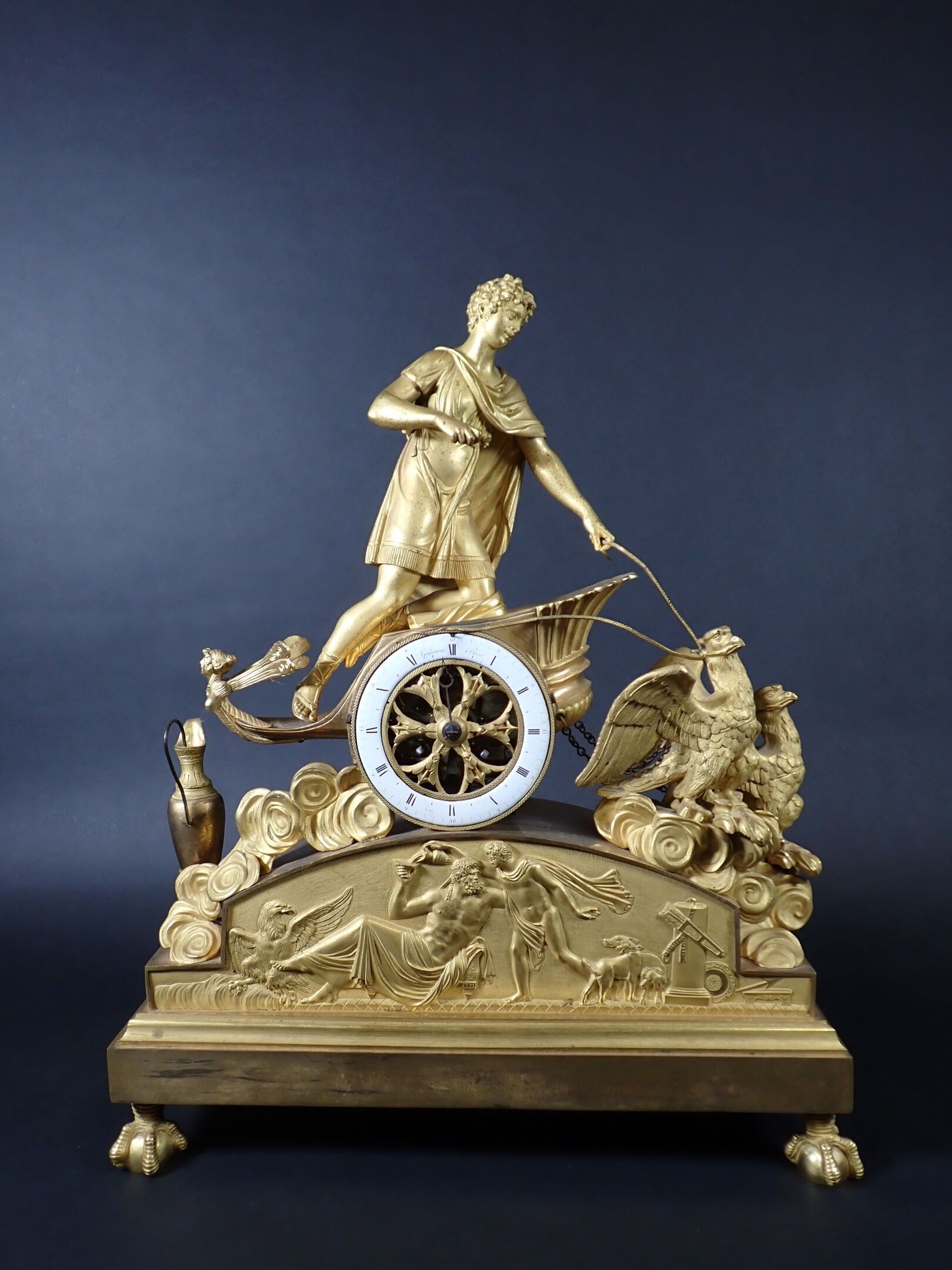 After Pierre-Philippe THOMIRE (1751-1843. Empire period gilt bronze and chased chariot clock decorated with Ganymede crossing the Heavens in Zeus' chariot drawn by two eagles. The dial with Roman numerals inscribed in the wheel, decorated with eagles, ewer and clouds as well as a bust of a winged woman. The dial and the plate of the movement signed Edmé Philibert GUYDAMOUR (1756-1799), in Paris, received master clockmaker in 1783, movement with wire with stamp and balance. Untested mechanism, in need of revision, one hand missing. The whole supported by three claws each holding a ball (missing a claw foot at the back). Height 52 cm, W. 42 cm, D. 14 cm