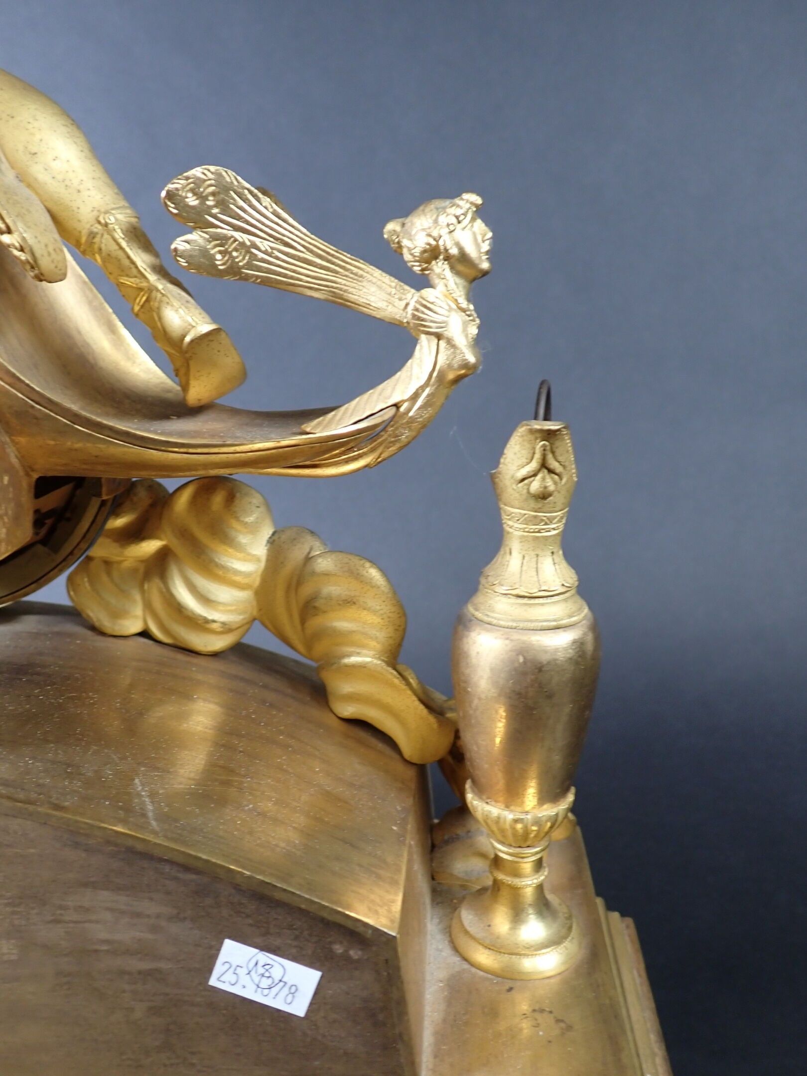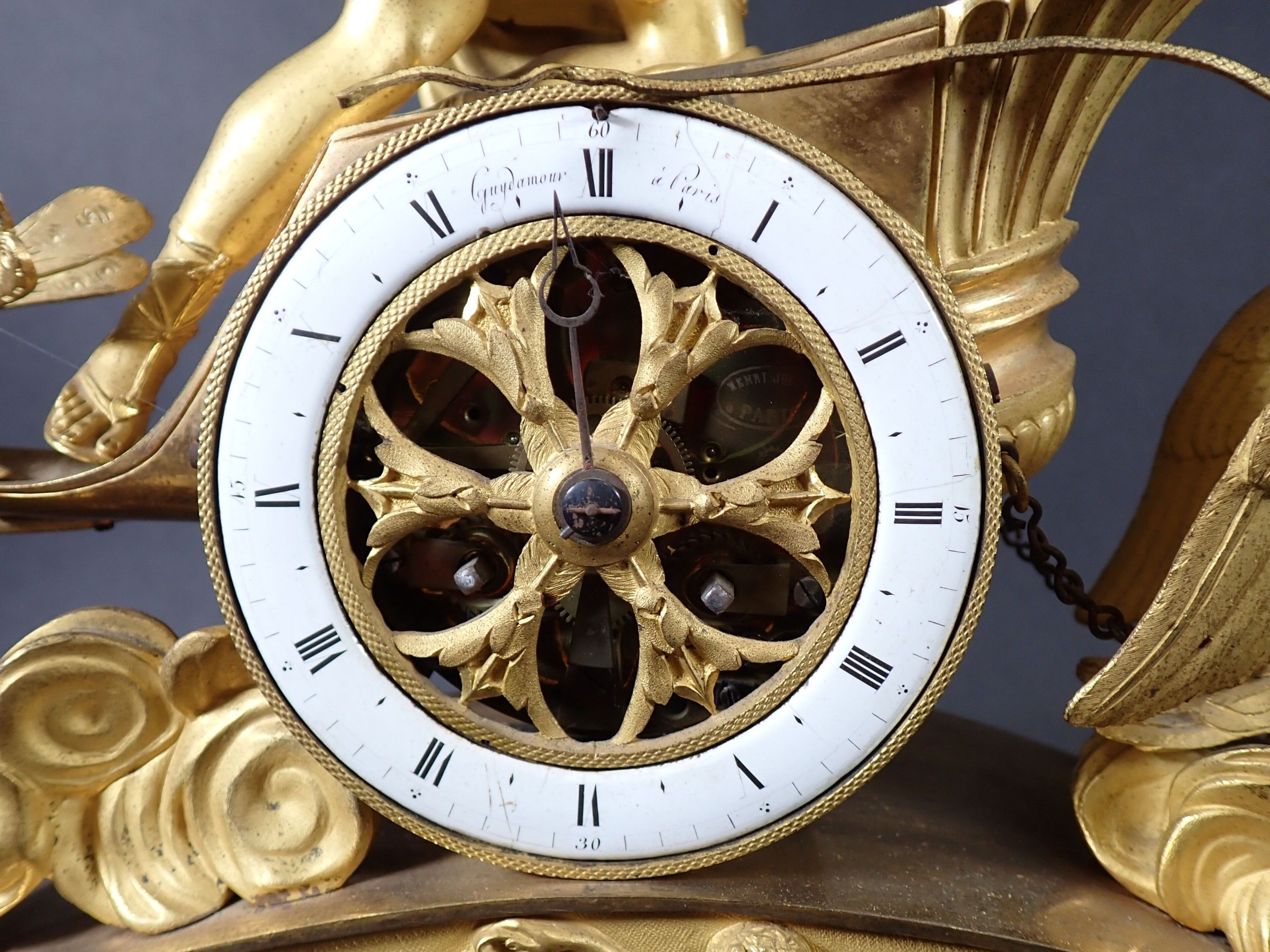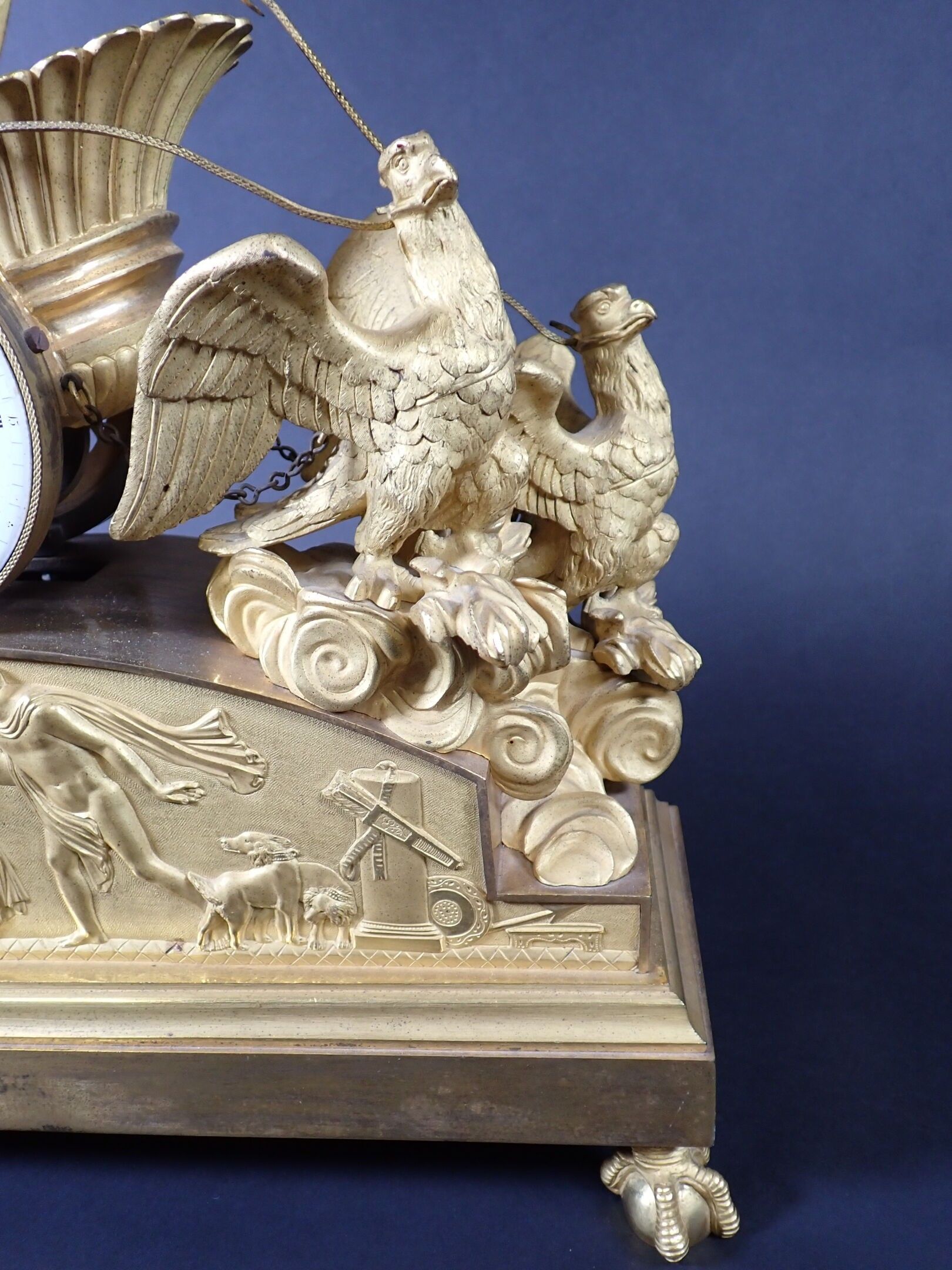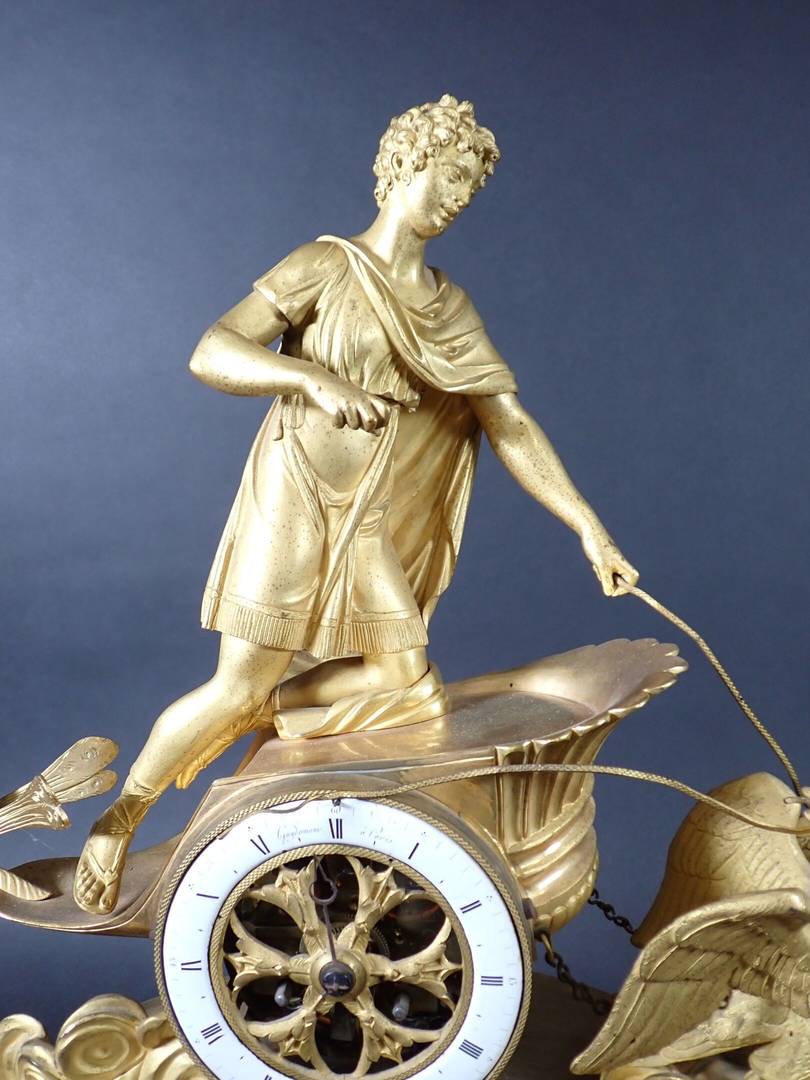 After Pierre-Philippe THOMIRE (1751-1843. Empire period gilt bronze and chased chariot clock decorated with Ganymede crossing the Heavens in Zeus' chariot drawn by two eagles. The dial with Roman numerals inscribed in the wheel, decorated with eagles, ewer and clouds as well as a bust of a winged woman. The dial and the plate of the movement signed Edmé Philibert GUYDAMOUR (1756-1799), in Paris, received master clockmaker in 1783, movement with wire with stamp and balance. Untested mechanism, in need of revision, one hand missing. The whole supported by three claws each holding a ball (missing a claw foot at the back). Height 52 cm, W. 42 cm, D. 14 cm