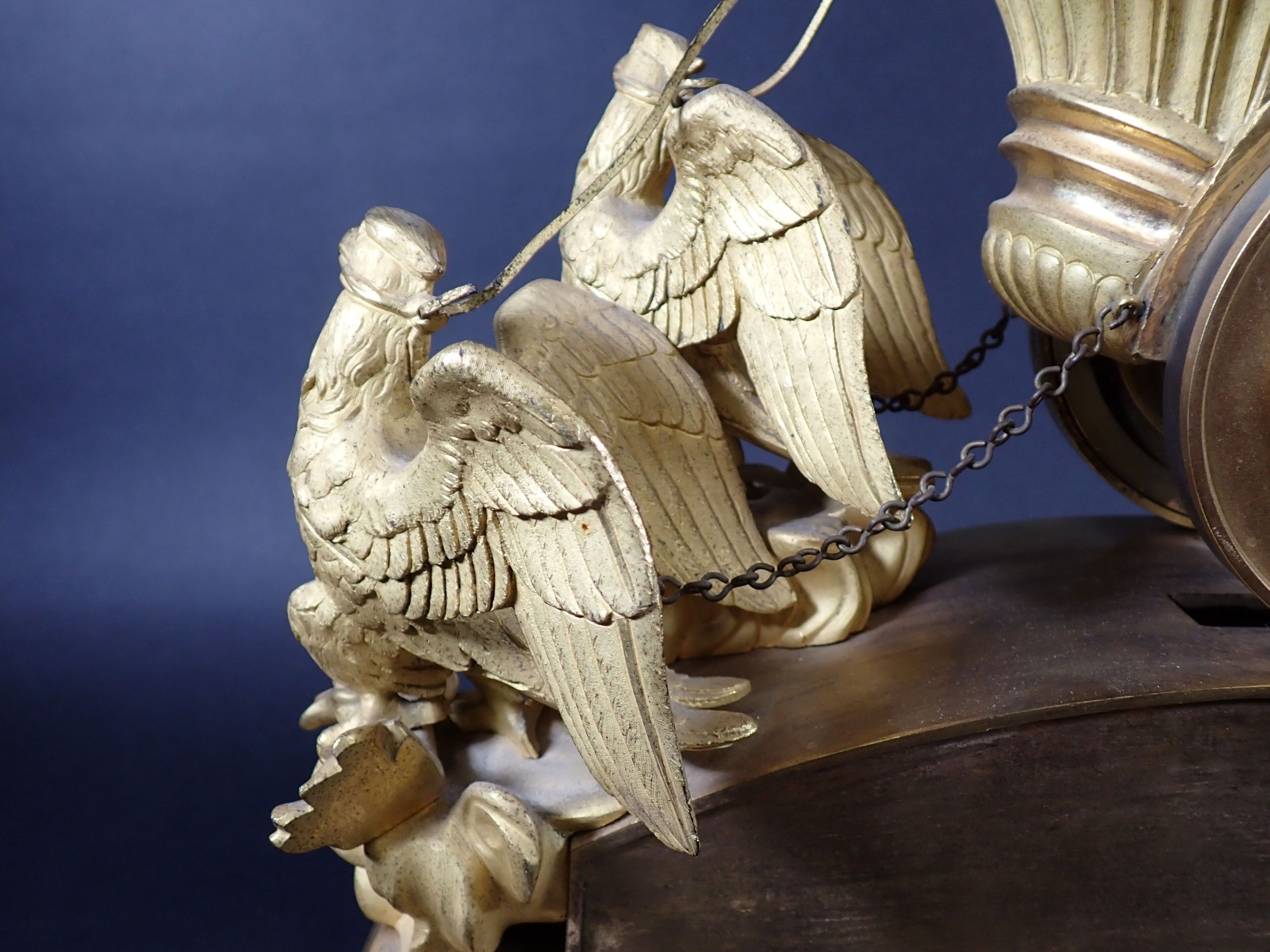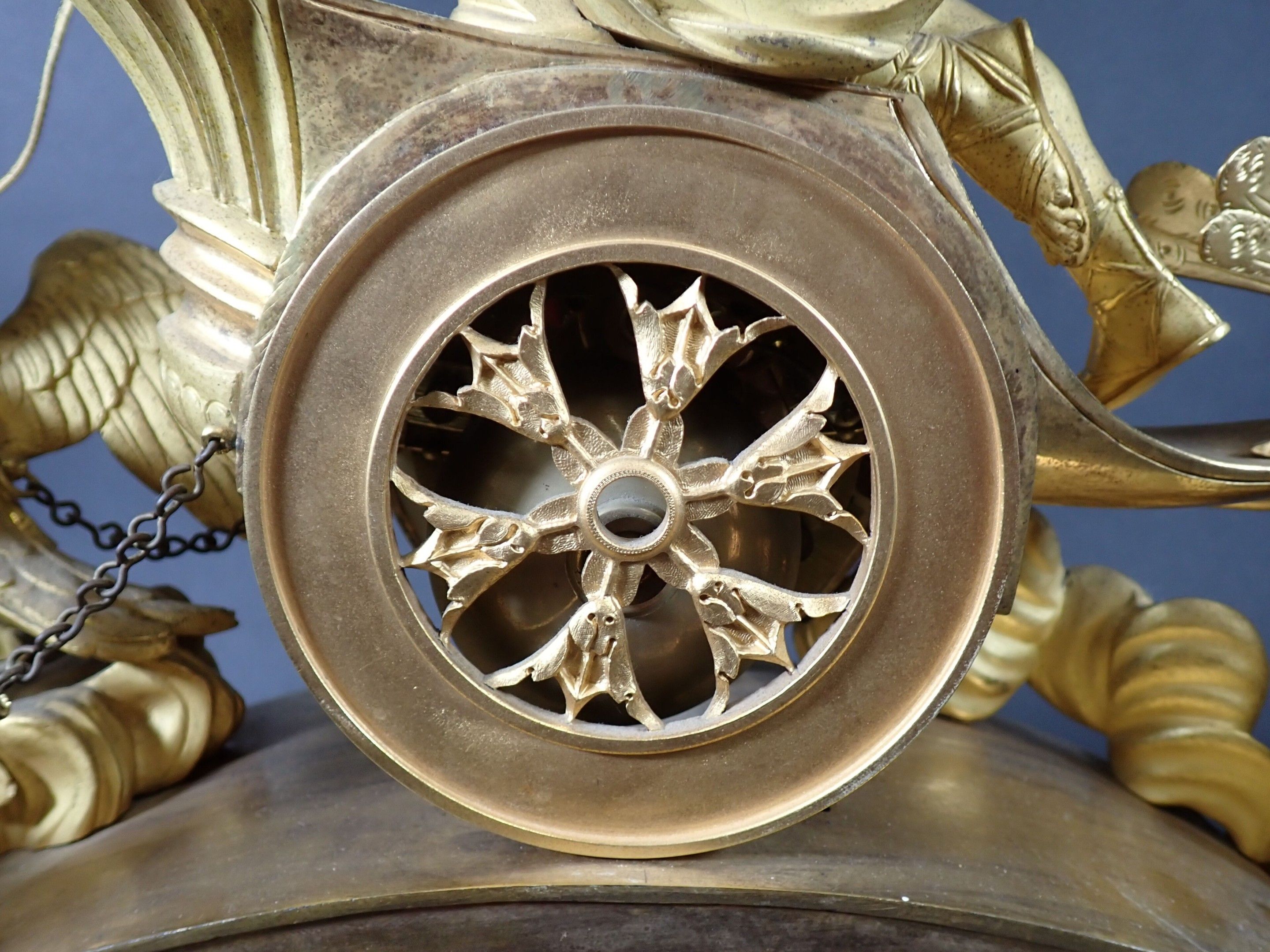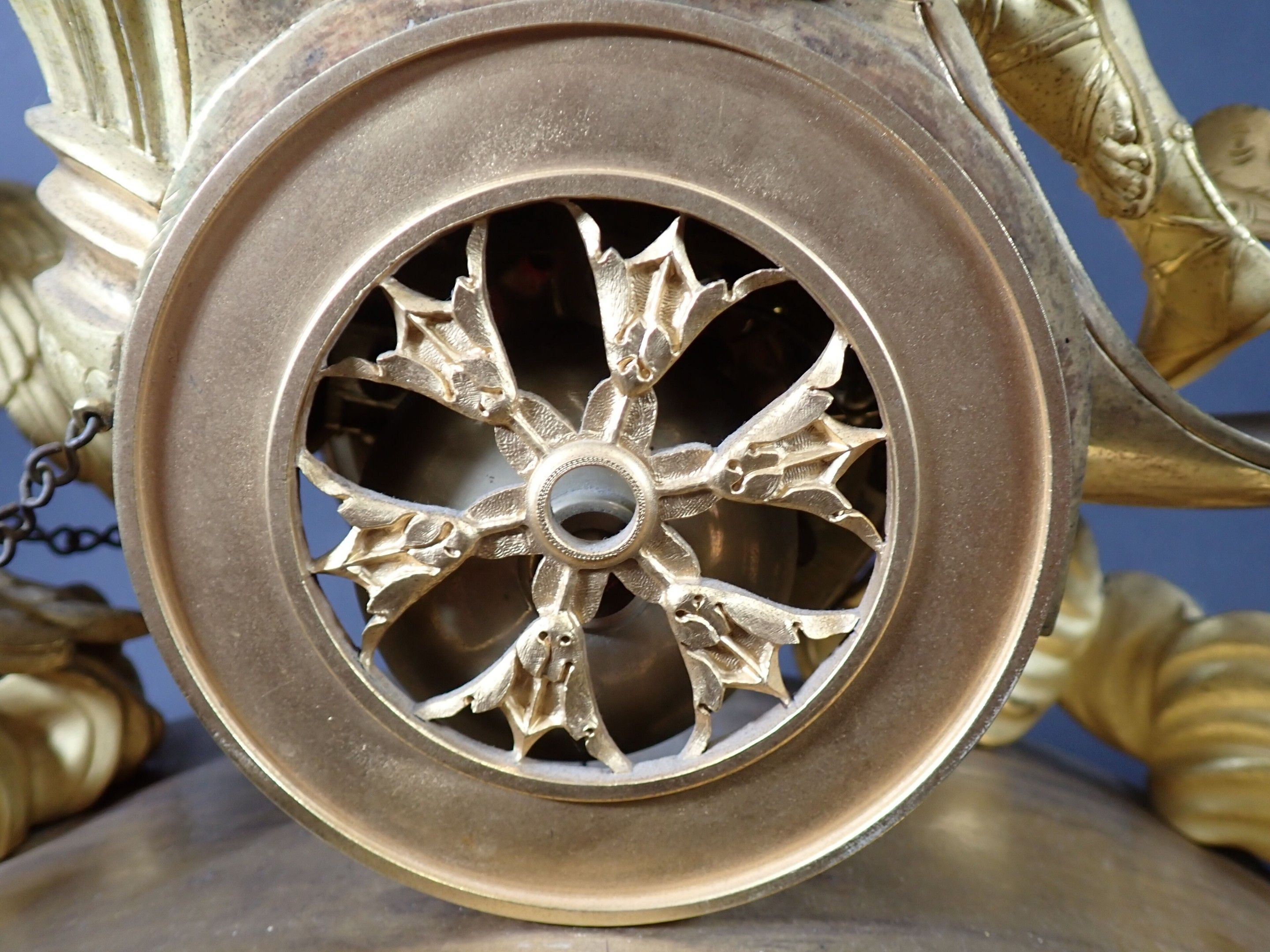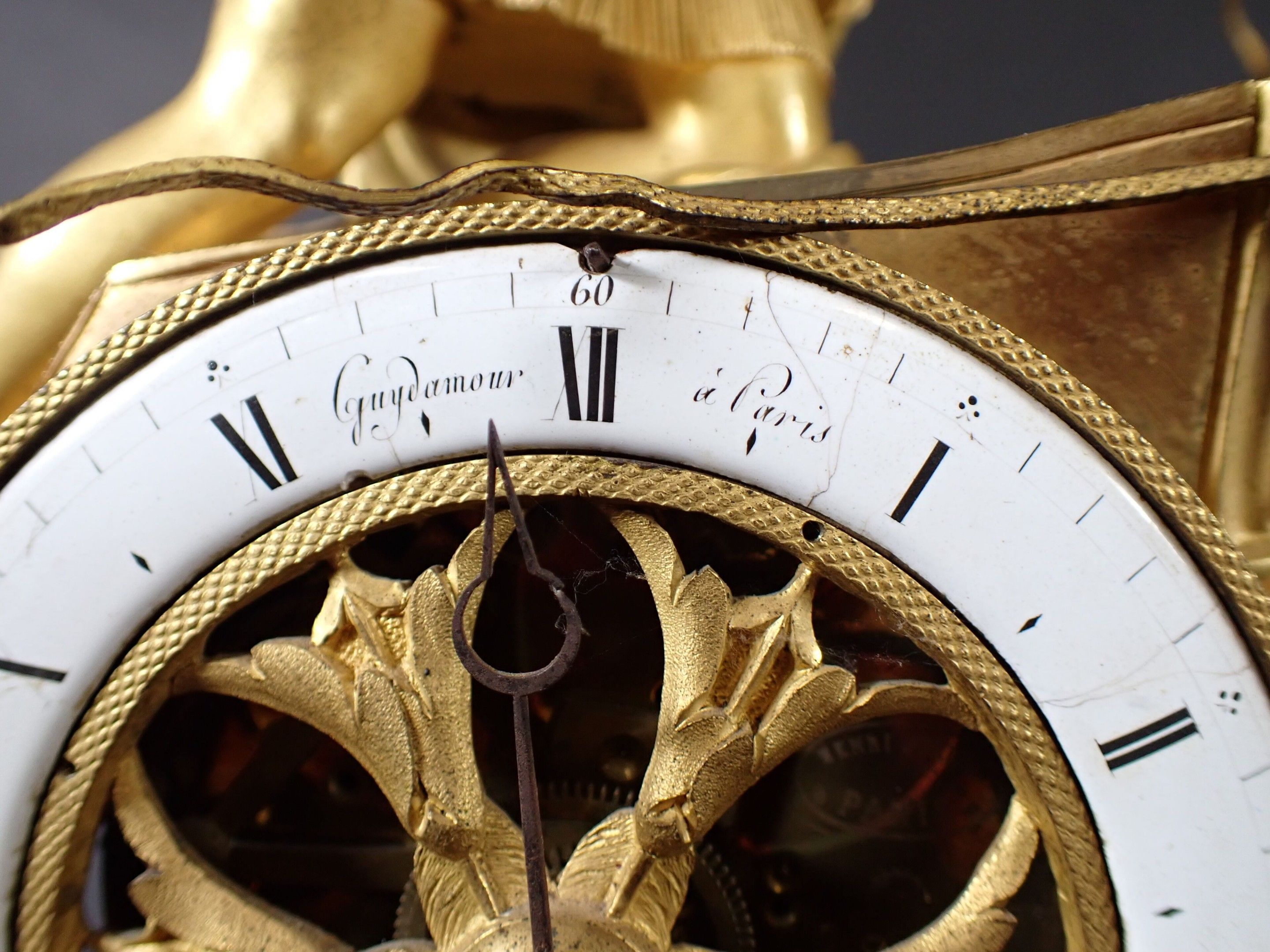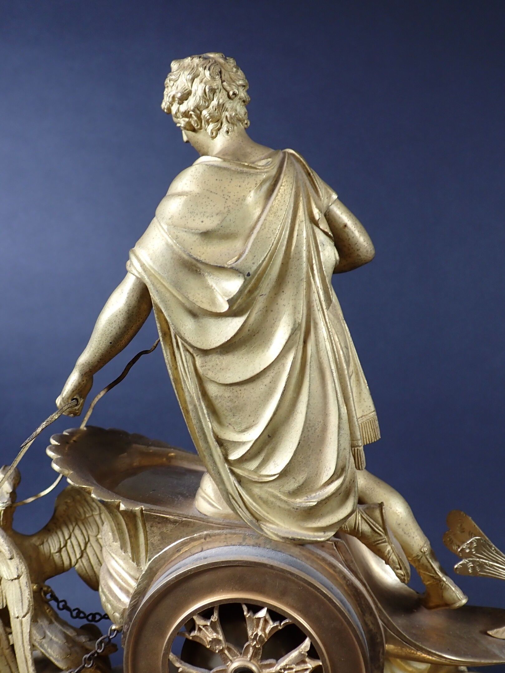 After Pierre-Philippe THOMIRE (1751-1843. Empire period gilt bronze and chased chariot clock decorated with Ganymede crossing the Heavens in Zeus' chariot drawn by two eagles. The dial with Roman numerals inscribed in the wheel, decorated with eagles, ewer and clouds as well as a bust of a winged woman. The dial and the plate of the movement signed Edmé Philibert GUYDAMOUR (1756-1799), in Paris, received master clockmaker in 1783, movement with wire with stamp and balance. Untested mechanism, in need of revision, one hand missing. The whole supported by three claws each holding a ball (missing a claw foot at the back). Height 52 cm, W. 42 cm, D. 14 cm