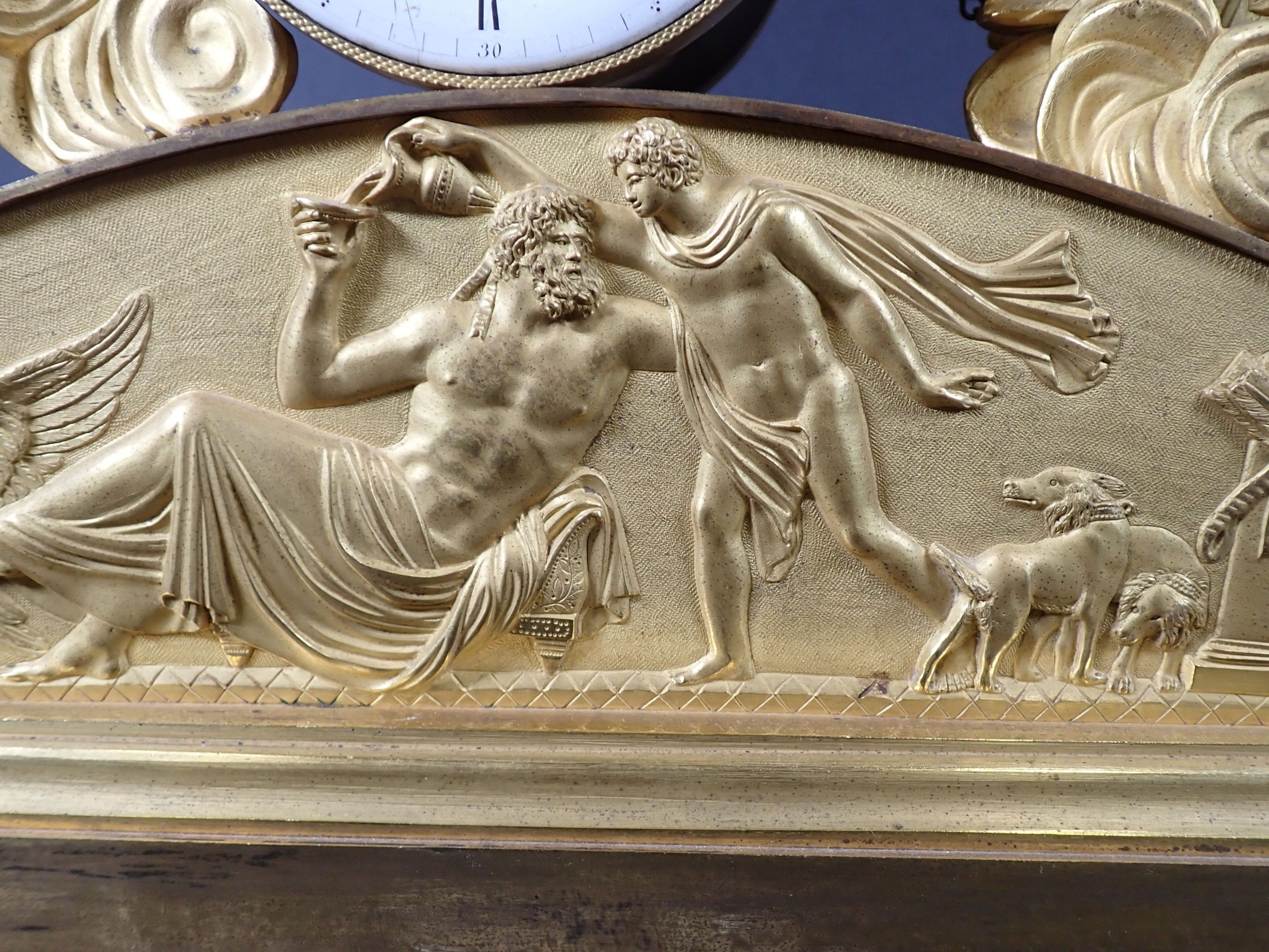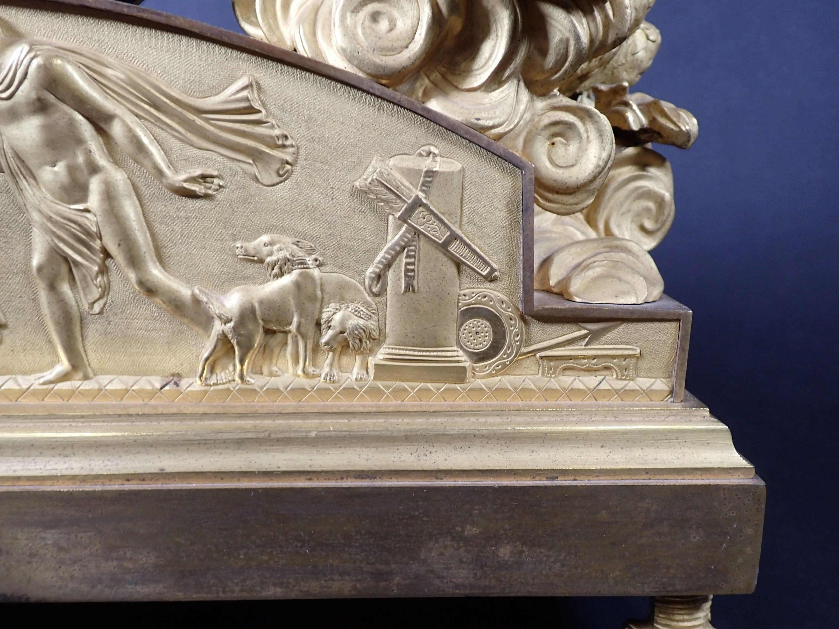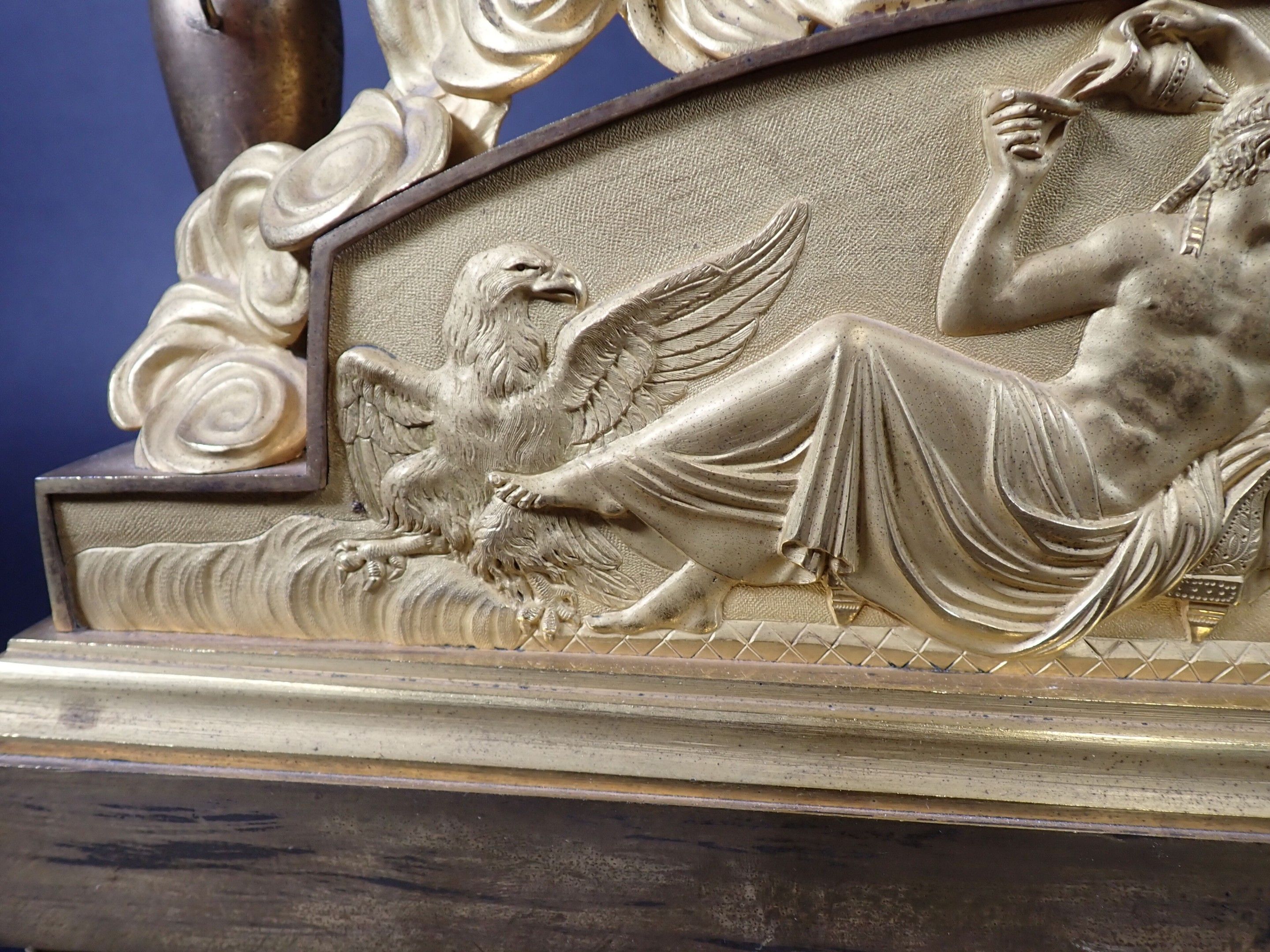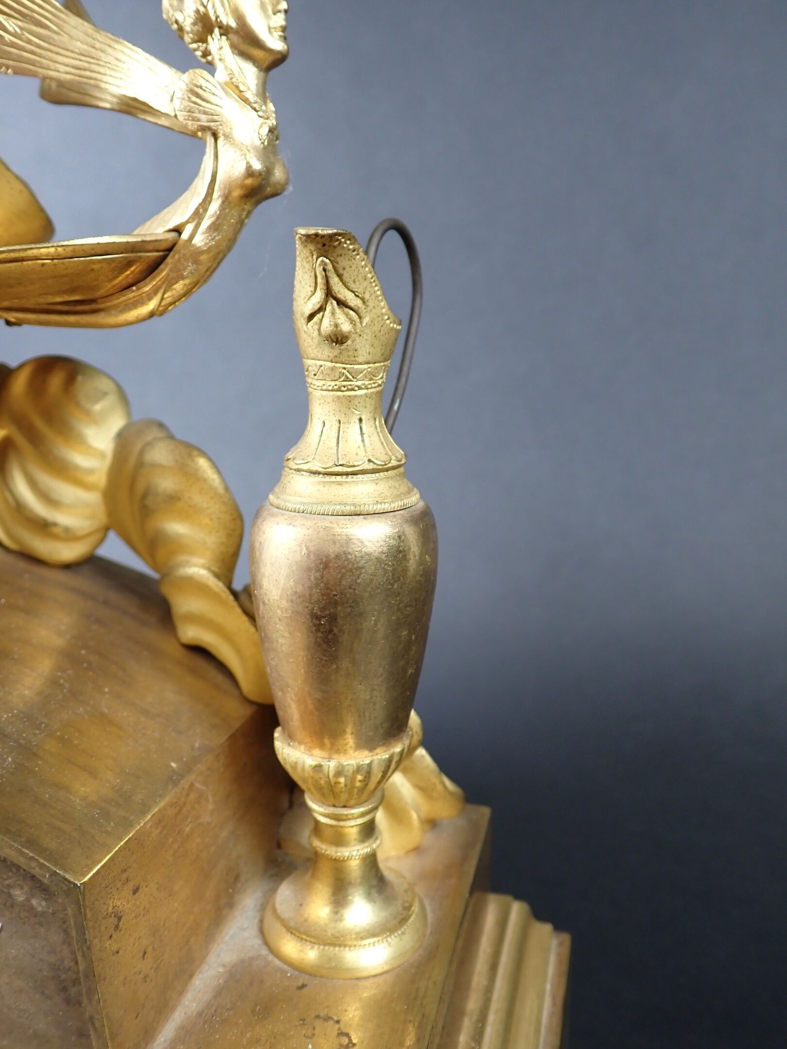 After Pierre-Philippe THOMIRE (1751-1843. Empire period gilt bronze and chased chariot clock decorated with Ganymede crossing the Heavens in Zeus' chariot drawn by two eagles. The dial with Roman numerals inscribed in the wheel, decorated with eagles, ewer and clouds as well as a bust of a winged woman. The dial and the plate of the movement signed Edmé Philibert GUYDAMOUR (1756-1799), in Paris, received master clockmaker in 1783, movement with wire with stamp and balance. Untested mechanism, in need of revision, one hand missing. The whole supported by three claws each holding a ball (missing a claw foot at the back). Height 52 cm, W. 42 cm, D. 14 cm